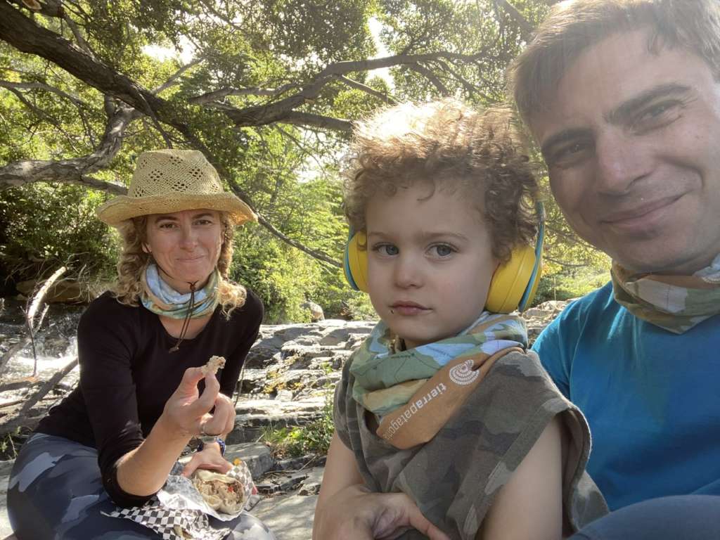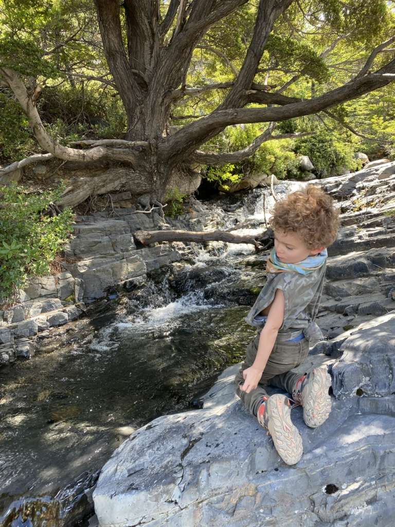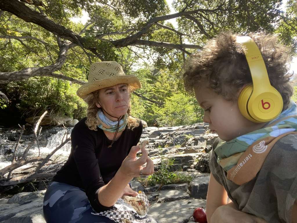 En plus de nous procurer une bonne barre de rire, ca l’occupe et il marche comme ca pendant quelques kilomètres jusqu’au pied des Cuernos, but de la ballade et halte de notre pique-nique en bord de ruisseau. On arrive à le maintenir un peu en place en lui passant une histoire grace à son casque jeune hyper hype (achat d’impulsion de papa à l’Apple store). Puis à défaut de perdre son temps à manger un sandwich qu’il trouve – à juste titre je dois avouer – pas bon, Noah s’escrimera à traverser le ruisseau dans un sens puis dans l’autre en sautant de rochers en rochers, au début sous notre air un peu inquiet, puis sous notre air résigné de parents crevés. S’il doit tomber et se tremper, ben il tombera. C’est en relevant qu’on apprend parait-il.