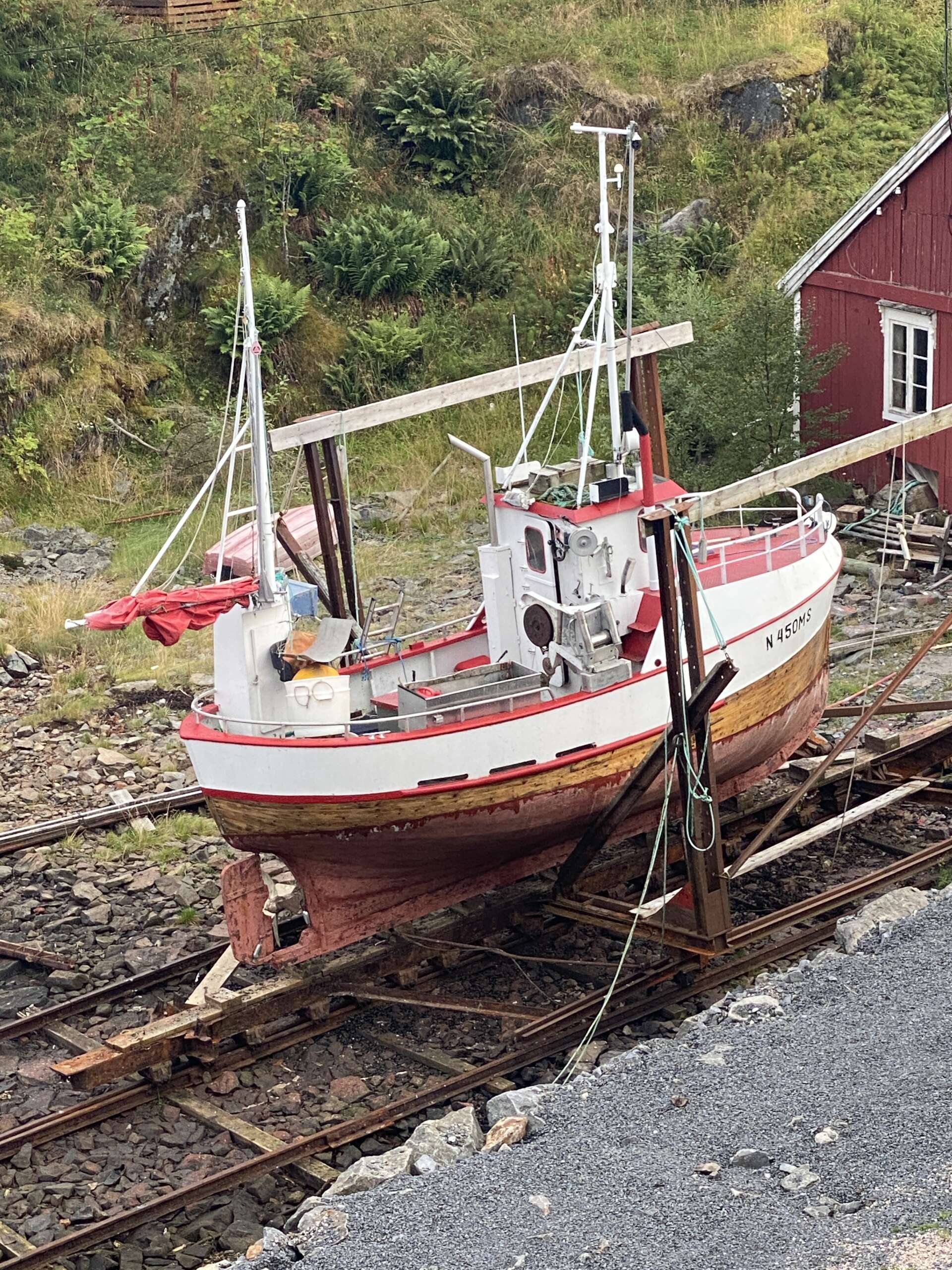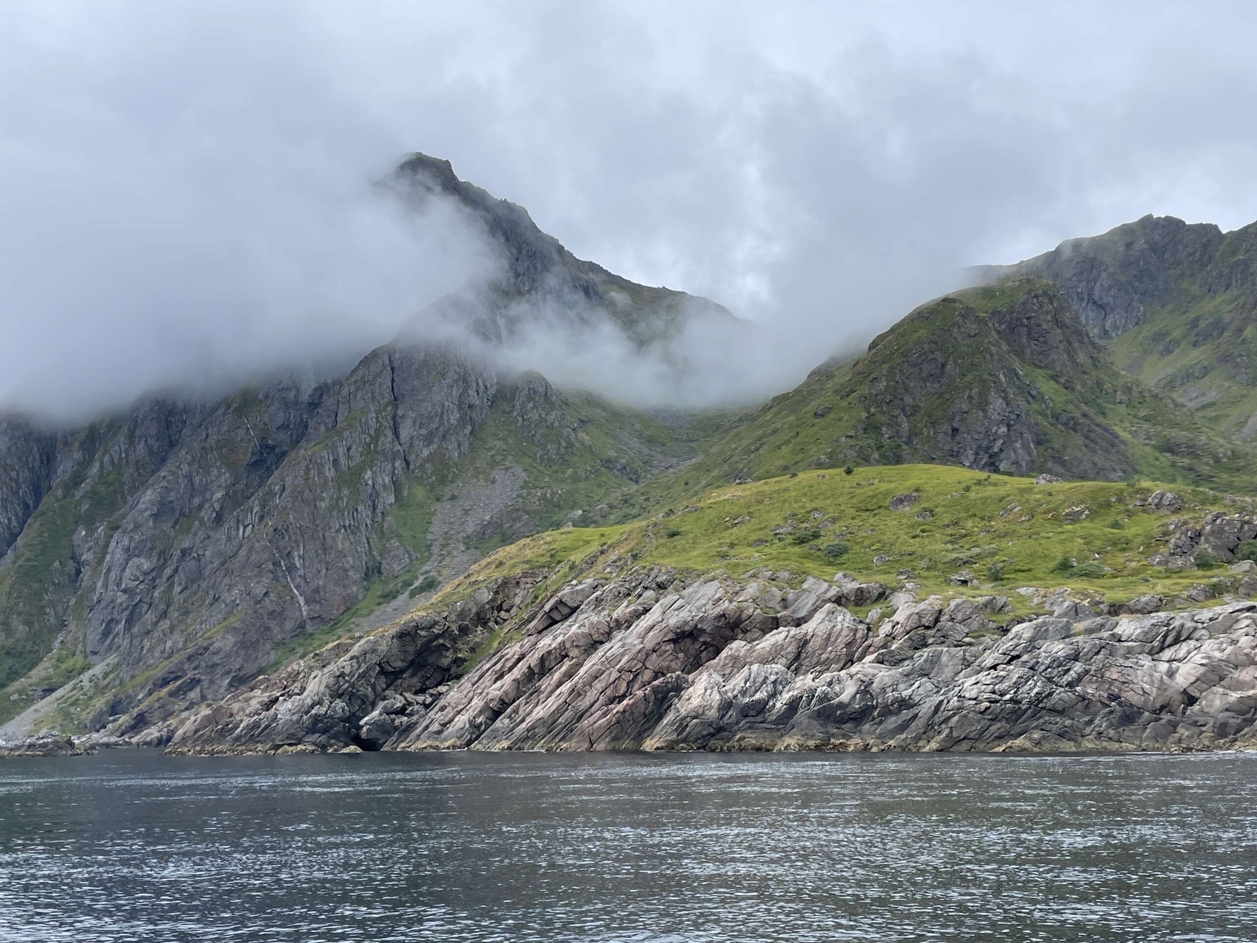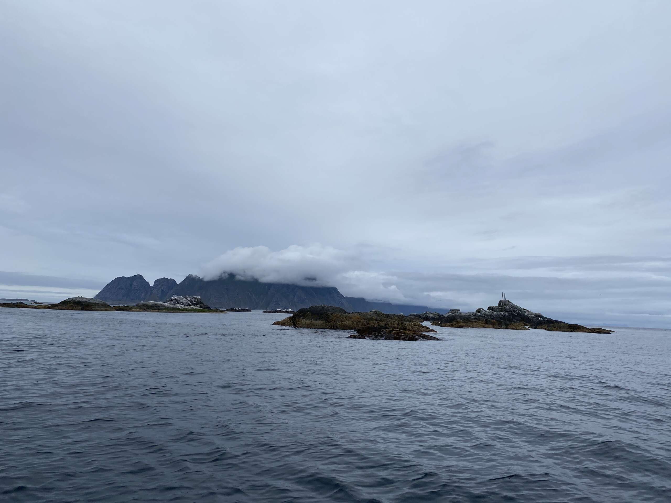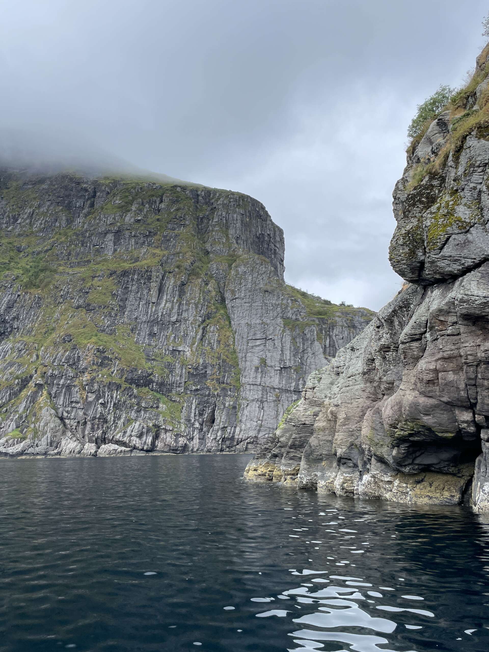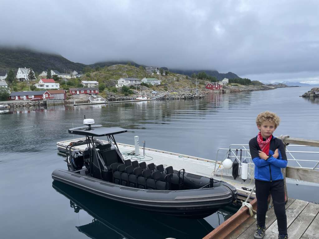 Pour se diriger vers le Maelstrom,  on suit les côtes à grande vitesse. Noah kiffe surtout quand on fait de grands virages et que le speed boat penche à 45 degrés. On s’arrête d’abord dans 2 anses qui abritaient encore jusque dans les années 20s des villages de pécheur. Avec l’avènement du bateau à moteur, le bénéfice proximité de la zone de pêche / danger pour les bateaux amarrés pendant les tempêtes n’étant plus suffisant, ils furent démontés et les maisons reconstruites dans les ports de pêche de A, Sorvagen etc… mieux protégés.