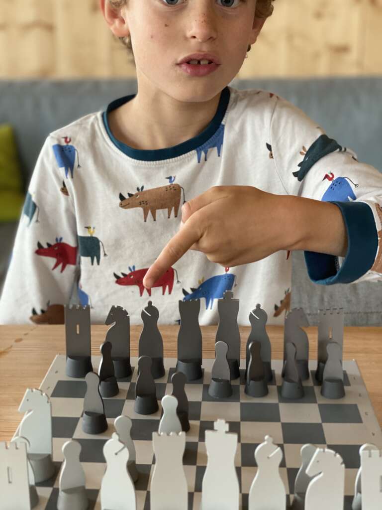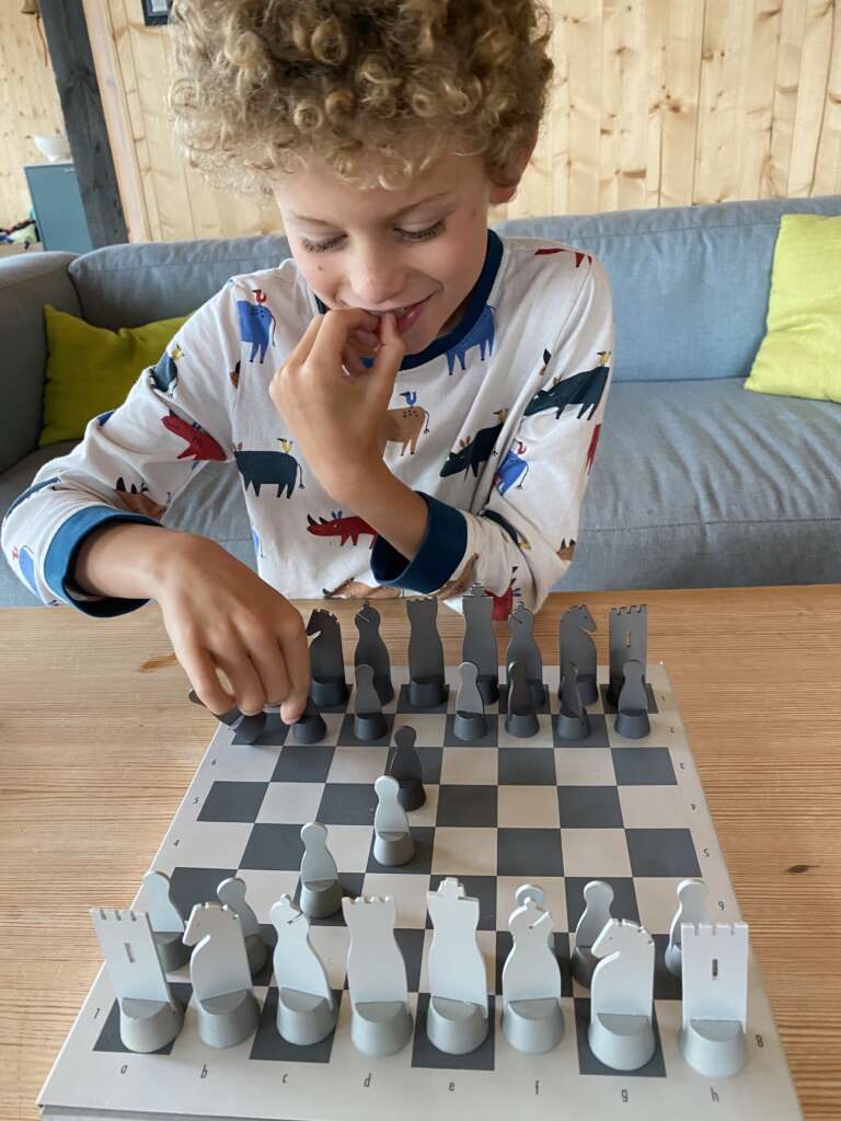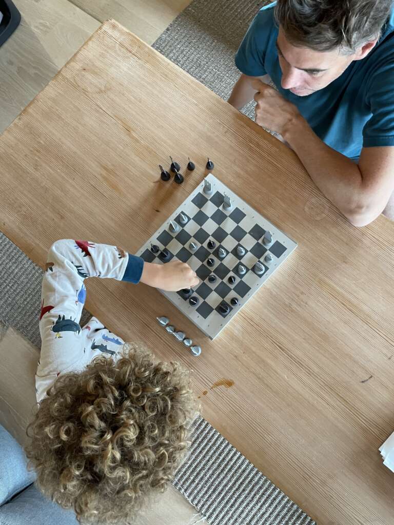 Pour cela, il doit impérativement être tout nu, donc dès qu’il rentre, on trouve invariablement une pile de fringues jetées le plus souvent absolument n’importe où et Noah enfermé 1h aux toilettes. Pourquoi aussi longtemps ? Parce que c’est un moment ou il se recentre sur lui-même. Certes le plus souvent en ayant piquer l’ipad pour faire un jeu (et donc plus il reste aux toilettes plus il joue à l’ipad), mais pas que. Parfois il classe ses cartes Pokemons, il lit un grand ABCédaire qu’il avait quand il était bébé. Et aujourd’hui, monsieur est plus stratégique, il s’est enfermé avec un jeu d’échecs.