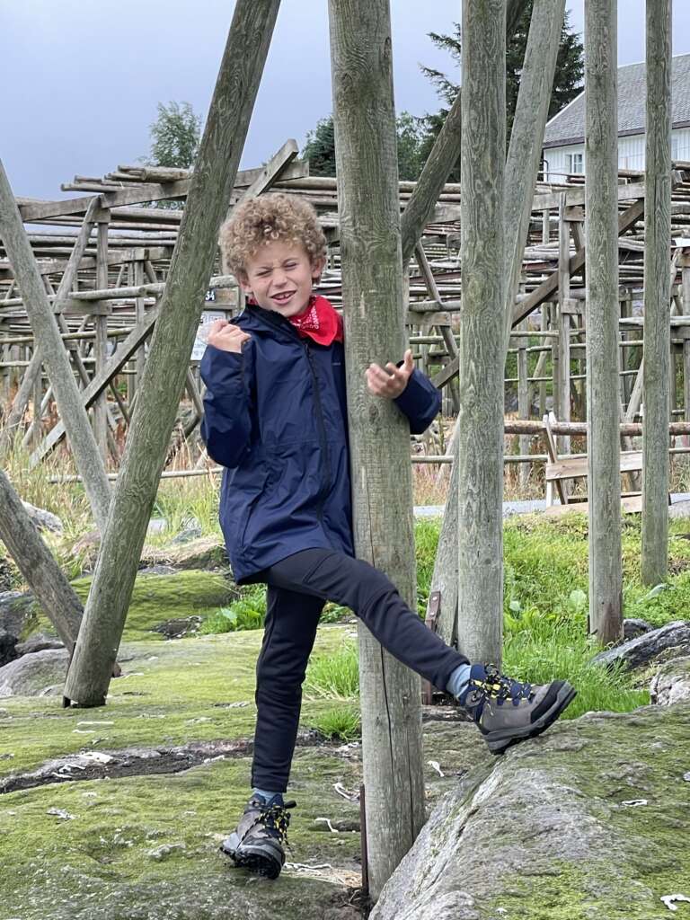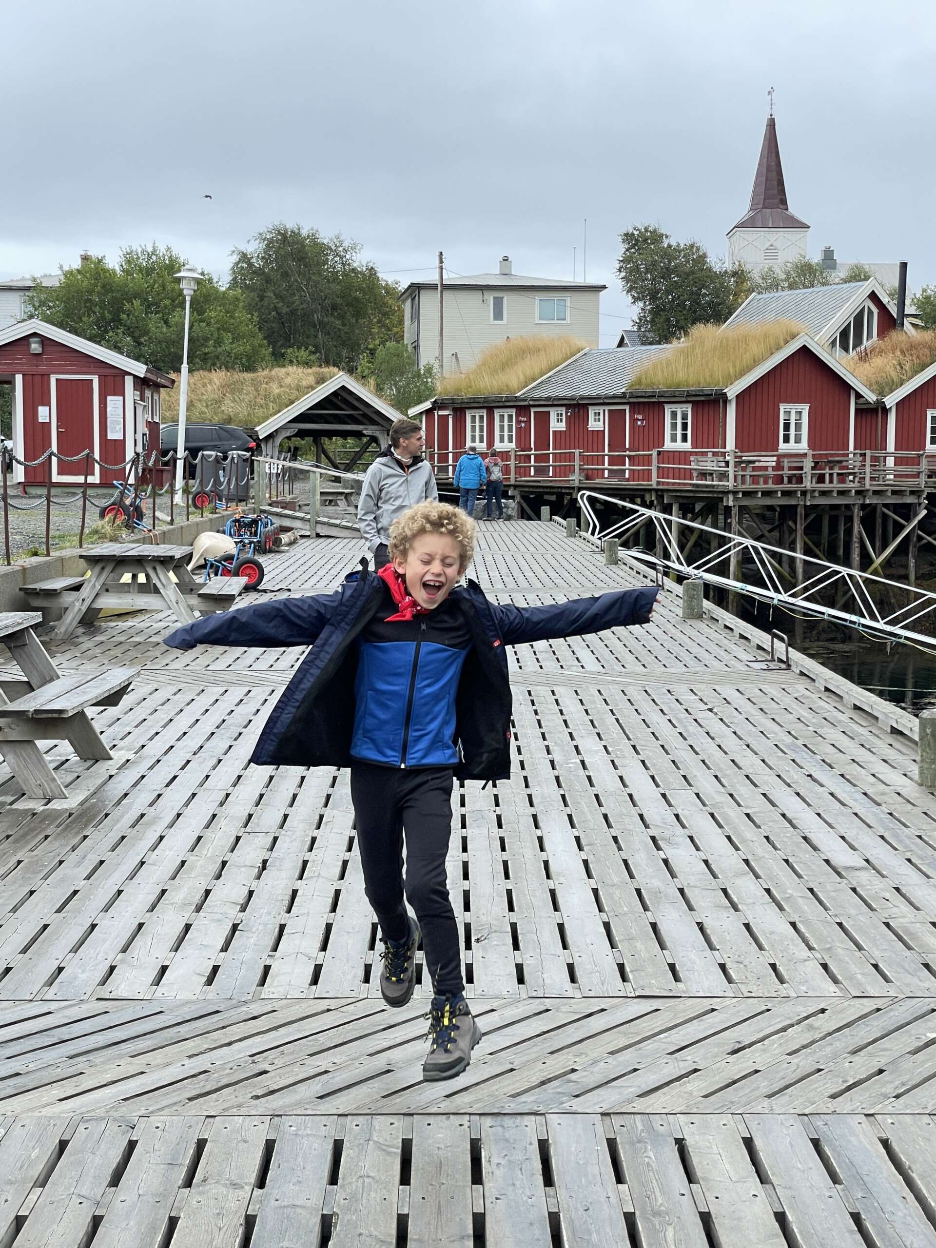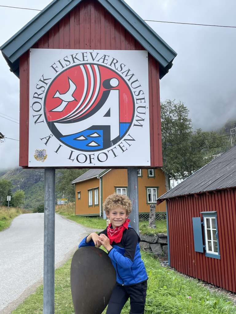 A 16h on a donc rejoint la terre ferme, direction notre nouvelle demeure pour 3 jours à mi-chemin entre A et Leknes. Mais avant il est l’heure de rectifier un petit impair de ce matin qui aurait coûté la punition de zéro ipad à Noah. Je m’explique. A la ville de A, on trouvait ne nom rigolo donc on voulait trouver une photo qui immortalisait le nom peu commun de cette ville. Sauf que austérité norvégienne oblige il n’y avait aucun panneau réellement sympa à prendre en photo pour immortaliser cela, sauf un qui s’avèrera être exactement de la couleur des fringues de Noah. Virginie avait donc voulu que Noah prenne la pose ce qu’il avait ostensiblement refusé, et qui lui avait vallut la promesse de la dite punition. Maintenant que Noah est dans un “good mood” (ou qu’il souhaite lever la punition) on se reidirge vers A avec un détour de 15 minutes dans chaque sens pour prendre la dîte photo.