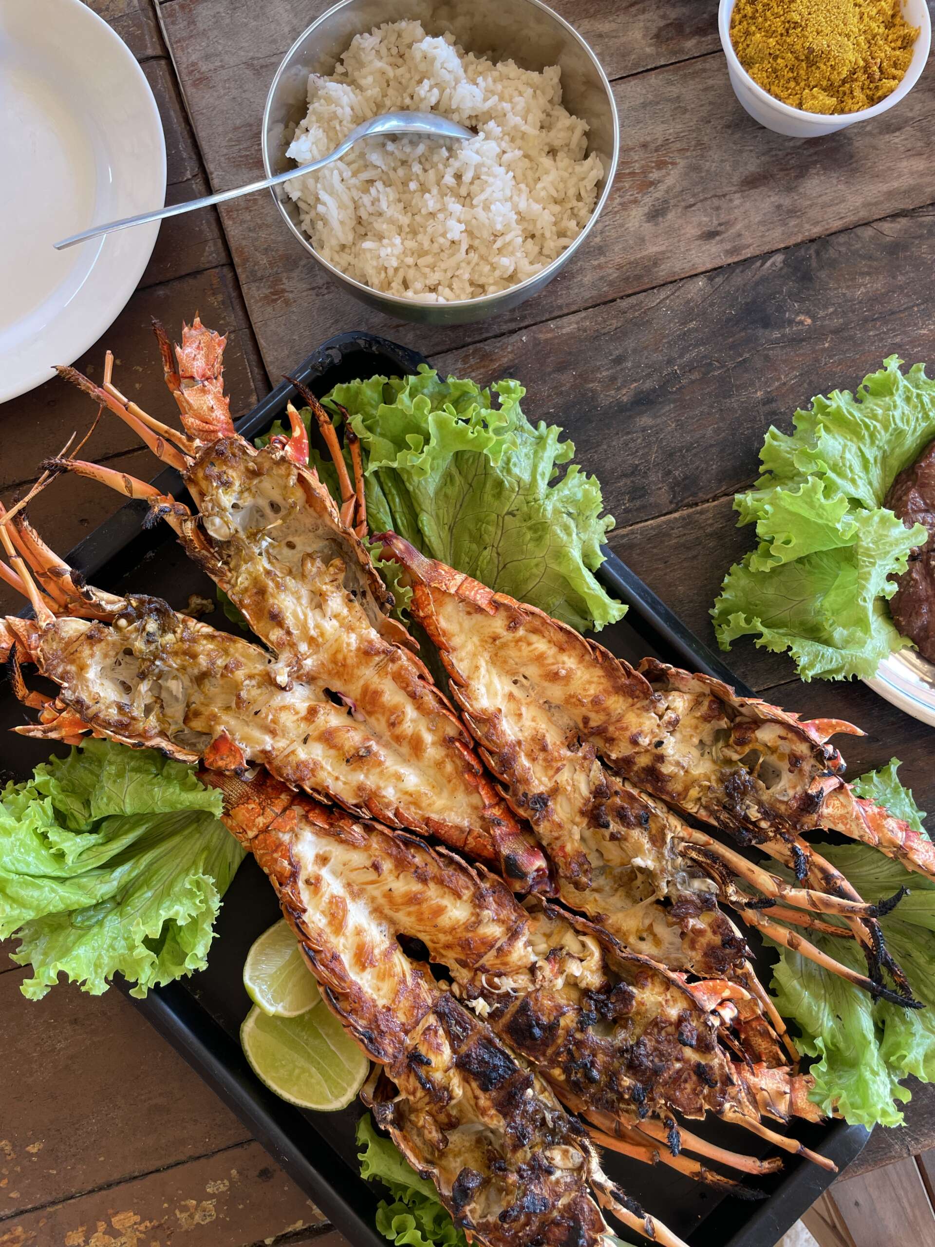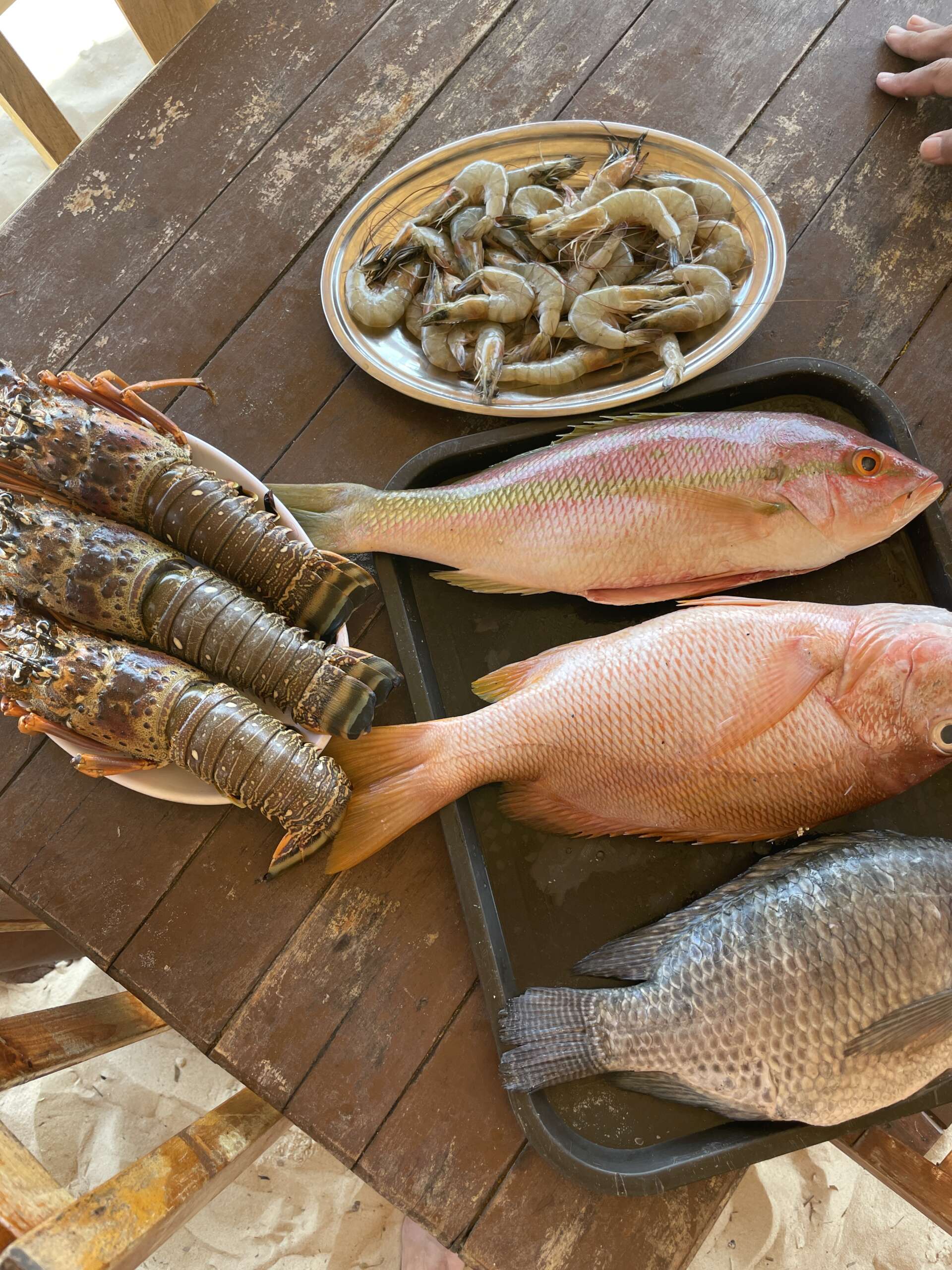 La proposition de menu, à la paillotte Lucas est alléchante. Ils nous apportent les poissons et langoustines entières ; On choisit ce qu’on va manger ; on part se baigner ; et 40 minutes après, place à la dégustation.