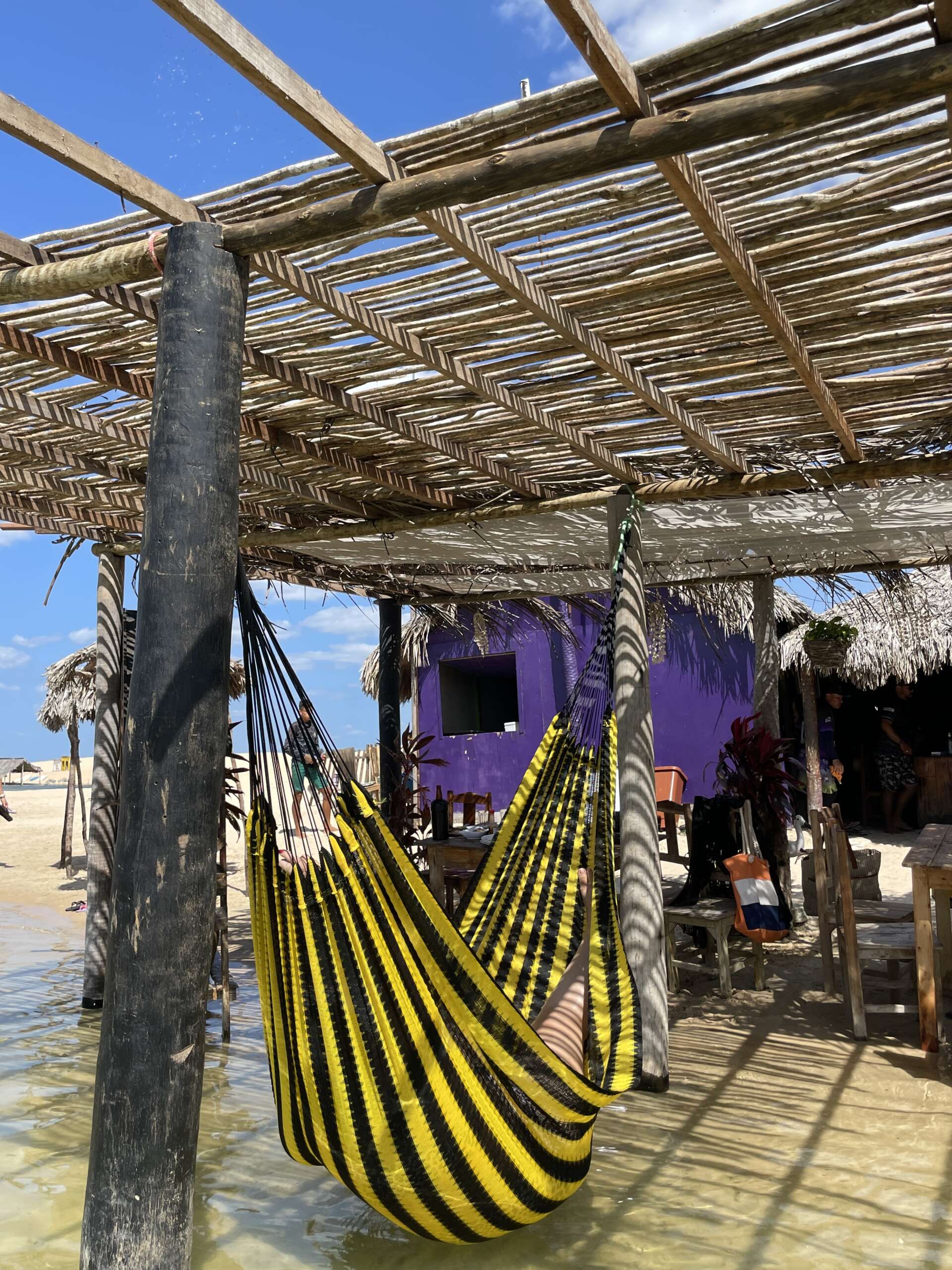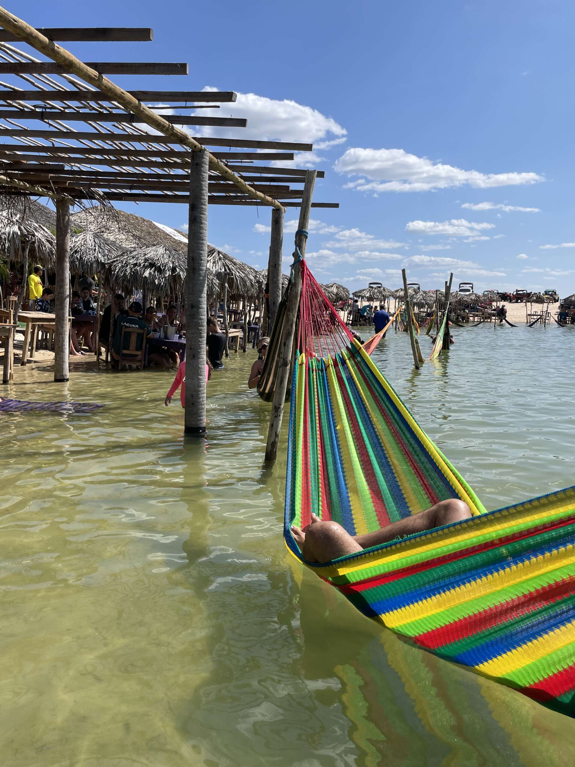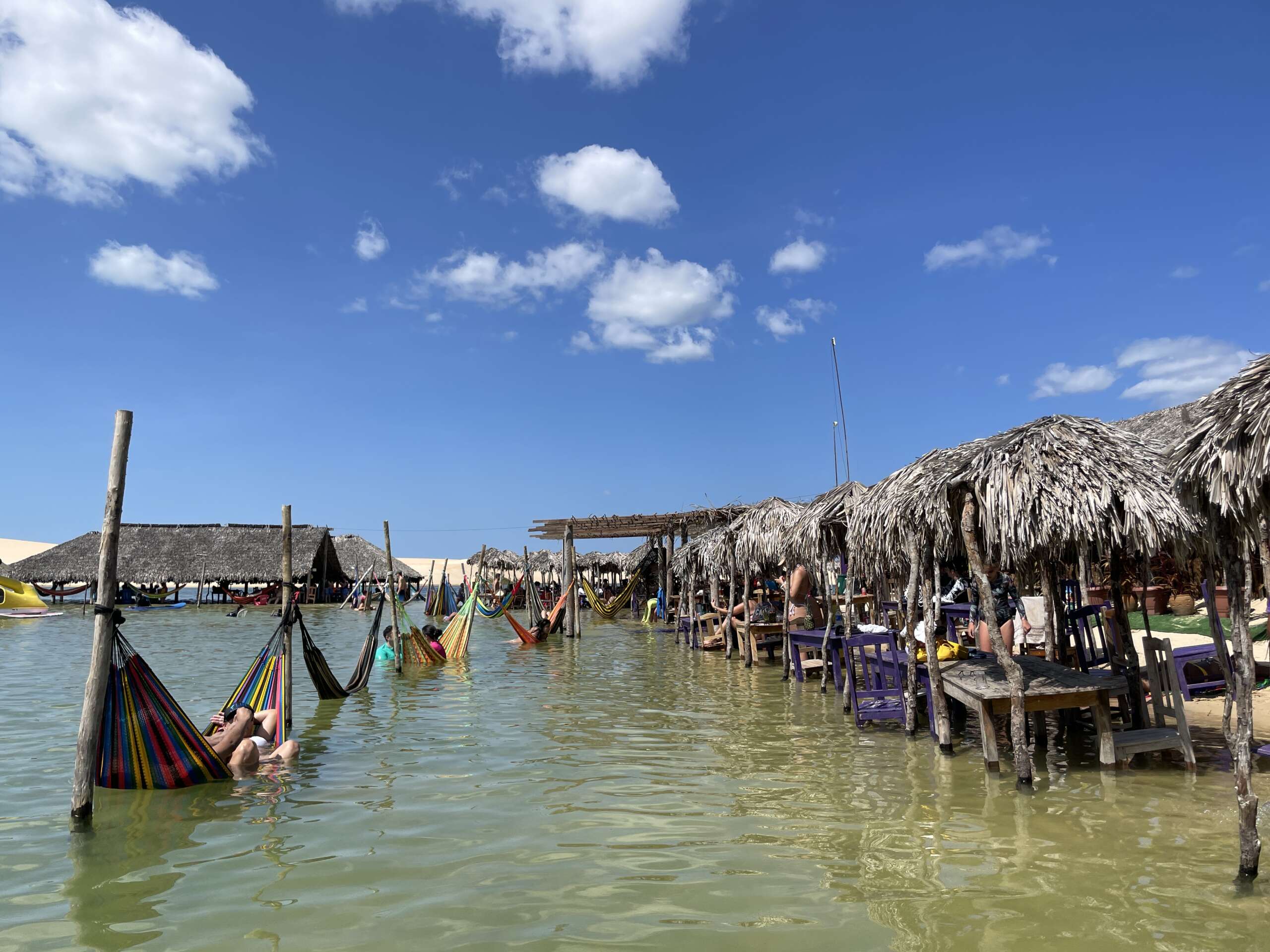A la laguna grande, dans un cadre magnifique, ont poussé quelques paillottes pour se restaurer. Ca enlève certes un peu la magie du lagon immaculé, mais aussi ça te fait vivre la vie des brésiliens. Comme à chaque fois, tu as des hamacs, des tables et des chaises à ¾ immergés. Au bord e la lagune, tous les modes de transport pour arriver à la lagune se côtoient.