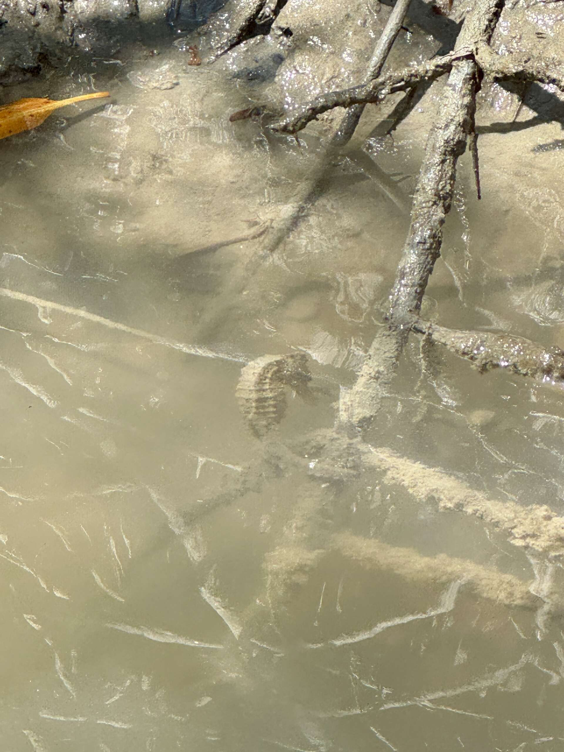 On embarque donc à 8 dans une pirogue et on se dirige vers la mangrove. Apparemment, l’hippocampe ici vit entre les racines des mangroves. On a plutôt de la chance c’est marée basse, ils sont plus faciles à repérer apparemment.