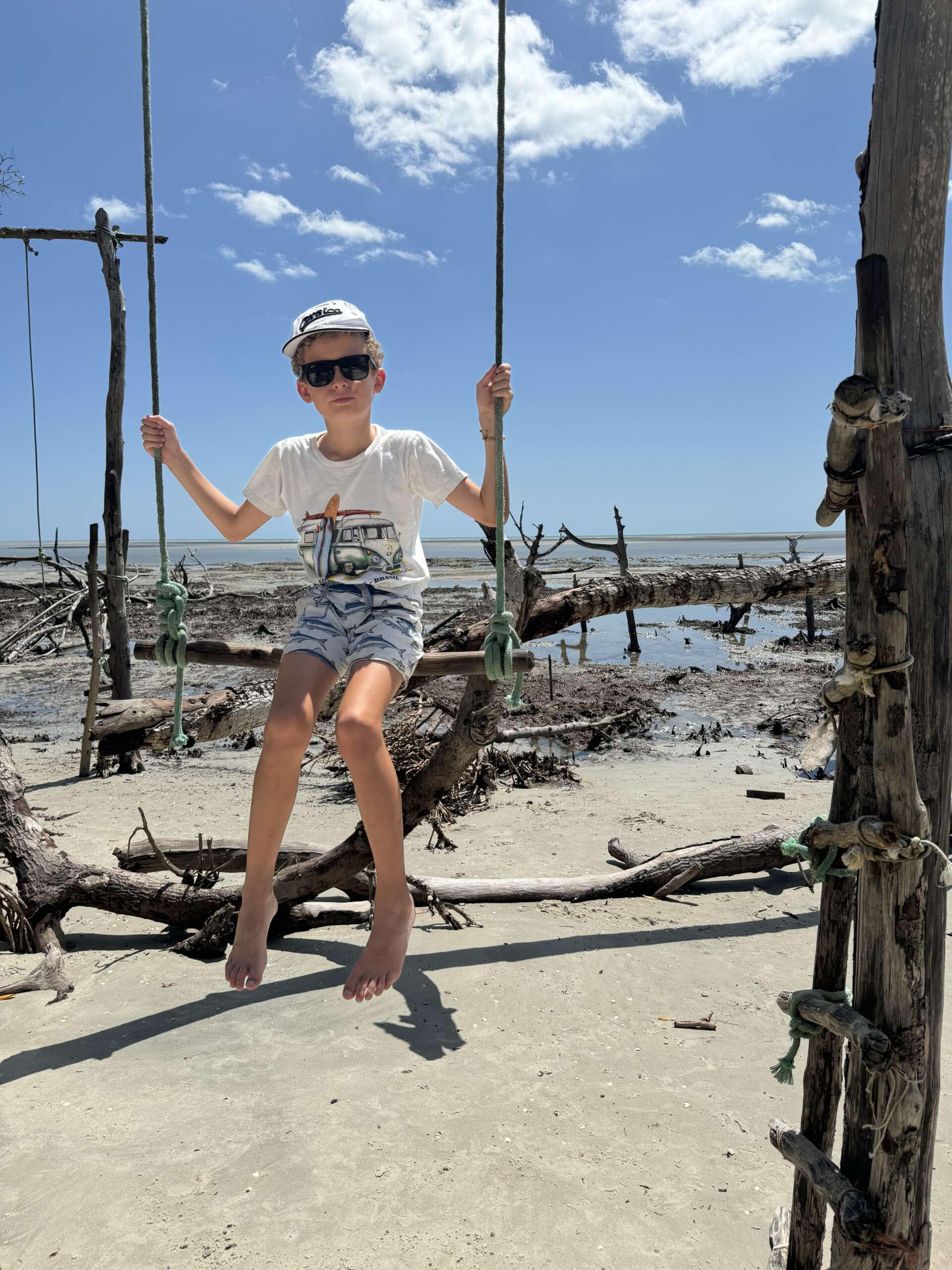On reprend la route, et rapidement on se fait un petit stop bucolique dans une forêt de palétuviers pétrifiés (la mer s’est retirée ici avec le temps à plus de 500 mètres de là, et pour une raison que je n’ai pas élucidée, ils se sont davantage fossilisés que décomposés. Dans ce paysage de fin du monde, ils ont accroché des balançoires et autres agrès très photogéniques. Bon, nous c’était moyen parce que le matin c’est soleil en pleine figure, mais à d’autres moments de la journée c’est sûrement encore mieux.