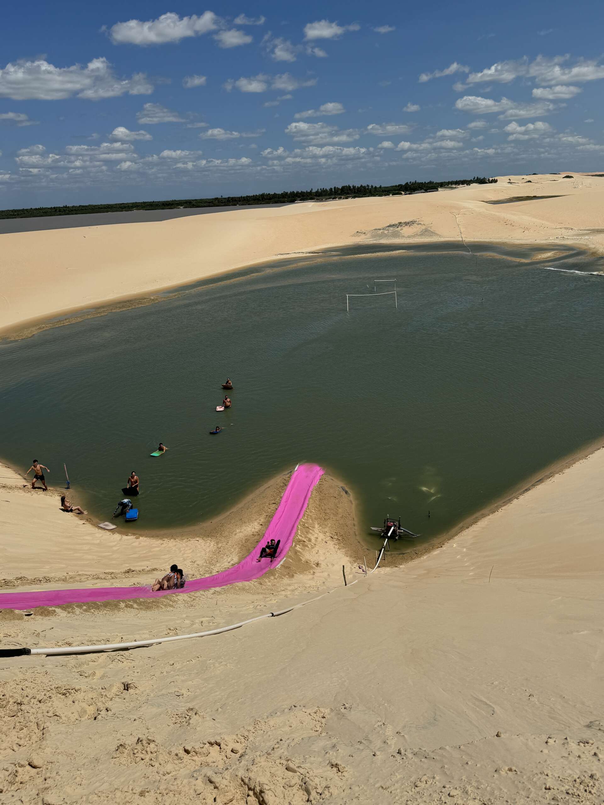 En haut d’une pente on découvre juste avant d’arriver à la laguna grande, une petite attraction rigolote davantage pour les locaux que pour les touristes d’ailleurs. Utilisant un autre de ces lagons d’eau douce enchâssé dans les dunes, ils ont installé un toboggan gigantesque de 40 mètres de haut environ te permettant de dévaler la dune tête la première allongé sur un surf. Tu te retrouves ainsi à surfer à pleine vitesse sur la lagune. Un but de foot en bois au milieu du lagon indique la distance à battre pour avoir droit à un tour gratuit. Marrant, mais on n’a pas osé essayer en fait.