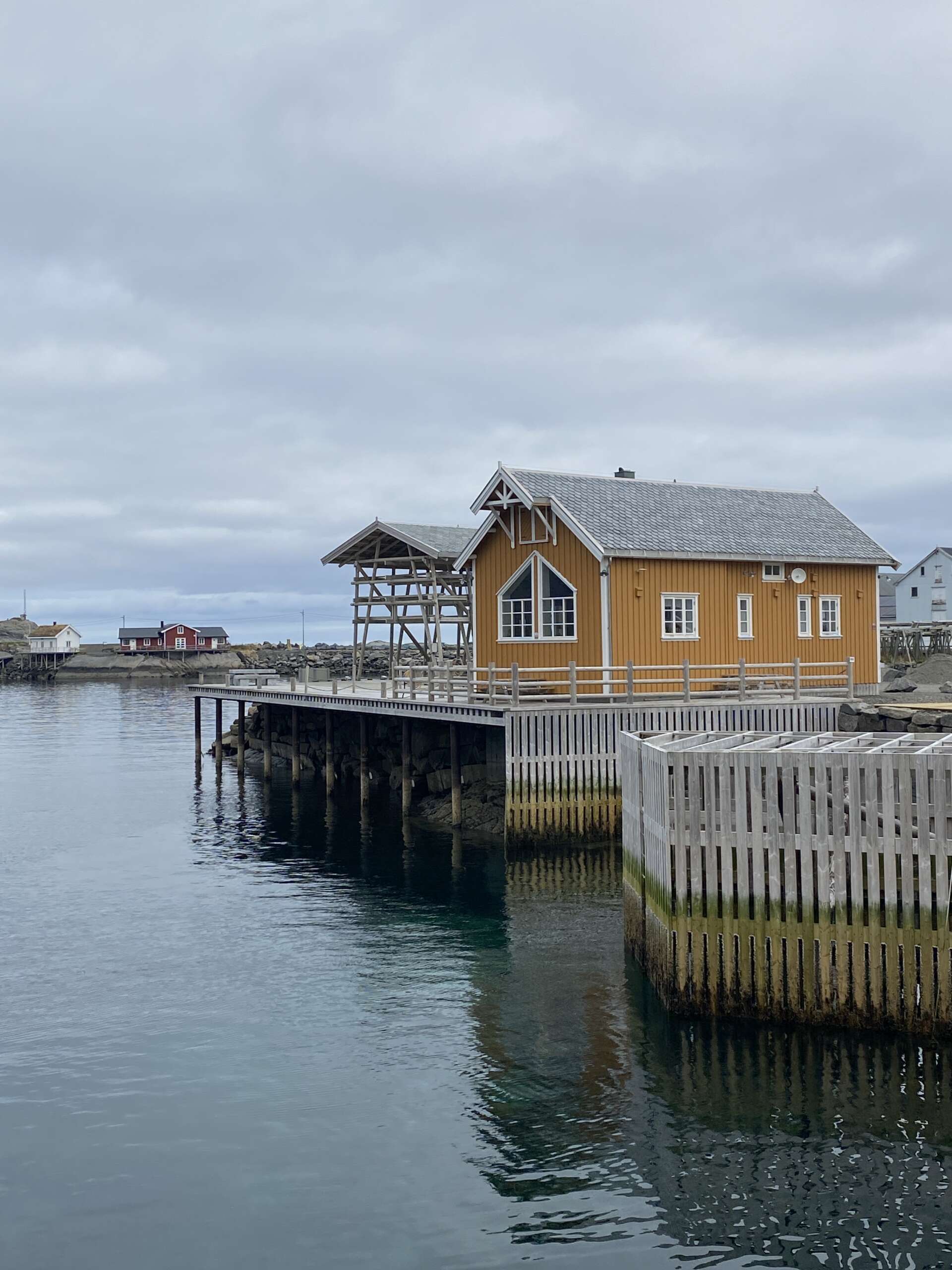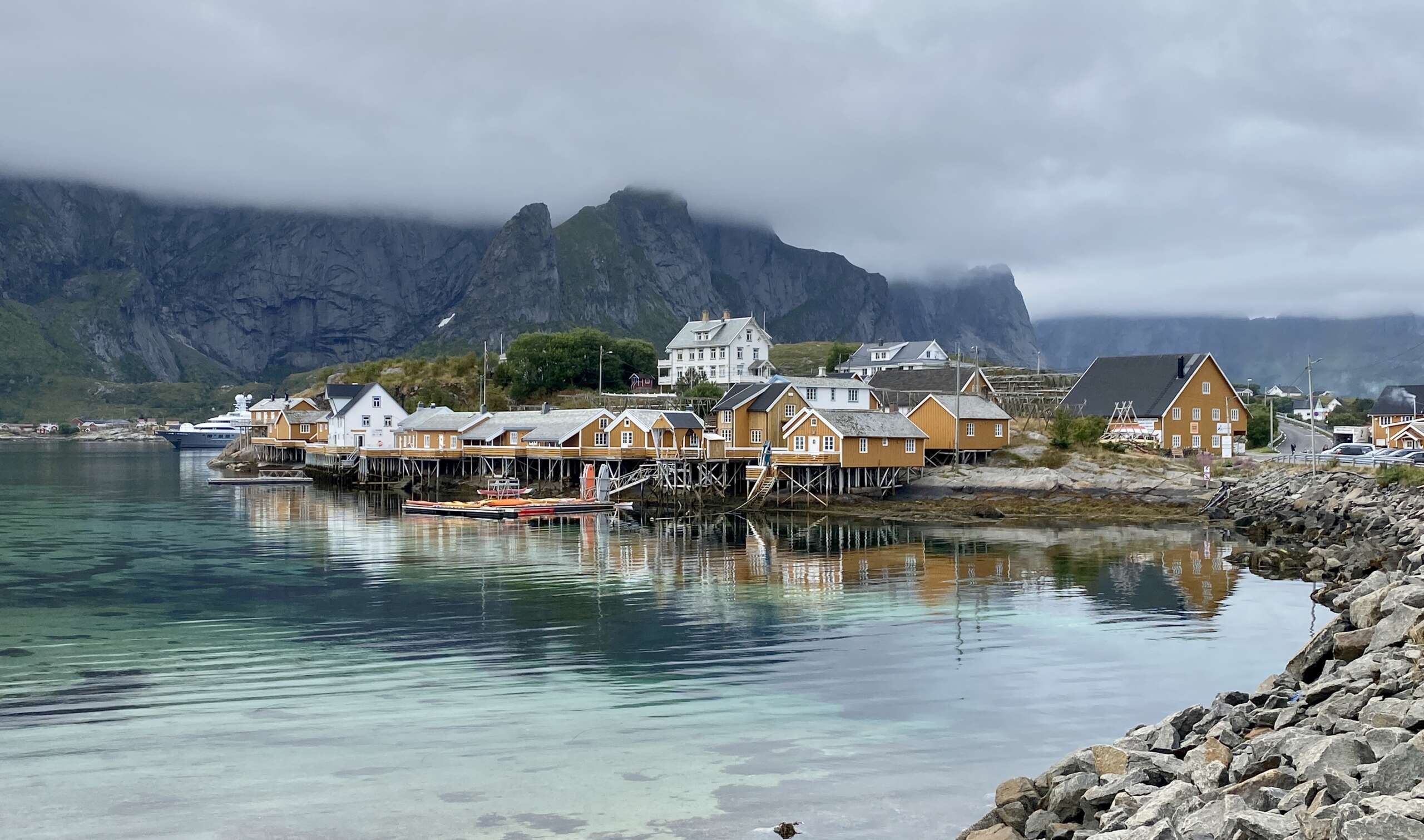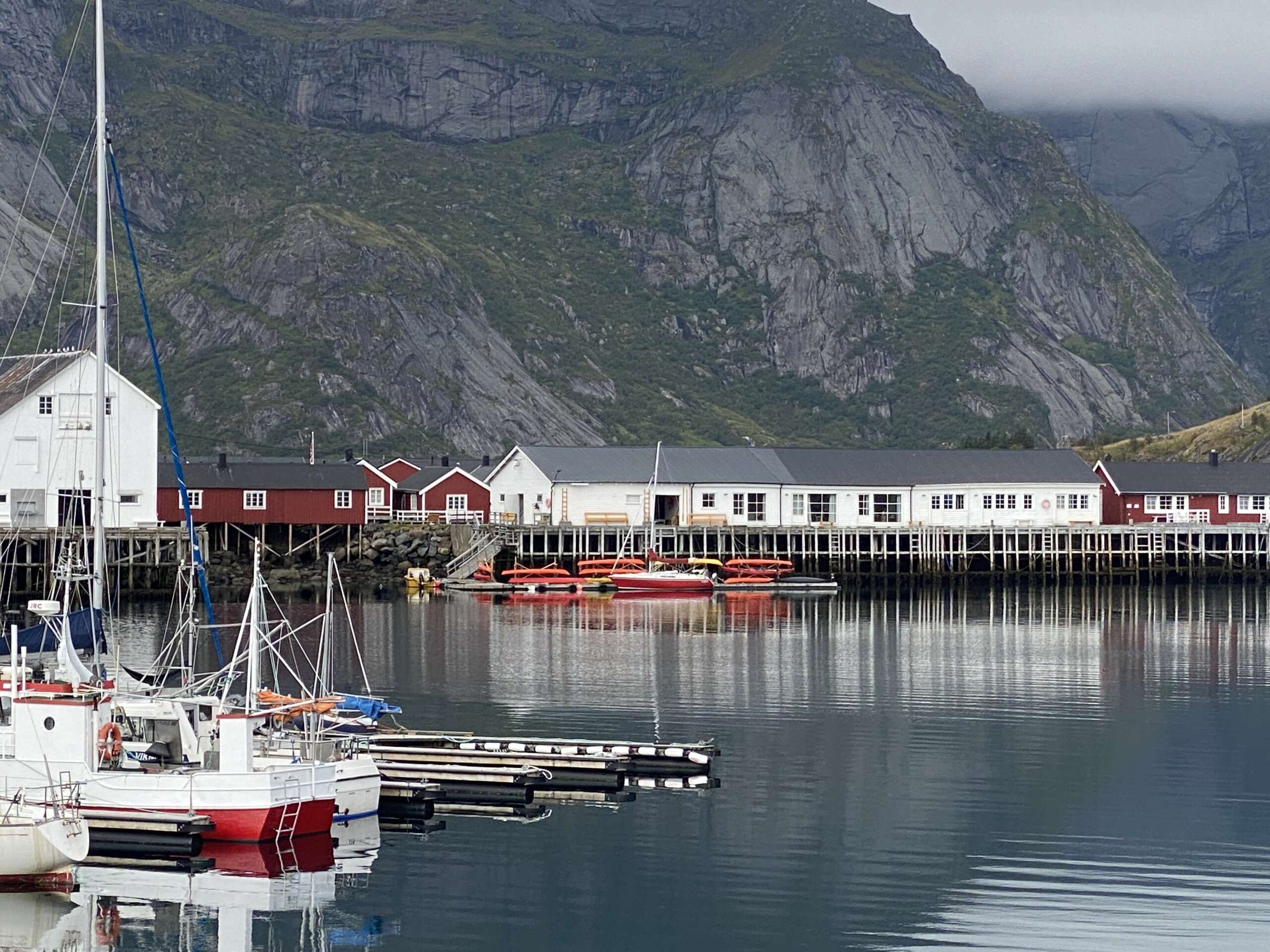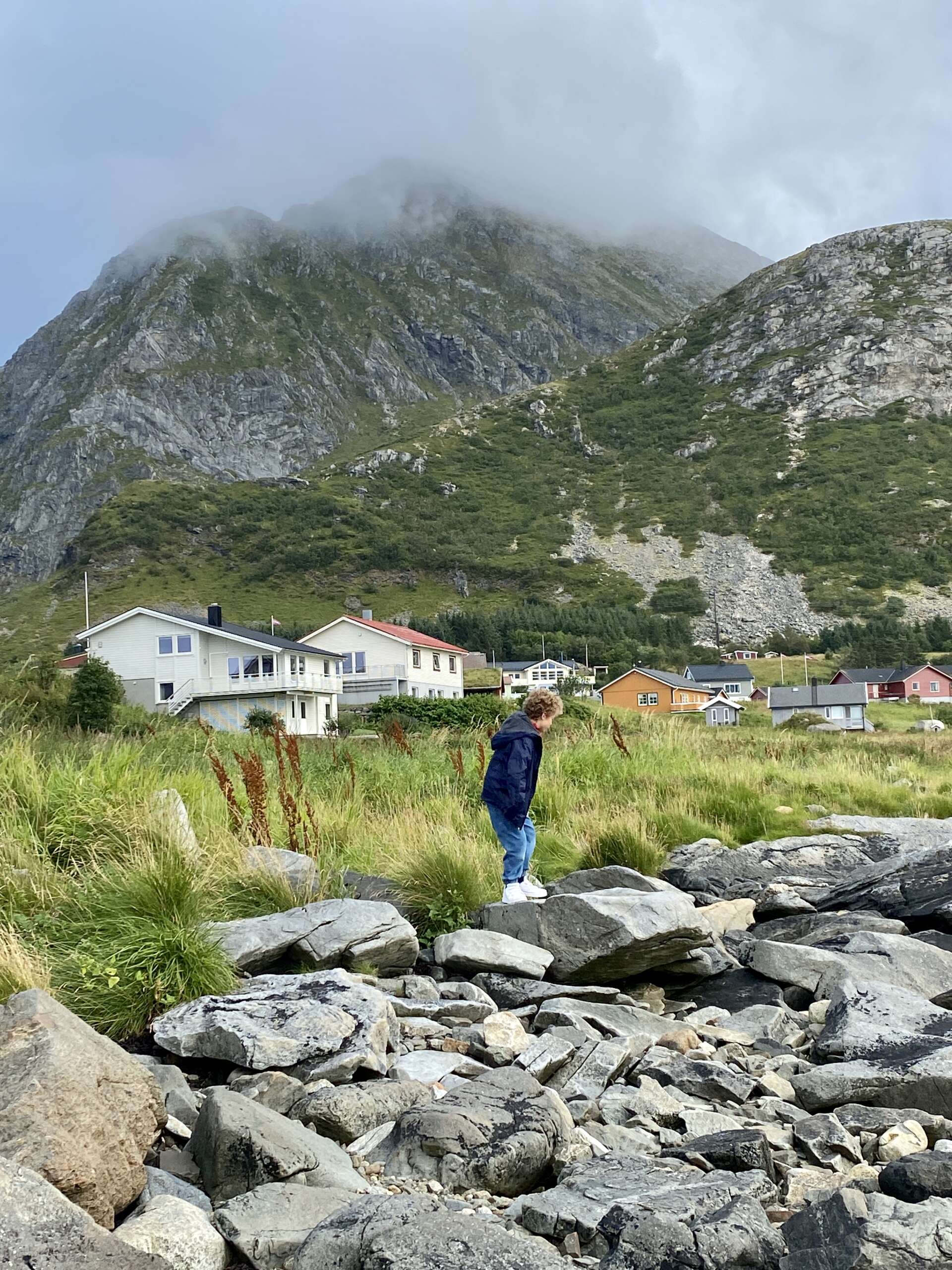 On profite donc de la maison jusqu’à 11h, Noah vacant à ses occupations musicales tandis qu’on vaque aux nôtres, et nous voici partis, après un bon petit déjeuner à la maison dominant tout le fjord vers le sud, à la découverte des 2 petits villages de Hamnoy et Sakrisoy.