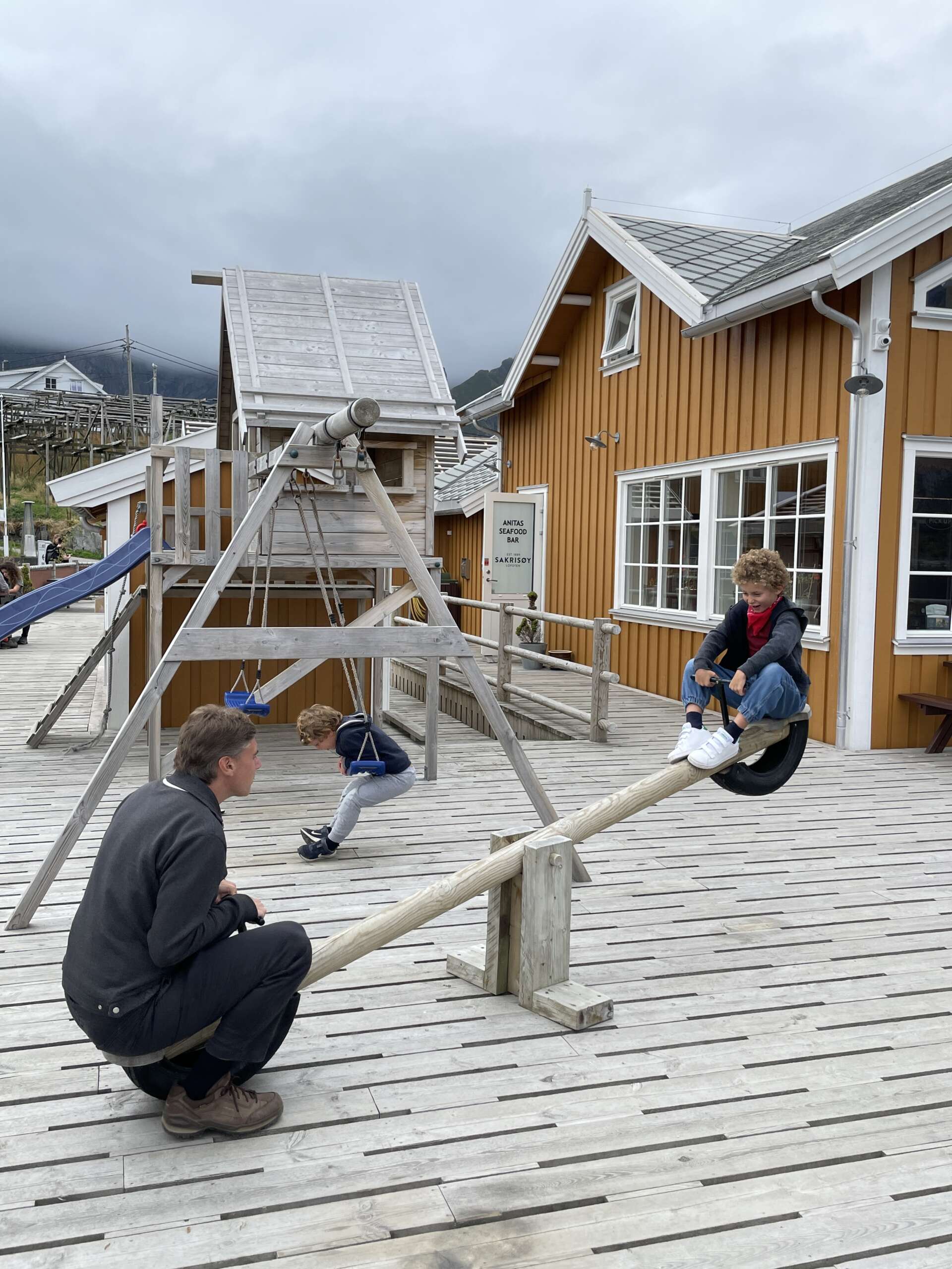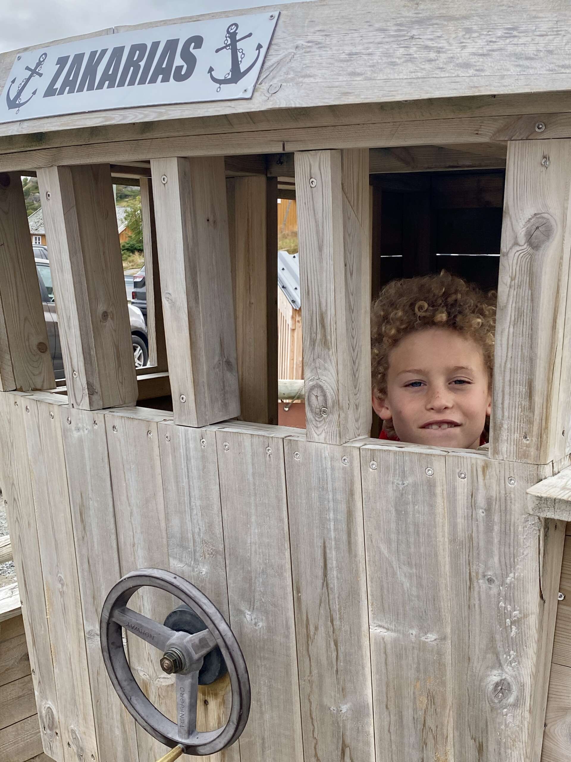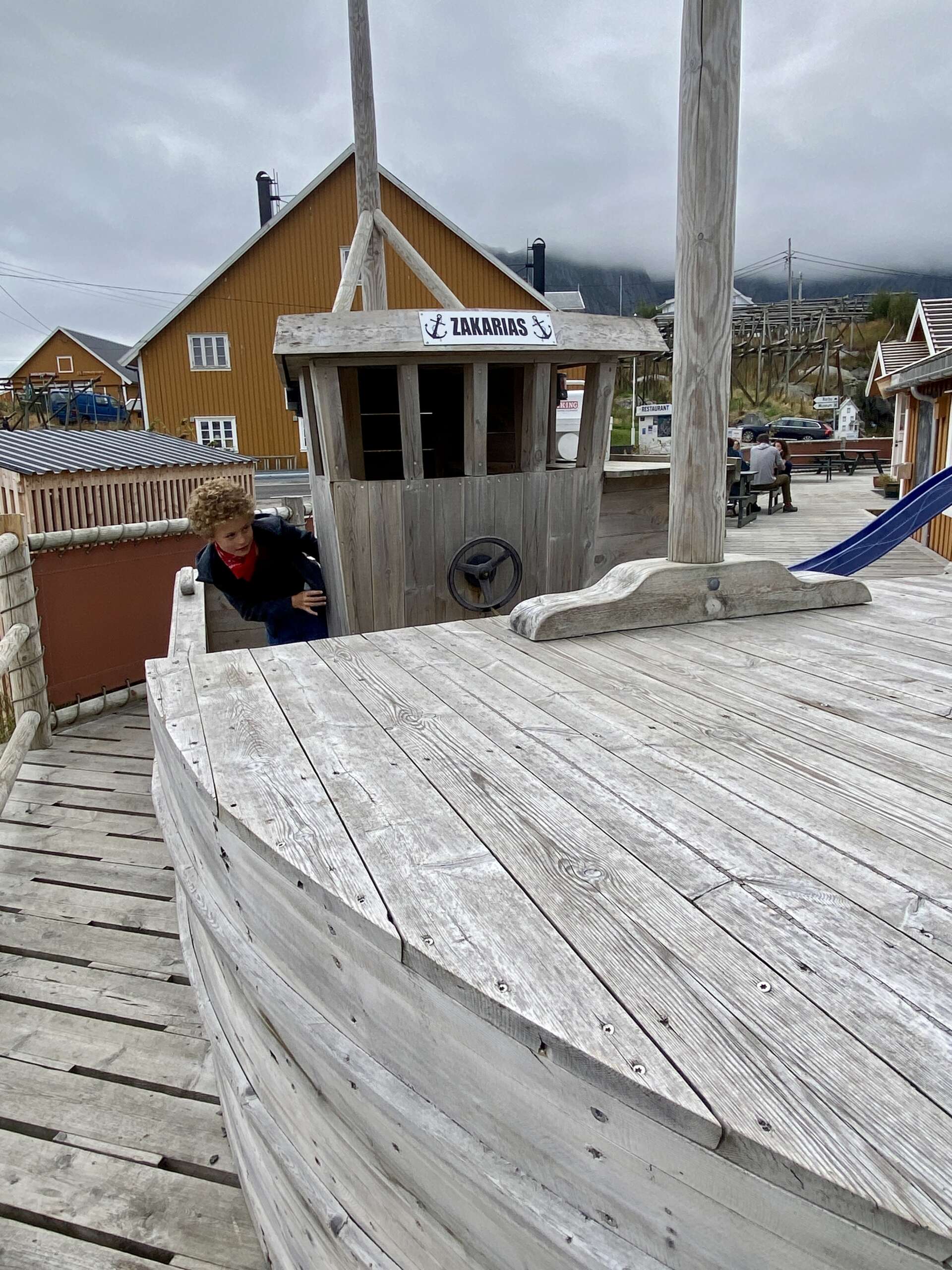 Noah entre temps a picoré comme un oiseau et est parti s’amuser sur une aire de jeux à l’esprit Viking (il y a un bateau de pêche en bois très joli).