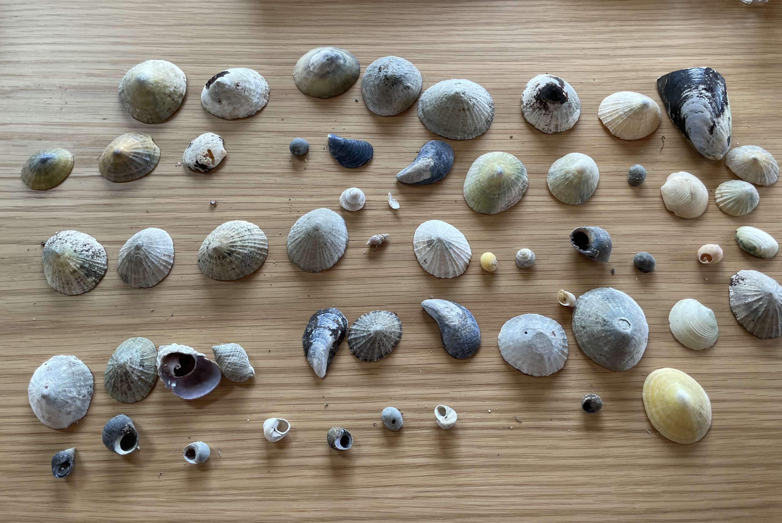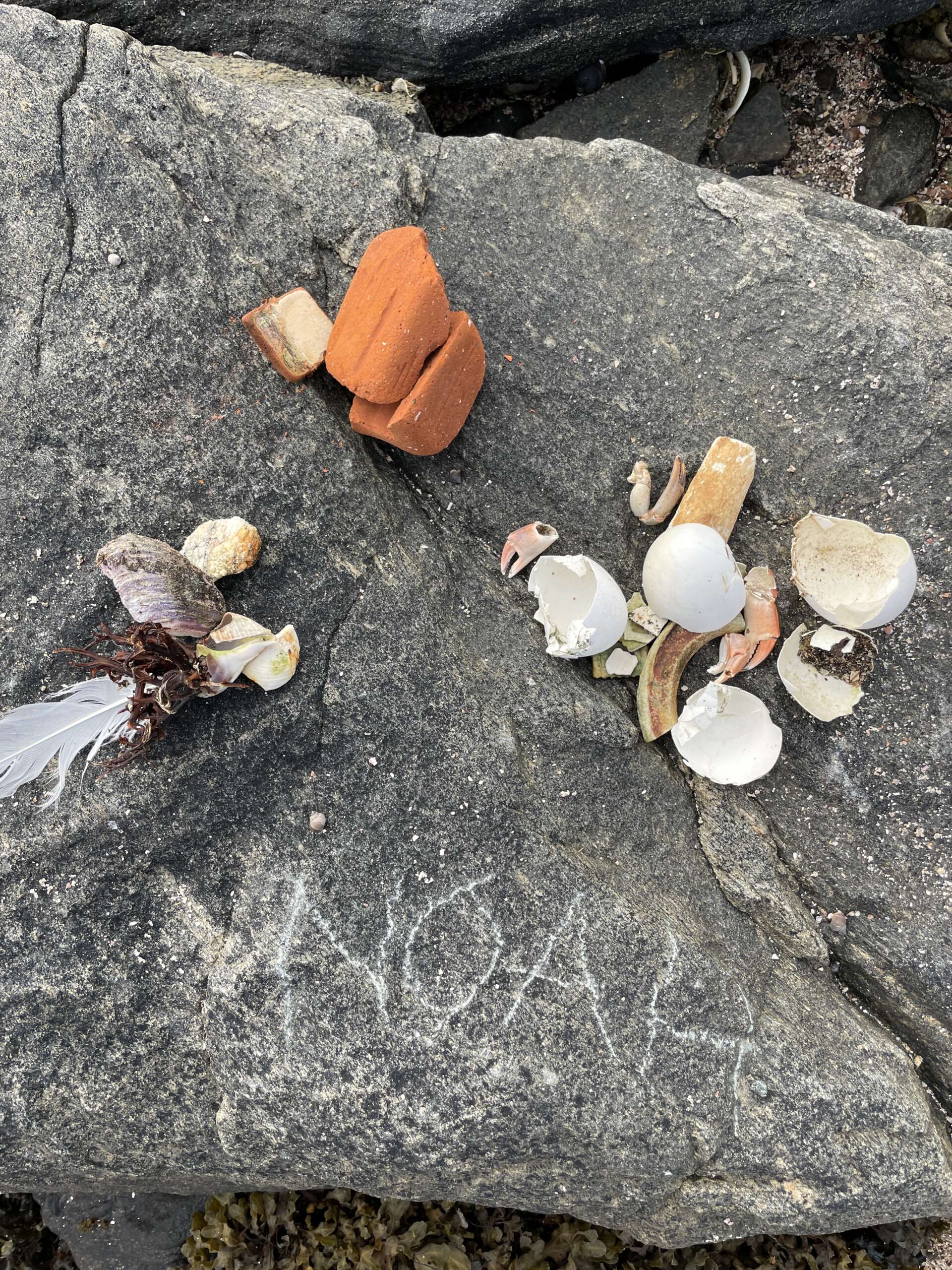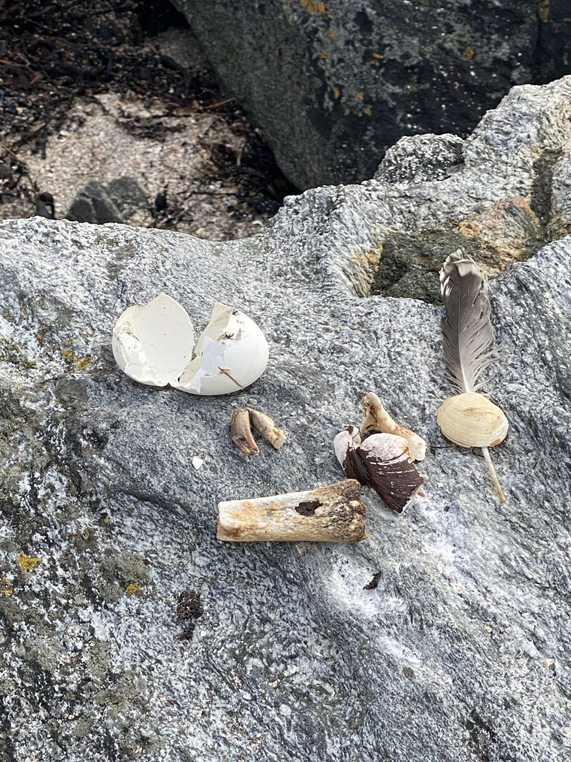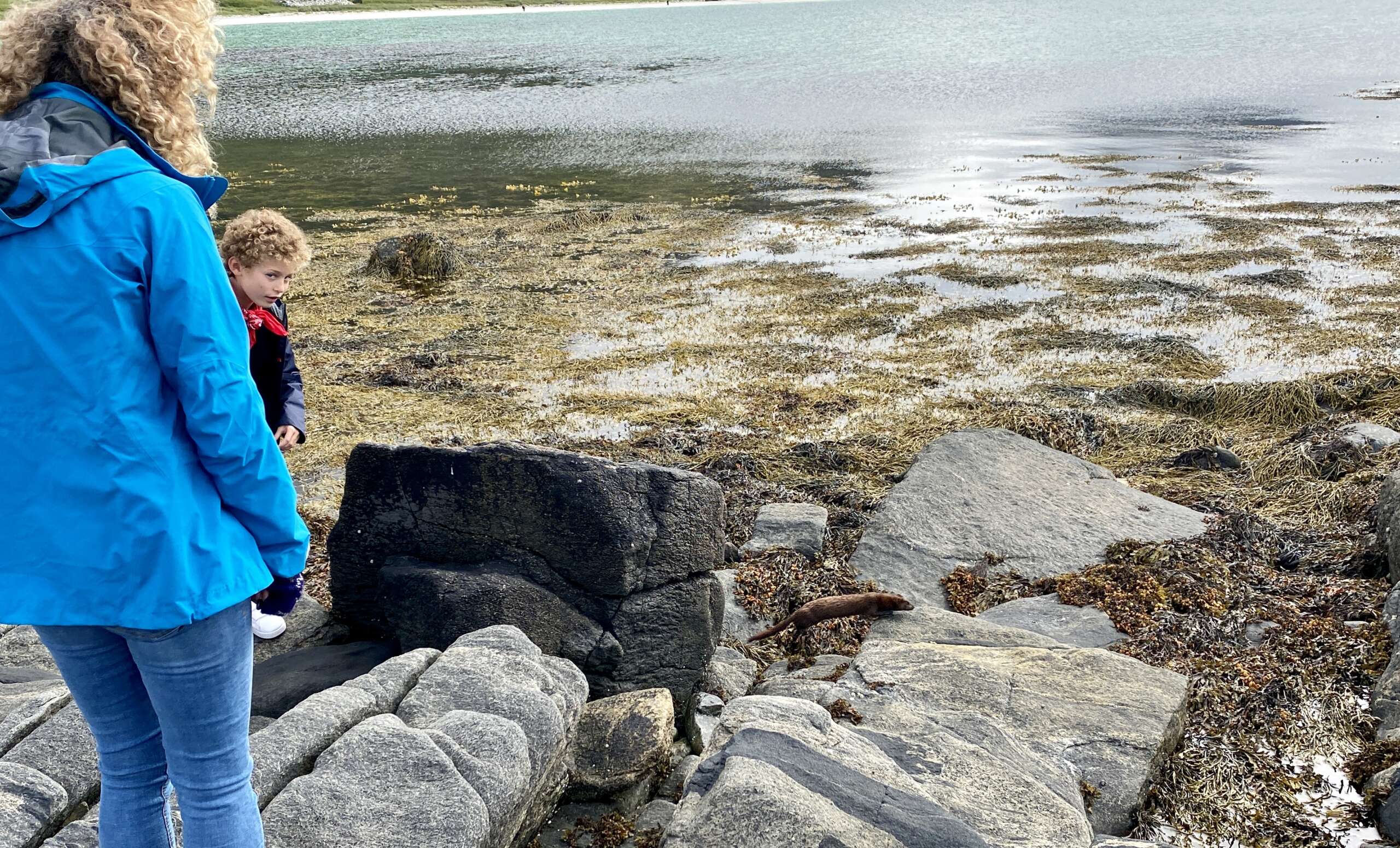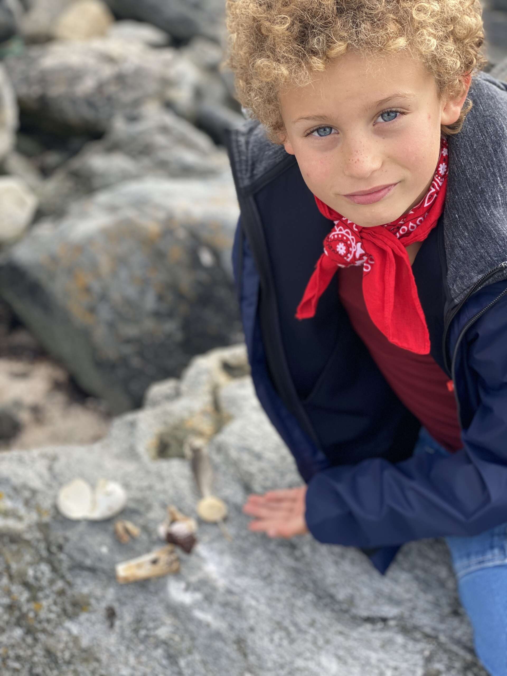 Comme on a bien pris notre temps, il est 14h passé et on décide comme le temps se lève d’aller sur la plage de sable blanc de Ramberg à 5 minutes de notre maison. A peine arrivés, Noah se précipite sur la zone des rochers et il va se constituer avec Virginie une gigantesque collection de coquillages, œufs d’oiseaux, algues et autres objets marins. Chacun est classifié, dénombré et méticuleusement déposé sur un rocher qui sert de présentoir. Cette petite activité dure une bonne heure et ne sera interrompue qu’à la faveur d’une marte qui se trouve aussi surprise que nous de nous trouver là. Après une petite partie de cache-cache avec Noah elle finira par s’évanouir dans les herbes hautes qui bordent la plage.