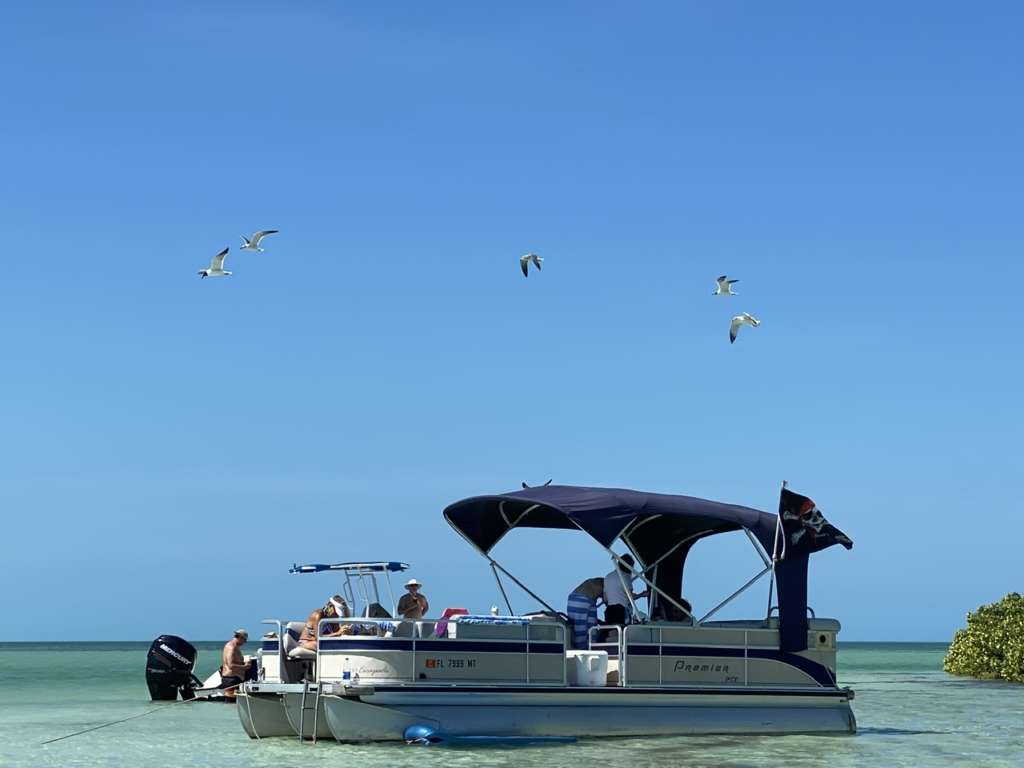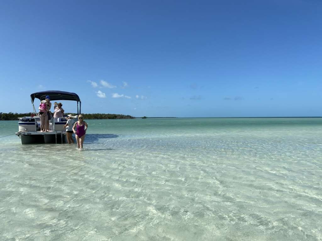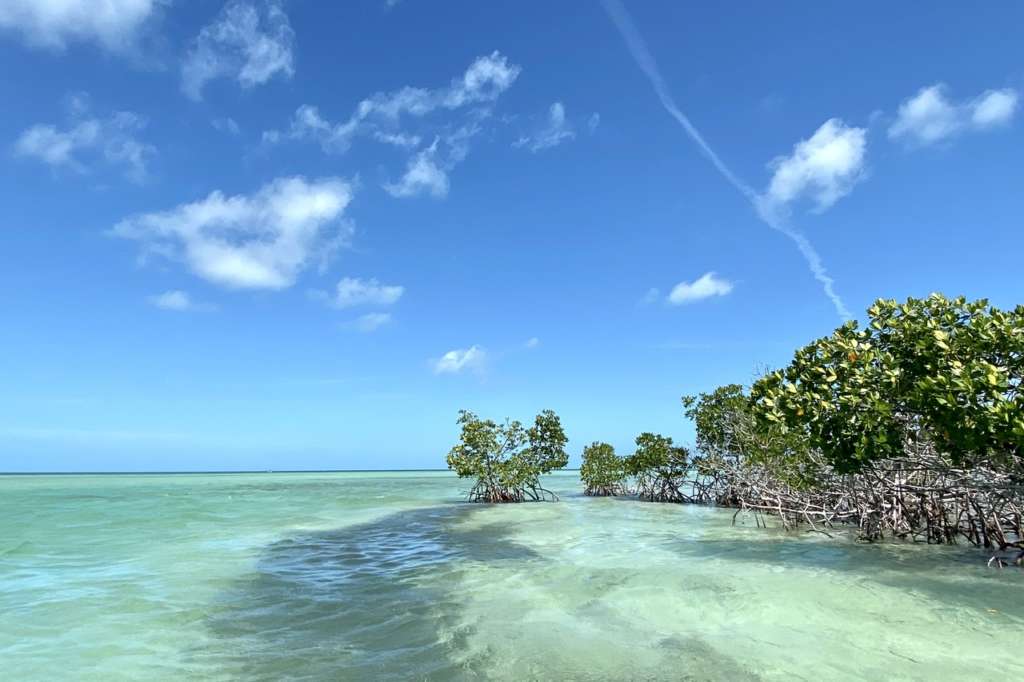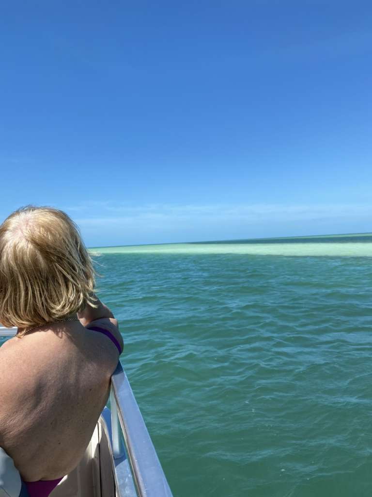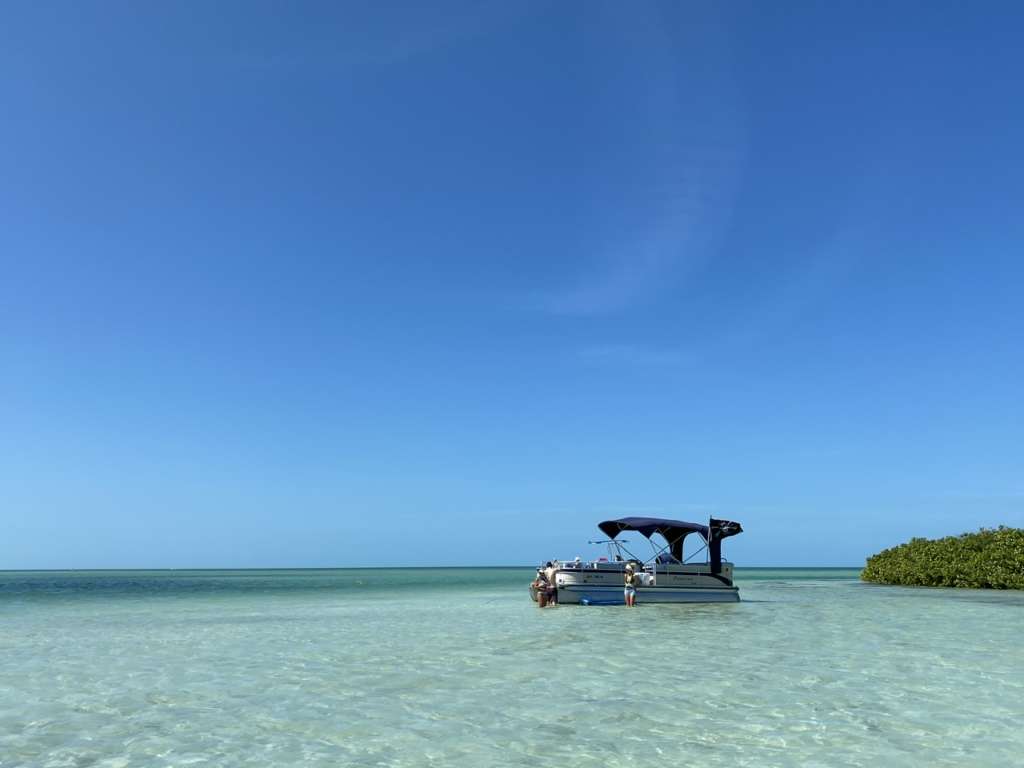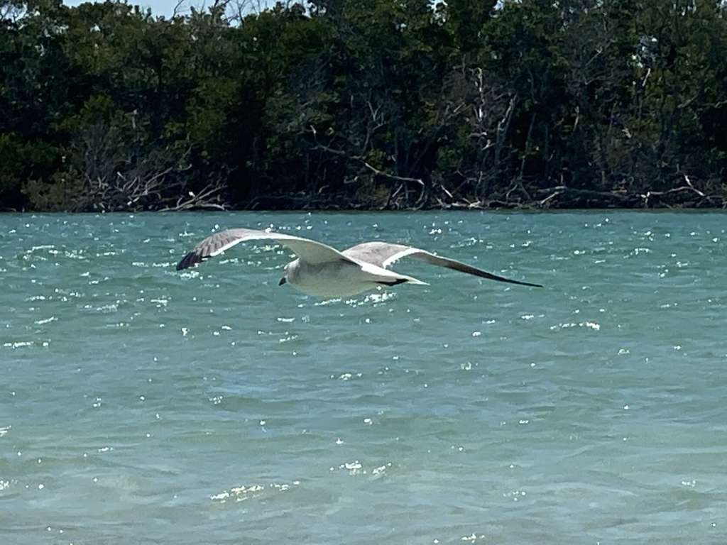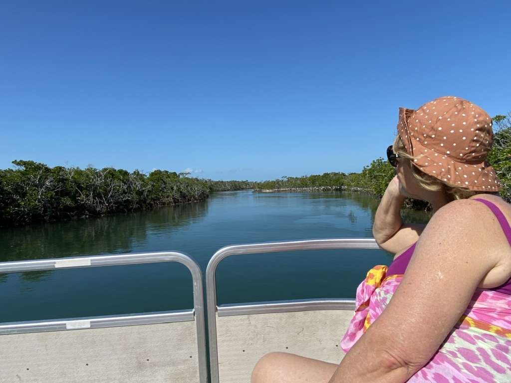 Oui mais c’est quoi le back country au juste ? je ne sais pas pourquoi, le nom me fait penser au far West donc un lieu sec. En fait c’est tout l’inverse. C’est un chapelet d’îles et de Mangrove situé au niveau de Sugarloaf Key côté golf du Mexique à quelques kilomètres au large. On embarque donc dans notre bateau à moteur à fond plat à 10h30, soit avec 30 min en retard. Capitaine Larry a 2 préoccupations : s’assurer qu’on n’apporte pas de bananes à bord – ca porte-malheur – et nous faire partir le plus vite possible car la marée remonte. Ca nous rappelle les mêmes problématiques que celles rencontrées en buggy au Brésil.