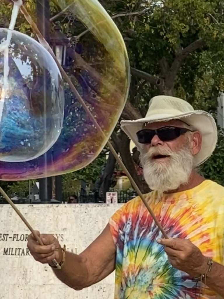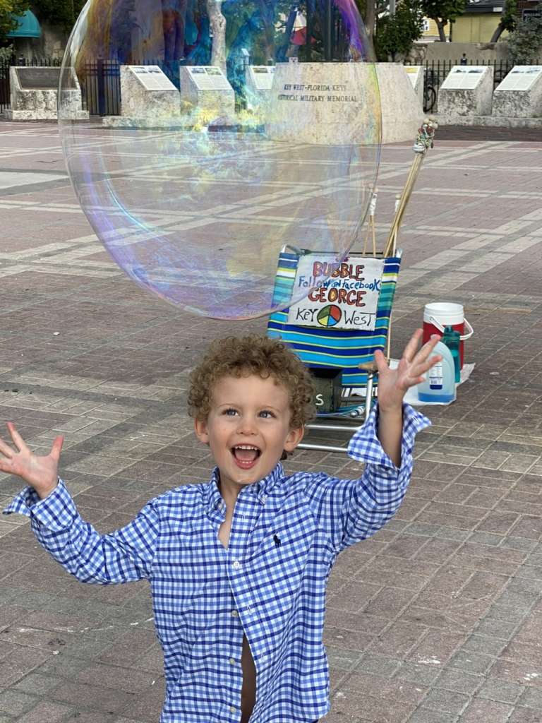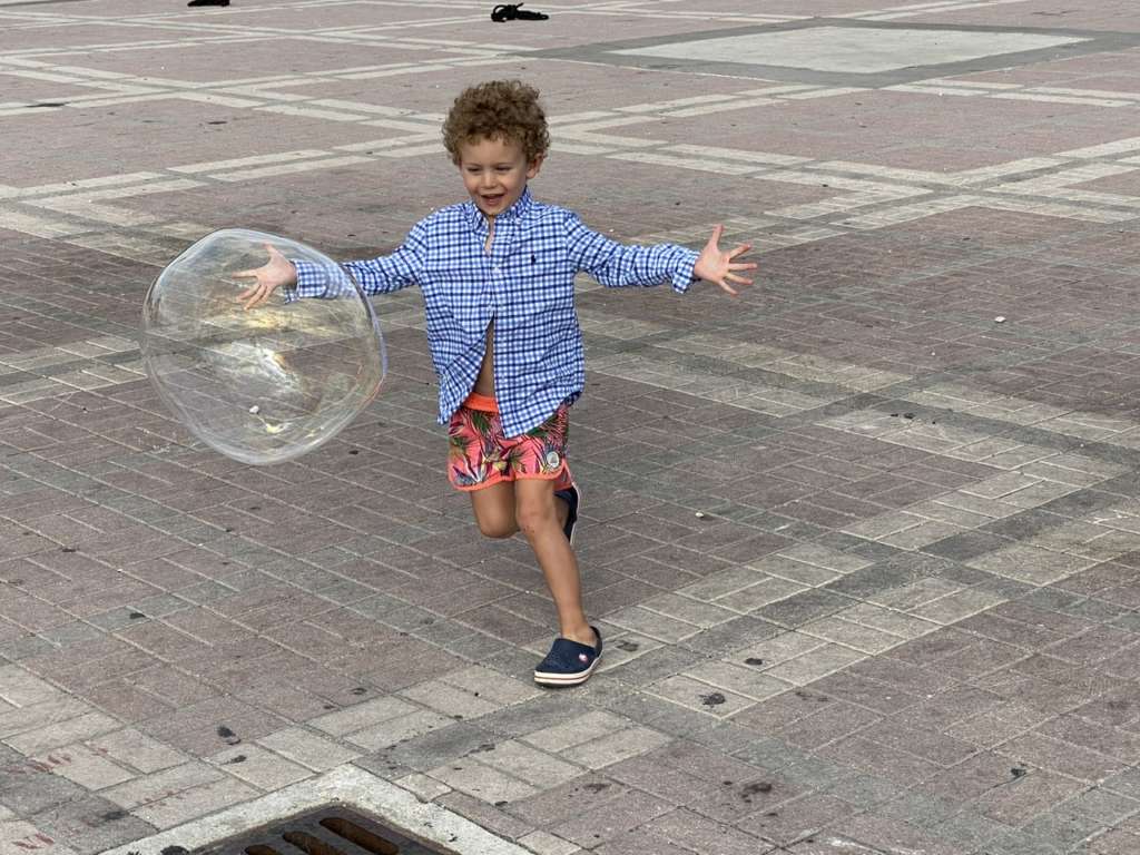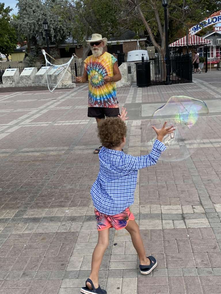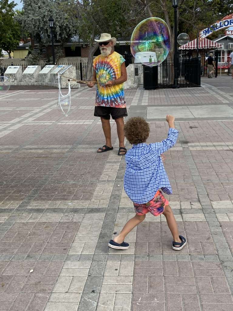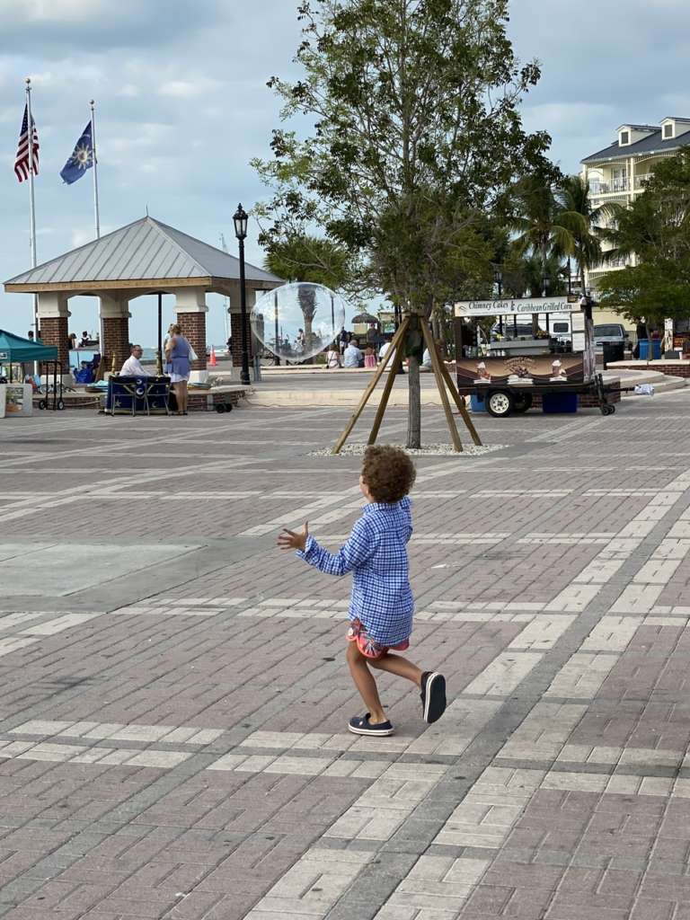 A peine arrivés sur Mallory square, Noah repère un gars qui fait d’énormes bulles de savon. 15 bonnes minutes à courir après les bulles pour les éclater, Noah me demandant mon aide pour que je le porte pour éclater celles qui s’envolent trop haut.