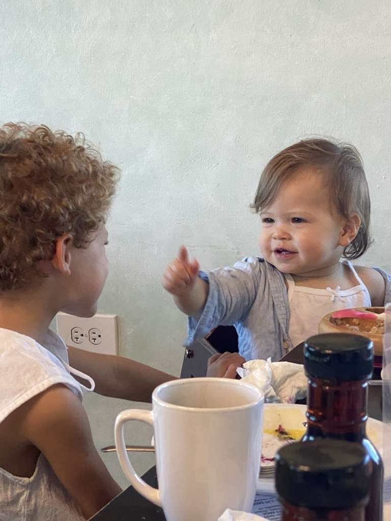 Pas le courage de retourner une troisième fois d’autant que tout le monde nous attendait depuis déjà un certain temps au restau. Les plats viennent d’arriver, on mange sur le pouce avec un Noah qui n’a qu’une envie comme d’habitude c’est de ne pas rester en place. Alors il joue avec son super pickup et se fait donner à manger au bec comme un oiseau…