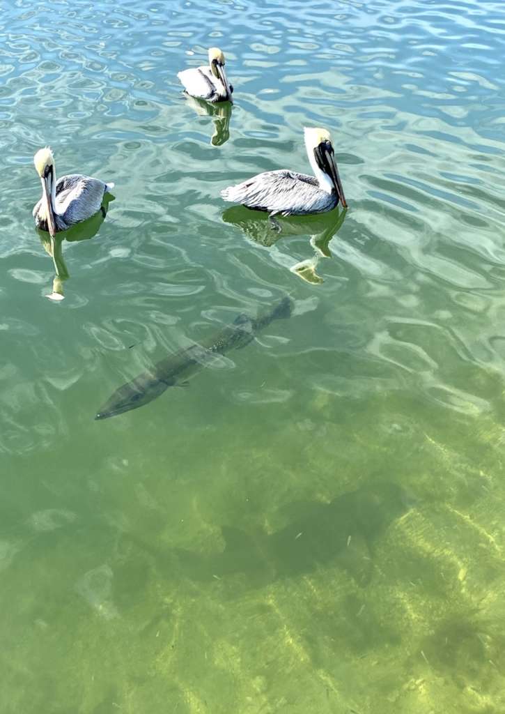 Sur la route du port, on croise un requin et ce n’est qu’une fois arrivés au port que comme souvent on a une explosion animalière. On l’avait déjà remarqué avec Virginie lors de nos nombreux voyages, notamment au Costa Rica. Tu cherches à voir des animaux pendant des heures et tu ne vois rien pendant longtemps, puis tout d’un coup, sur 10m2, tu as une concentration d’espèces. Ici c’est sur le petit port qu’on verra au même endroit une bande de pélicans avec juste en dessous d’eux un énorme barracuda et 3 requins. Je suis très fier d’avoir pu prendre une photo avec simultanément le requin, le barracuda et 3 pélicans.