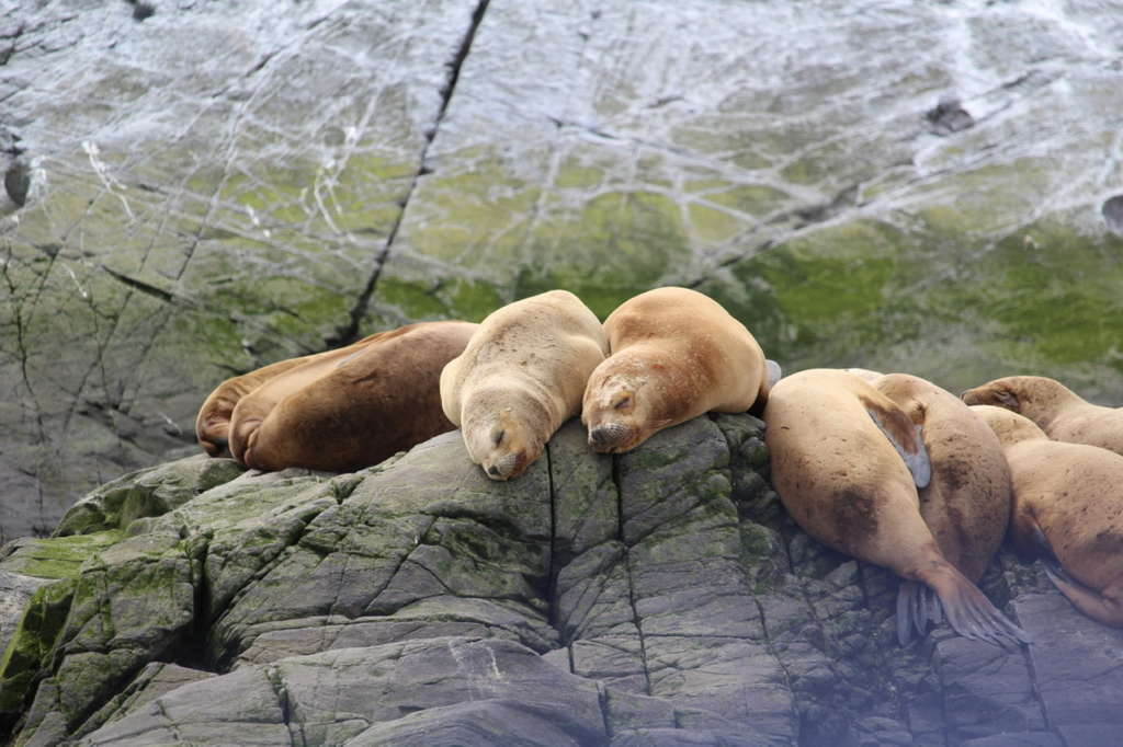 On va ainsi repasser rapidement devant le phare des éclaireurs, l’île aux lions de mer et aux cormorans. Heureusement, qu’on l’a fait en petit comité il y a 48h, par super beau temps et en prenant notre temps. Du coup zéro frustration lorsque les touristes qu’on a rejoint sur le bateau, notamment chinois (la plaie du tourisme mondial il faut bien le dire) se mettent devant toi et te poussent pour prendre une photo en 3s dont tu vois bien sans avoir à la regarder qu’elle sera aussi moche et mal cadrée qu’ils sont mal éduqués. Ce retour s’avère être plus pour nous un moyen de transport différent du car qu’une visite en tant que tel même si c’est toujours aussi chouette de voir les loons de mer.