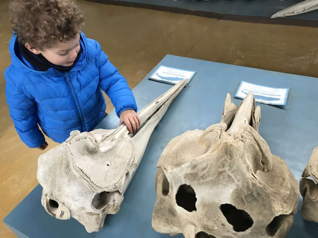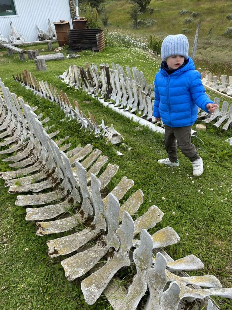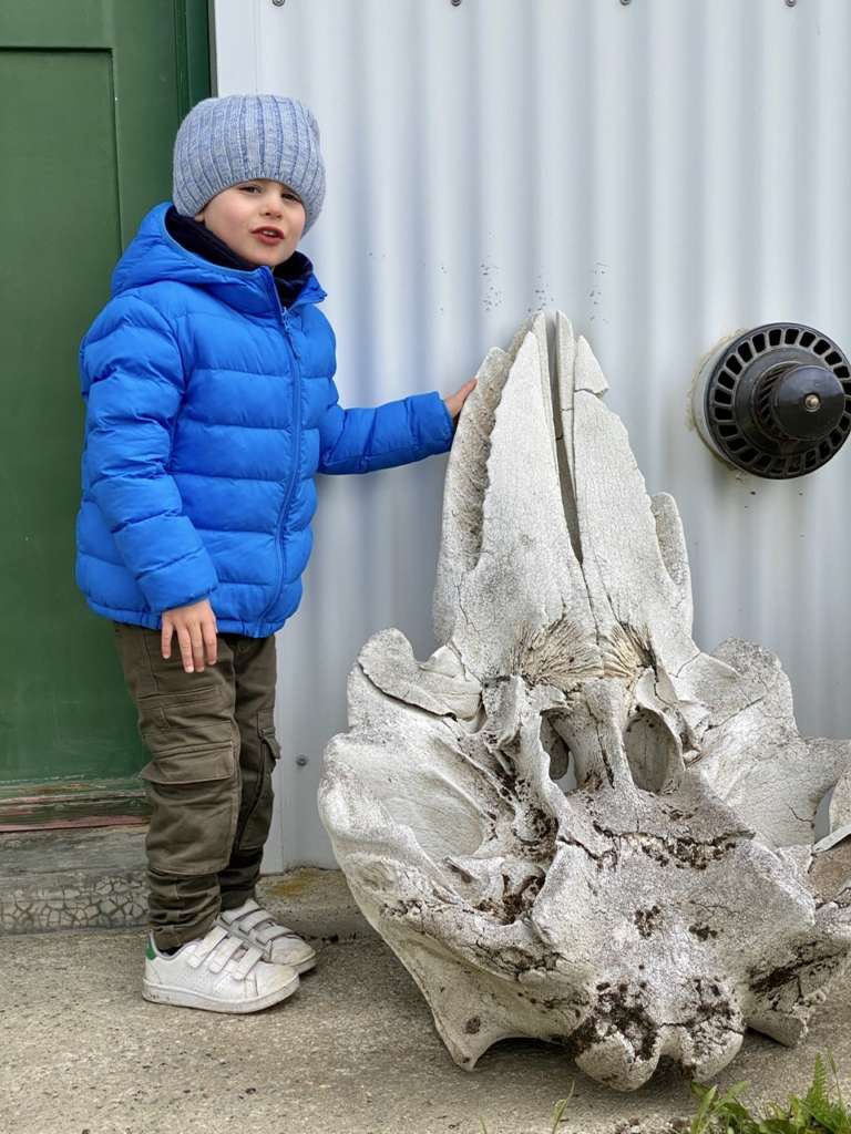 Pendant que le second groupe va voir les manchots, on nous invite à aller voir le petit musée de l’estancia situé à quelques centaines de mètres de là, dans une autre bâtisse. D’habitude, on rechigne au plan musée de ce type qui frôle généralement dangereusement le piège à touristes où l’on exhibe des objets dignes d’un mauvais vide grenier, mais là c’est super intéressant. Ils ont regroupé dans une salle les squelettes de tous les grands mammifères et poissons qu’on croise dans la région (les différents types de baleines, dauphins, orques, lions de mer). Du coup on apprend pleins de choses et Noah adore voir les squelettes.