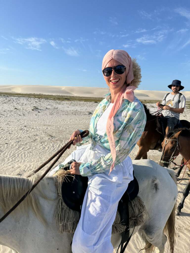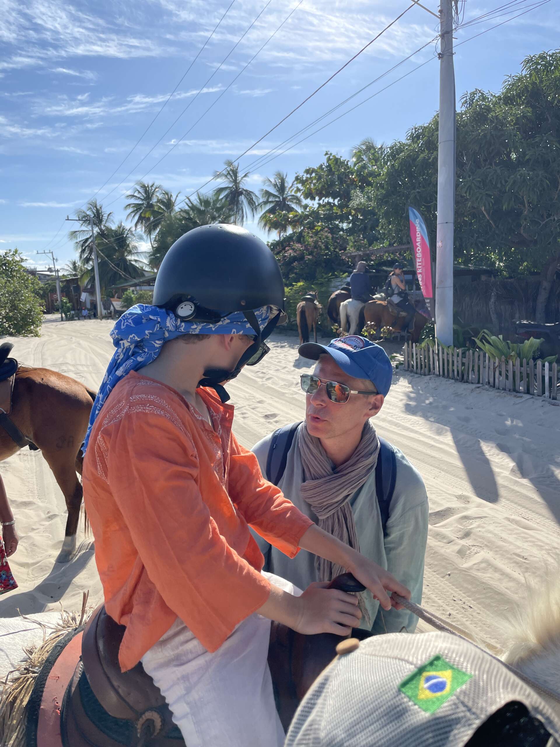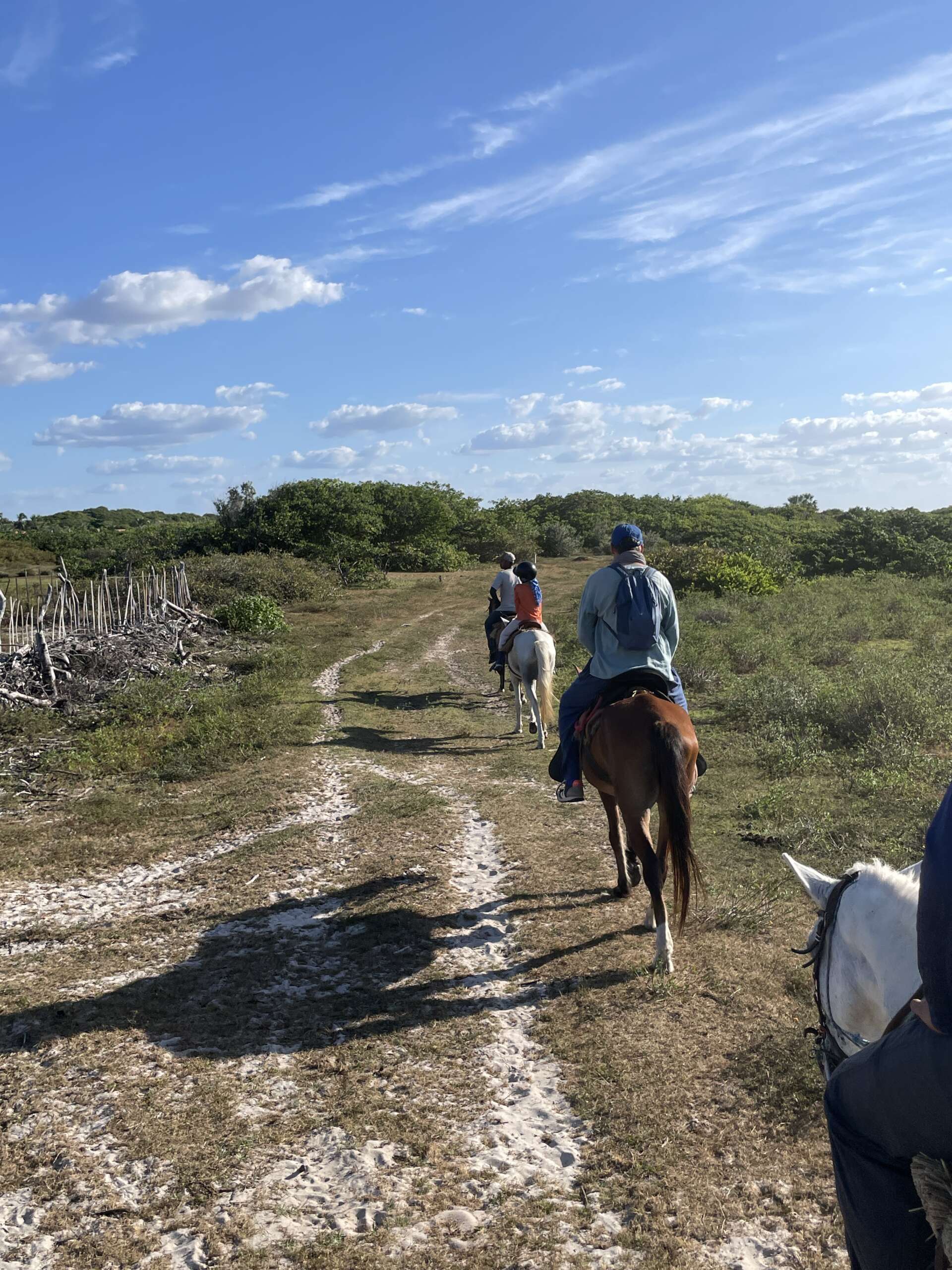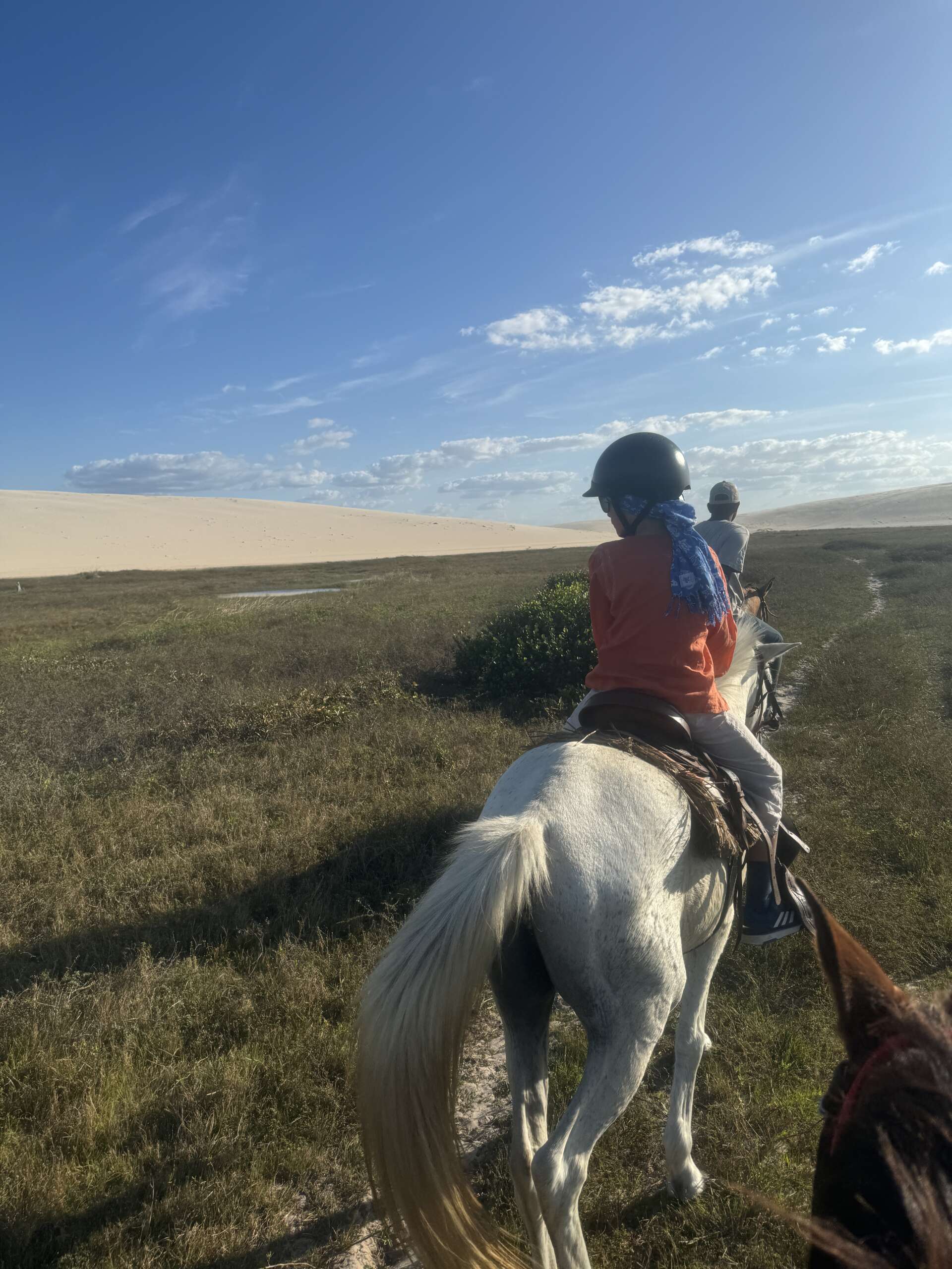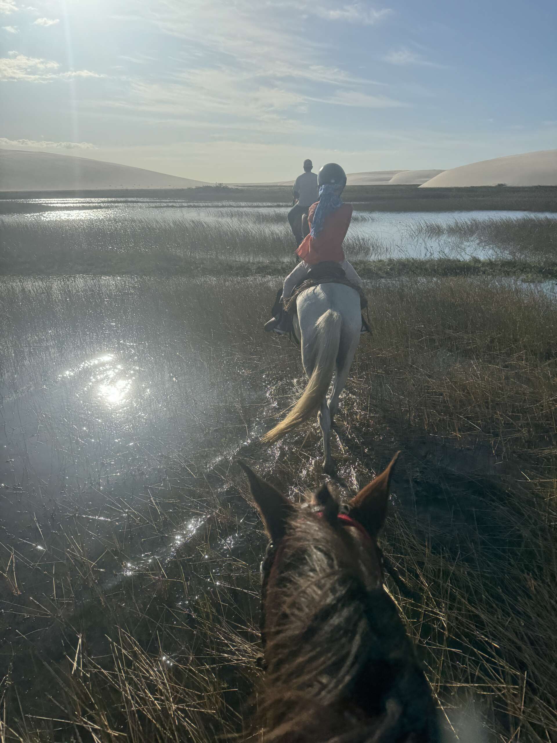 Noah monte gracieusement sur son cheval comme s’il en avait toujours fait – le privilège de l’insouciance jeunesse. Virginie un peu moins – l’inconvénient du vieux briscard qui a déjà vécu. Nous voilà donc tous les trois en plein cagnard à nous demander comment cela va se passer. Notre groupe est composé de nous, 2 guides et 2 brésiliens en vacances dont on ne connaît pas le niveau équestre.