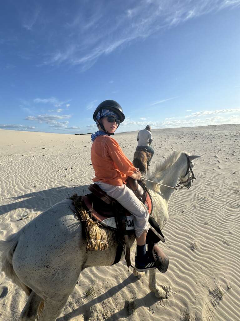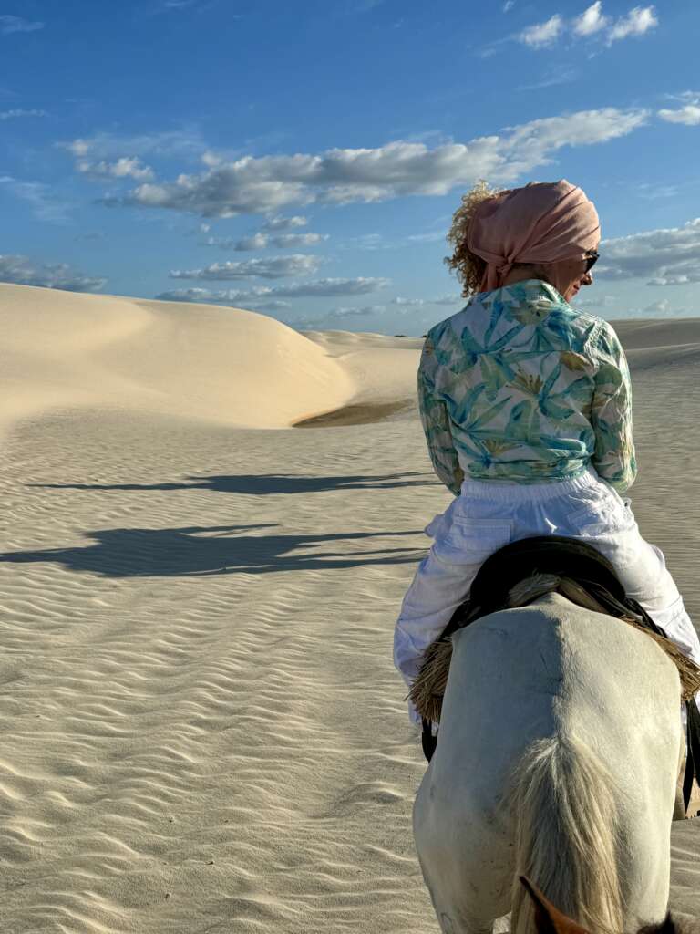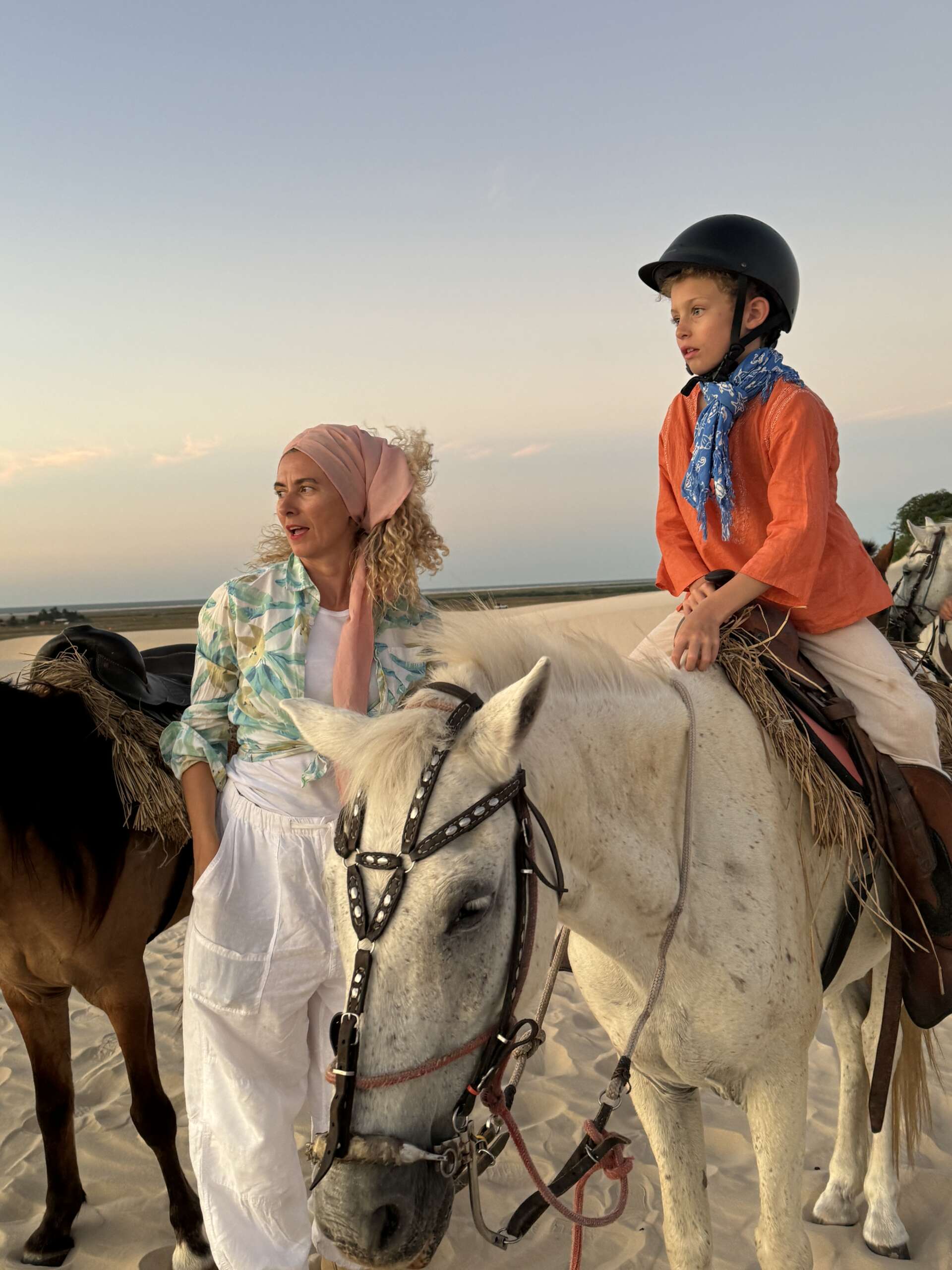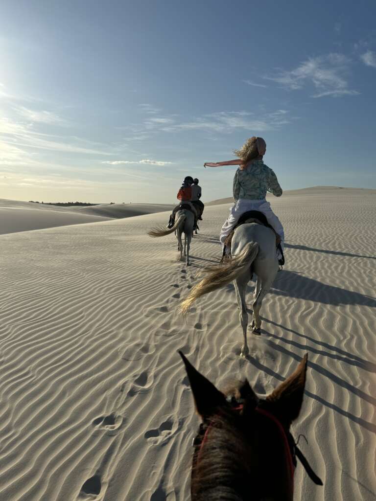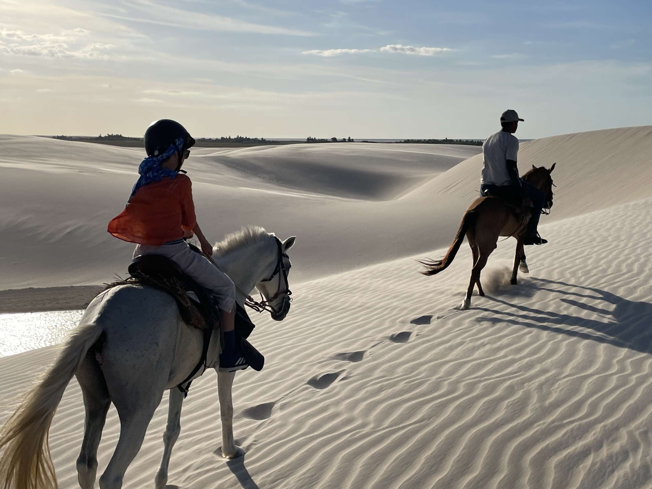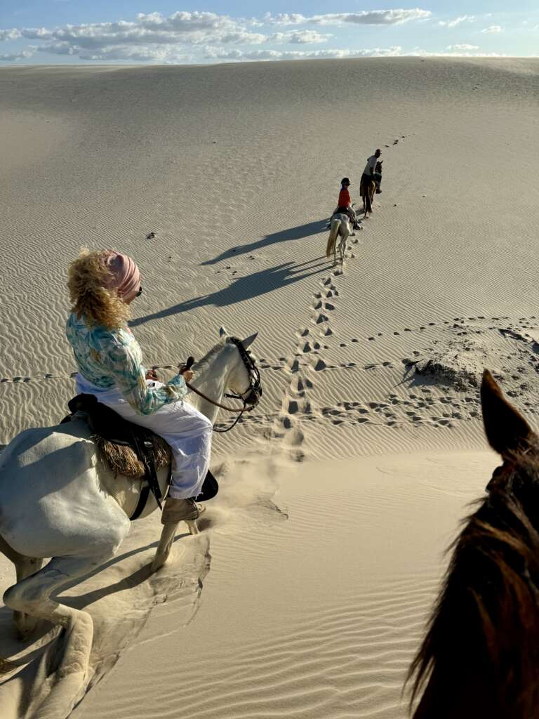 On finit par atteindre les dunes et là, c’est vrai que le spectacle avec le soleil qui descend à l’horizon, nous sur nos chevaux sur la crête longeant les lagunes, ça fait très Lawrence d’Arabie. Vous entendez la musique ? Moi un moment en arrivant au sommet de la première dune, je vous jure, je l’ai entendue. (Noah en tant que djeuns a préféré nous dire « ça Kick ». Question de génération. Il a ajouté ensuite « Ca nique ! ». Bon là je pense que c’est une mauvaise compréhension du terme mais j’ai préféré ne pas relever, on verra si l’expression revient. Virginie avec ses termes crus lui expliquera ce que ça veut dire j’en suis sûr. Ca promet).