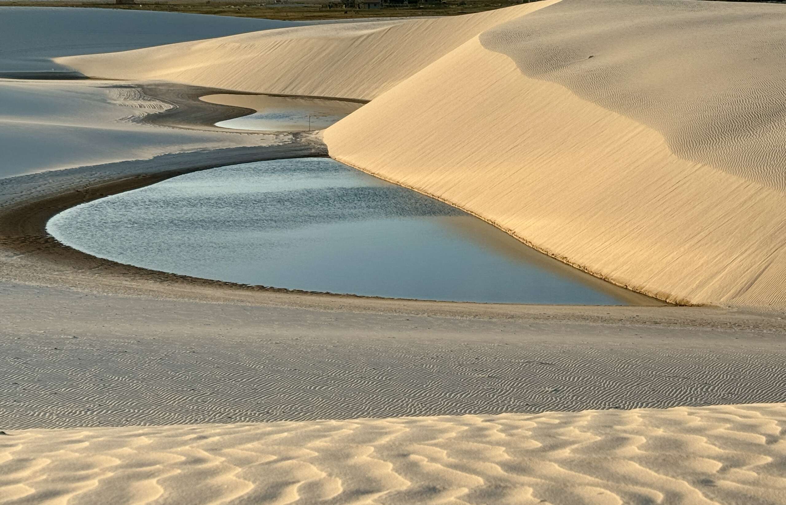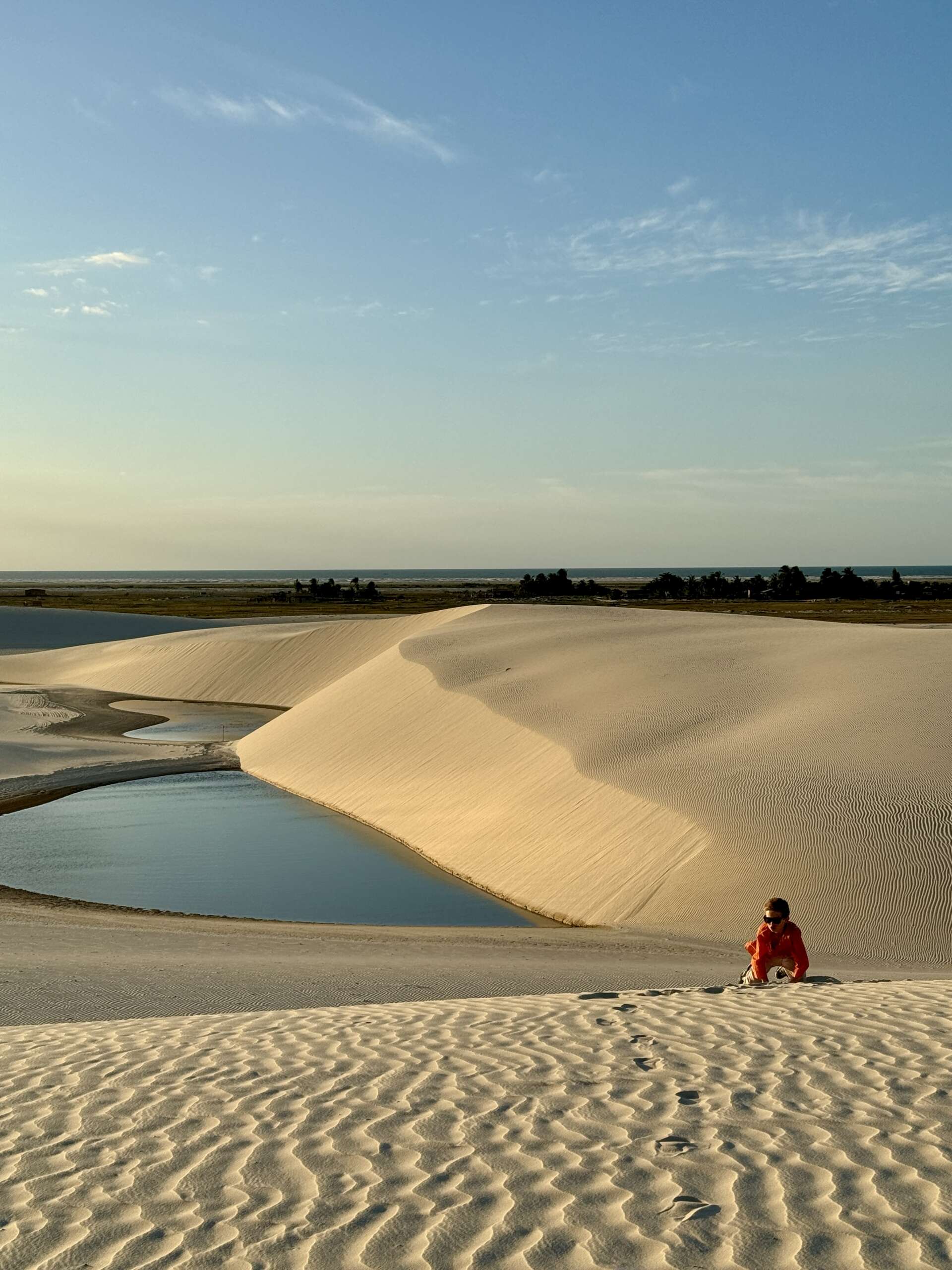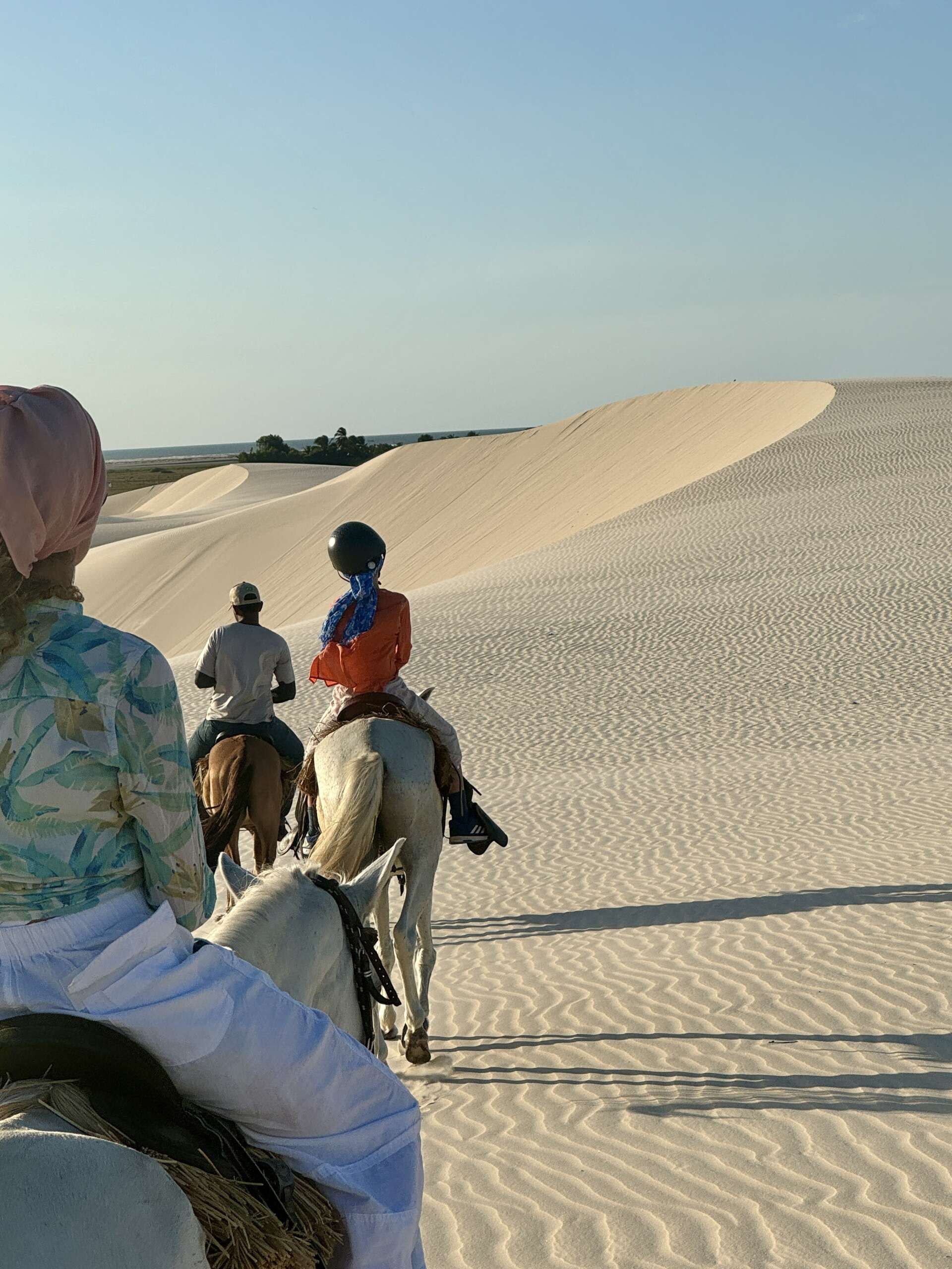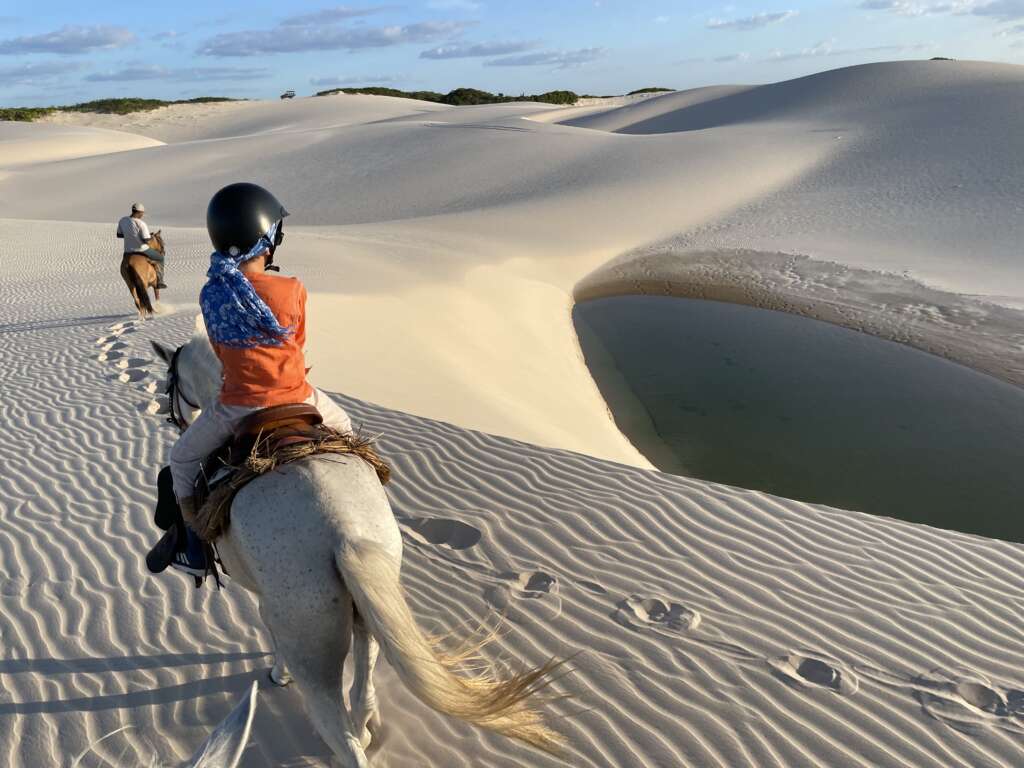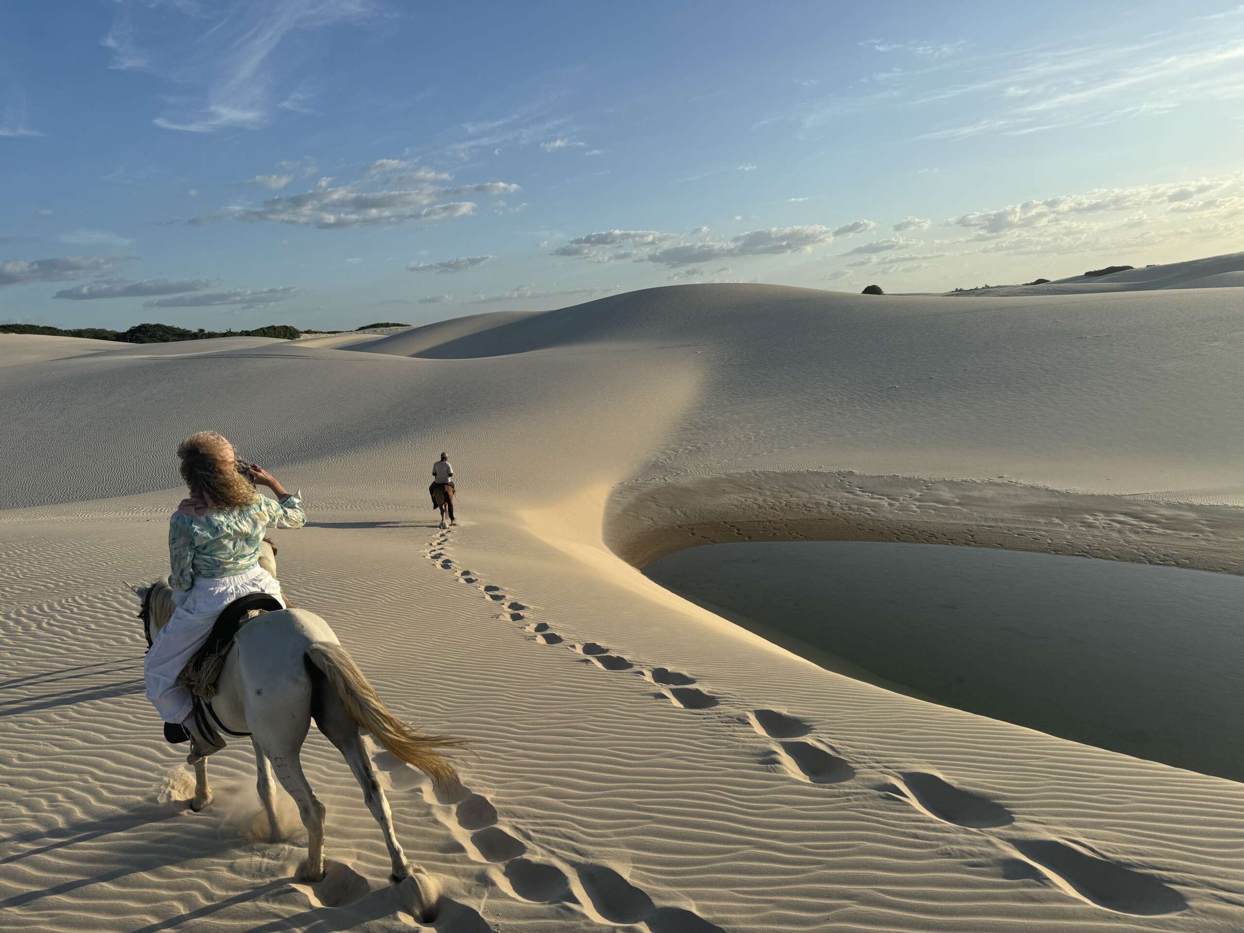 On finit par atteindre les dunes et là, c’est vrai que le spectacle avec le soleil qui descend à l’horizon, nous sur nos chevaux sur la crête longeant les lagunes, ça fait très Lawrence d’Arabie. Vous entendez la musique ? Moi un moment en arrivant au sommet de la première dune, je vous jure, je l’ai entendue. (Noah en tant que djeuns a préféré nous dire « ça Kick ». Question de génération. Il a ajouté ensuite « Ca nique ! ». Bon là je pense que c’est une mauvaise compréhension du terme mais j’ai préféré ne pas relever, on verra si l’expression revient. Virginie avec ses termes crus lui expliquera ce que ça veut dire j’en suis sûr. Ca promet).