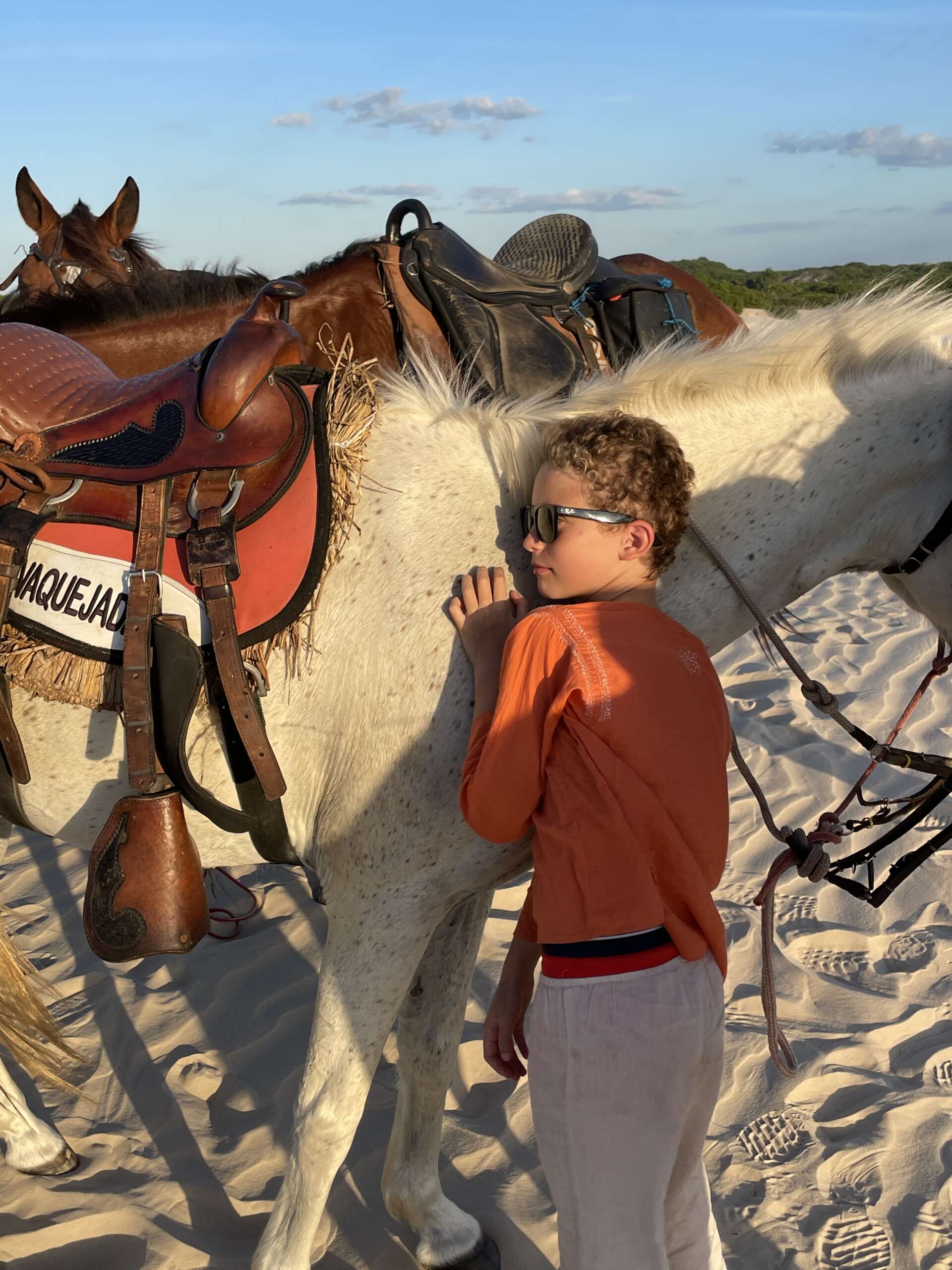 Ne brûlons néanmoins pas les étapes de l’histoire. Il est 15h30, pour l’instant son caractère vicieux ne s’est pas encore manifesté. Nous ne sommes pas vraiment habillés en cavaliers car on a rien de tel dans les bagages. On est donc en tortue de mer (la marque de vêtement, pas le déguisement). Chaussures fermées quand même, mais pantalon très souple et très fin en mode Aladin et les 40 voleurs. Un truc qui quand on aura fait 1h de cheval nous fera bien mal aux fesses à tous les coups.