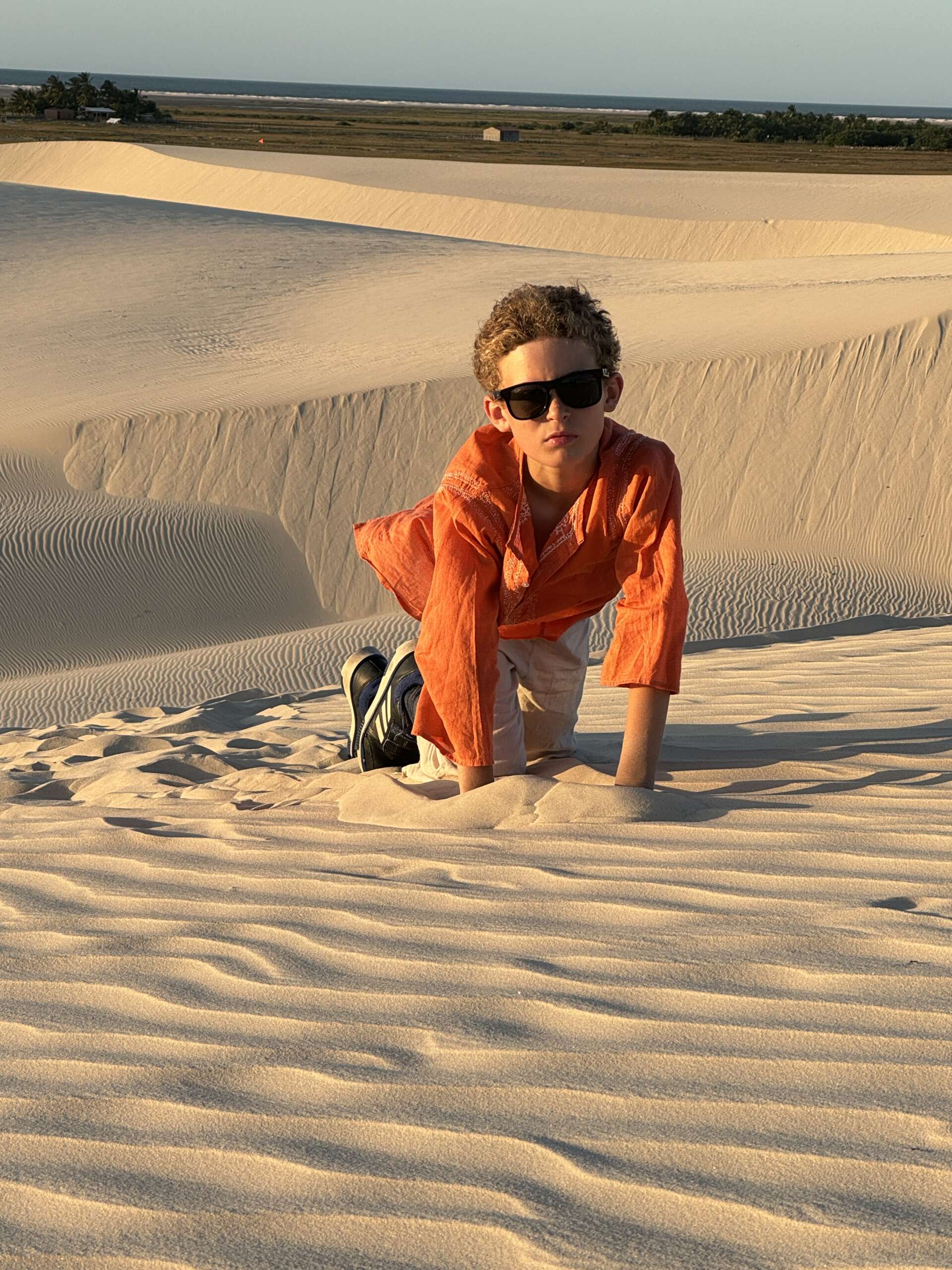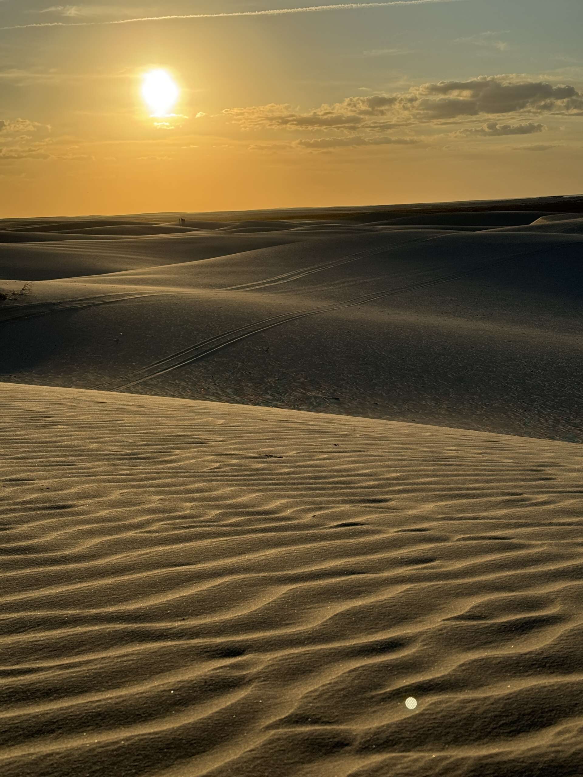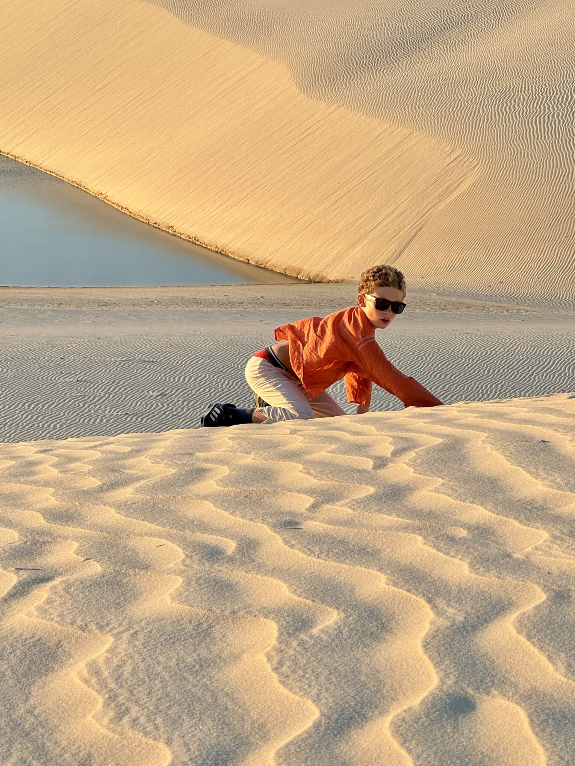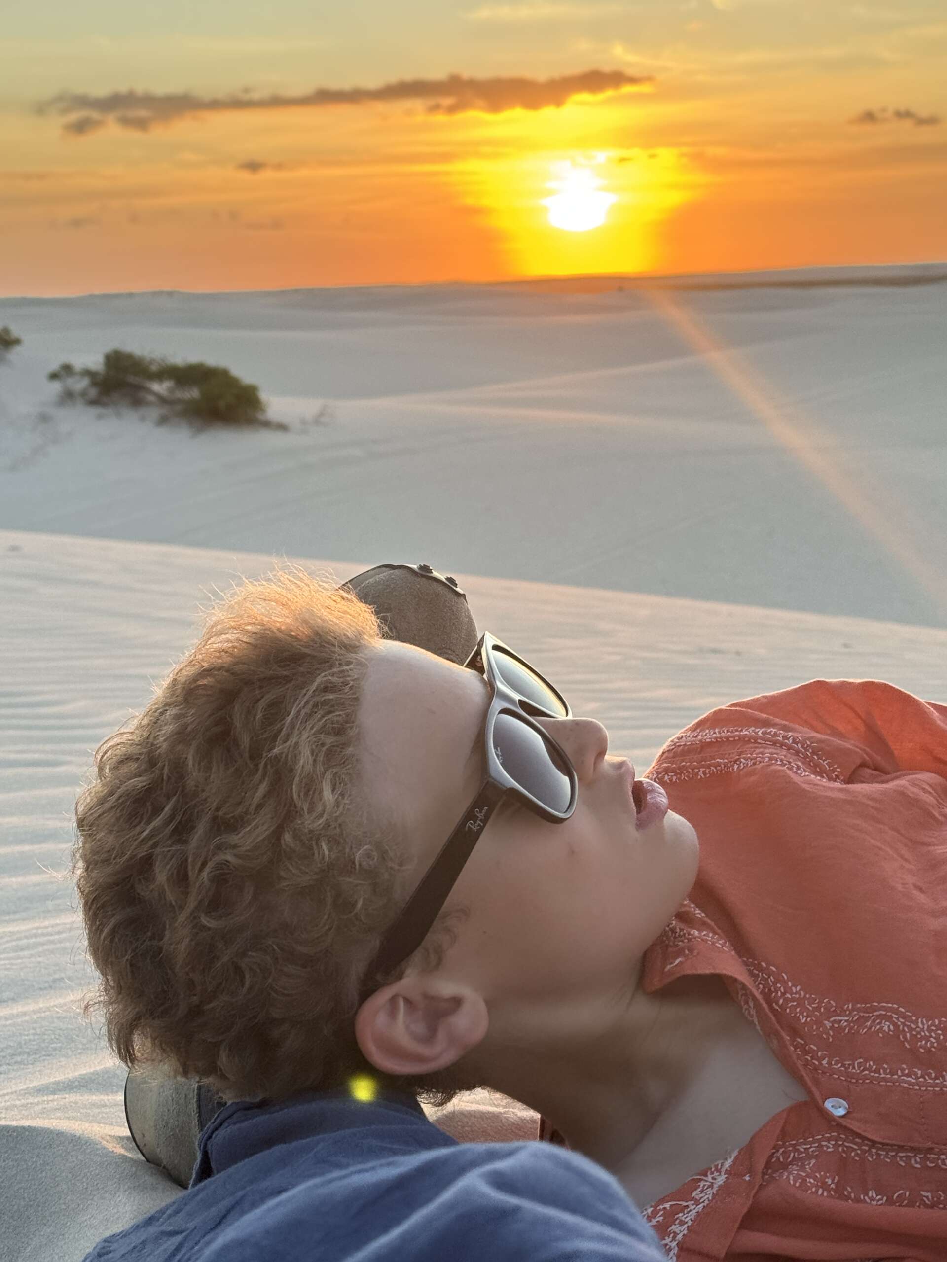 On va continuer ainsi jusqu’à la tombée de la nuit (cela fait bien 2 heures qu’on est parti), pour s’arrêter en haut d’une grande dune au moment du coucher du soleil. Noah se précipitera pour descendre de selle pour dessiner un circuit de quad de 200 mètres dans le sable, avant de venir finalement se blottir entre nous deux pour les derniers rayons du coucher du soleil.