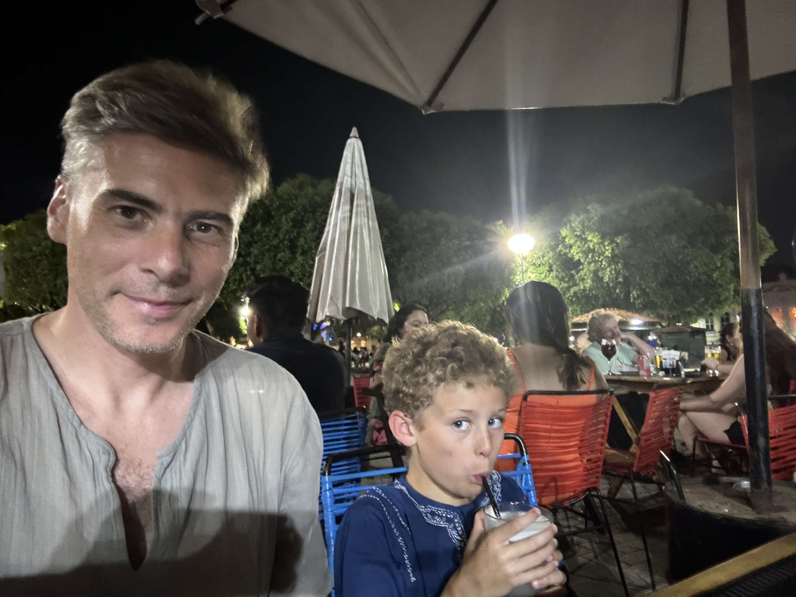 Le ventre de Virginie gargouille de faim. Je la connais, si je ne lui trouve pas à manger tout de suite, ça va grincer dans les chaumières. Je vois sur la grande place de l’opéra un café qui a l’air super bien noté. On se dirige là-bas, et pendant qu’on attend une table, on part avec Noah en quête d’une pharmacie pour acheter l’indispensable perdu dans le bagage : nos brosses à dents et l’anti-moustique.  Le temps de revenir, Virginie est installée. On commande auprès d’un serveur Haïtien – qui parle donc français -. Beignets de crevettes, assiettes mixte de grillades, cocktail avec alcool pour moi et limonade pour les 2 enfants. On est bien. L’ambiance est musicale.