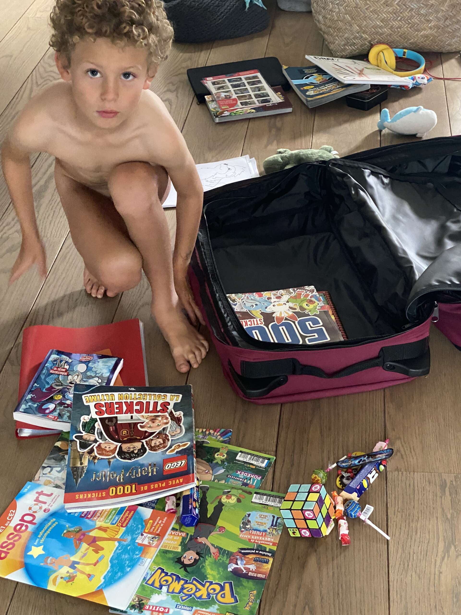 Nous voilà reparti 10 minutes après être arrivés, sans la moindre larme, avec un Noah qui tire fièrement SON nouveau sac jusqu’à chez nous et en nous expliquant tout ce qu’il va mettre comme jouets dedans pour el voyage. Son Pokedex de 5 kilos (l’encyclopédie intégrale de tous les pokemons depuis leur création), une dizaine de doudous… Le problème vient donc juste de se déplacer. Le drame potentiel n’est plus le sac, mais ce qu’on va lui laisser mettre dedans… La politique des petits pas…