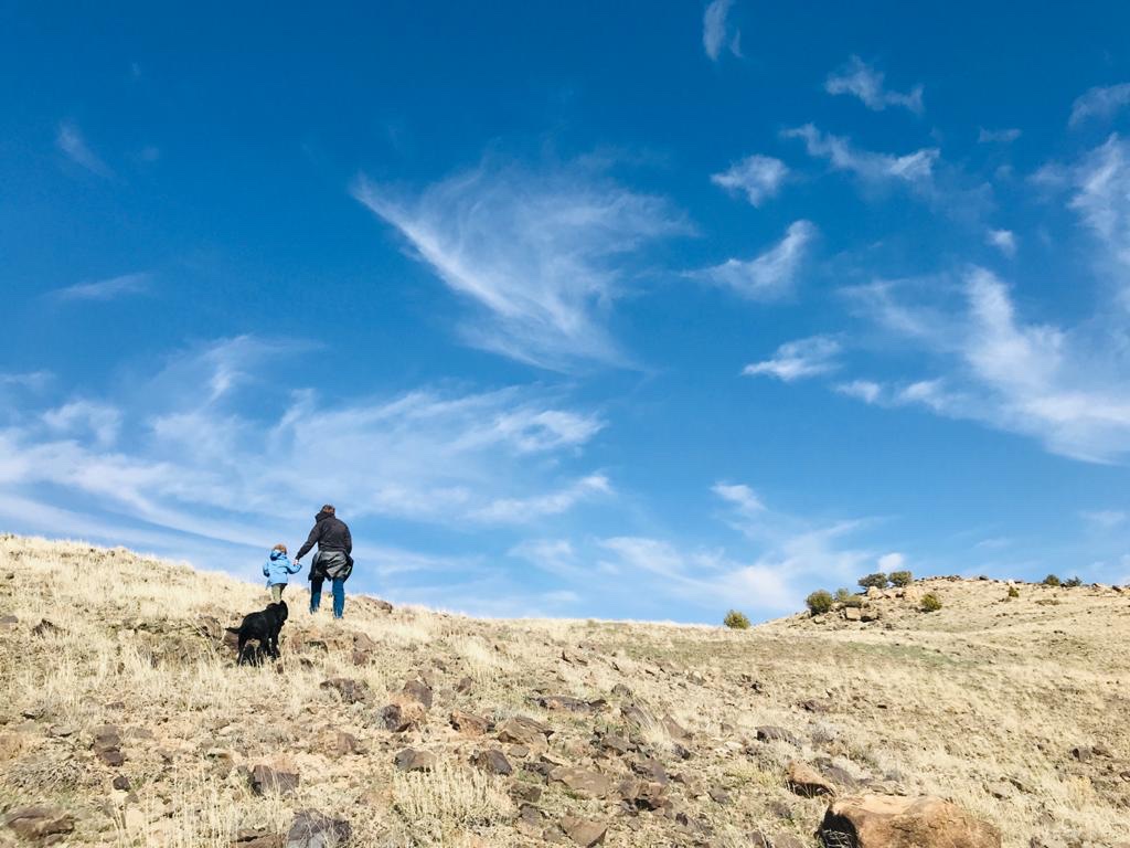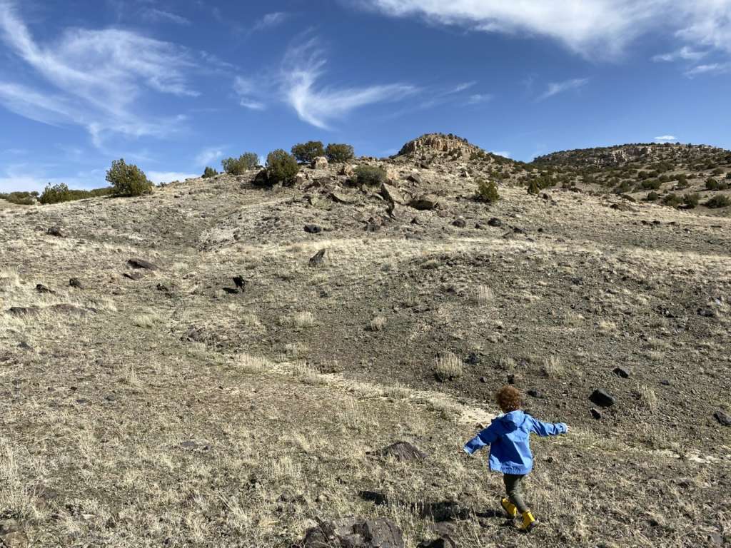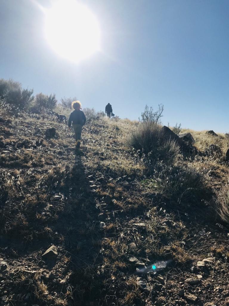 Il n’y a pas de chemin, c’est à nous de tracer la route, mais comme la colline surplombe les alentours, au moins on sait dans quelle direction aller. Bizarrement, on part assez léger (juste de l’eau pour Noah et pas de porte bébé) alors que la marche va bien nous prendre 2h à vue de nez. Enfin comme souvent quand tu marches en montagne, tu as toujours l’impression que le lieu que tu vises est beaucoup plus près qu’il ne l’est vraiment. Tu as aussi souvent l’impression que tu vas monter tranquille en ligne droite avant de te rendre compte que tout est vallonné et que tu vas donc passer ton temps à monter et descendre avant de toucher au but.