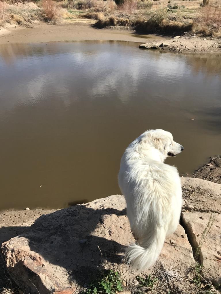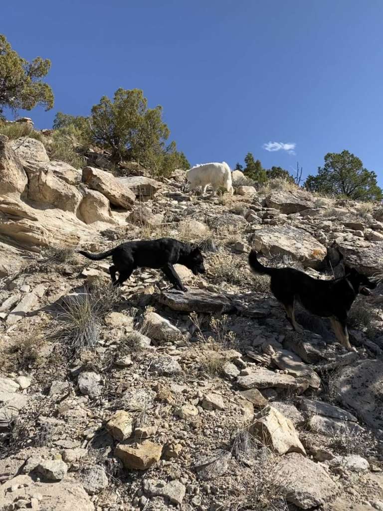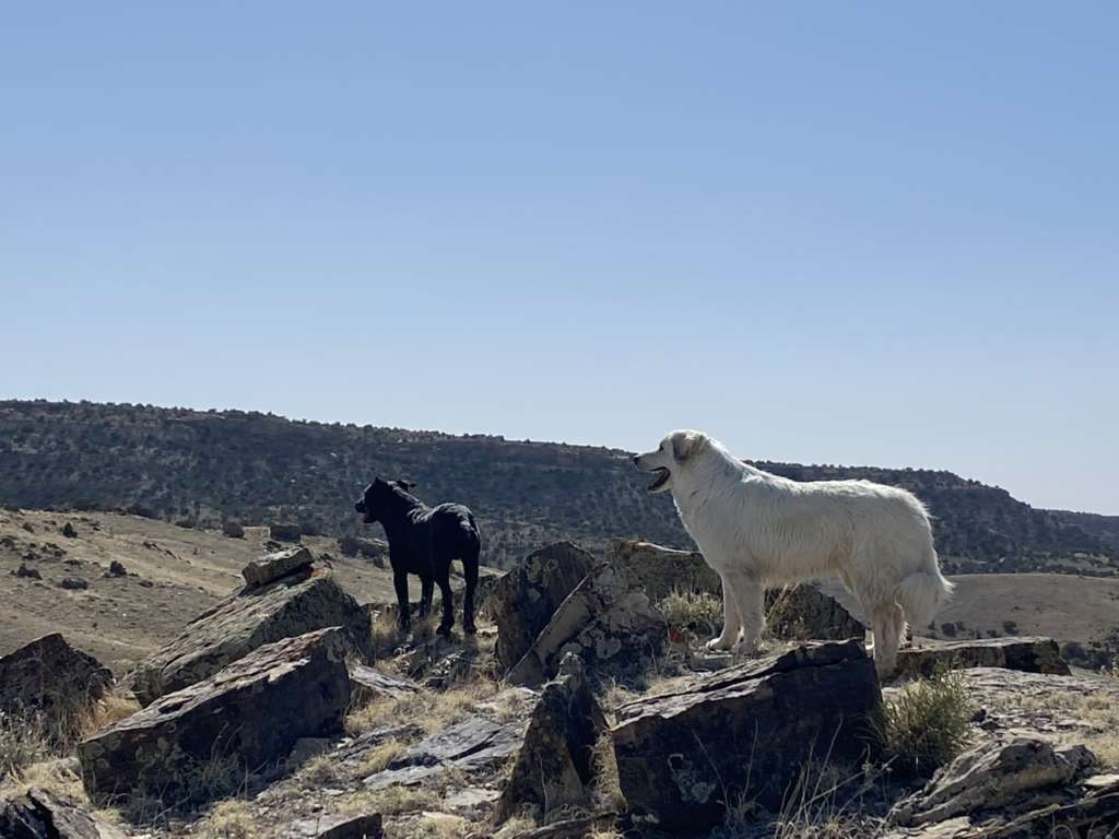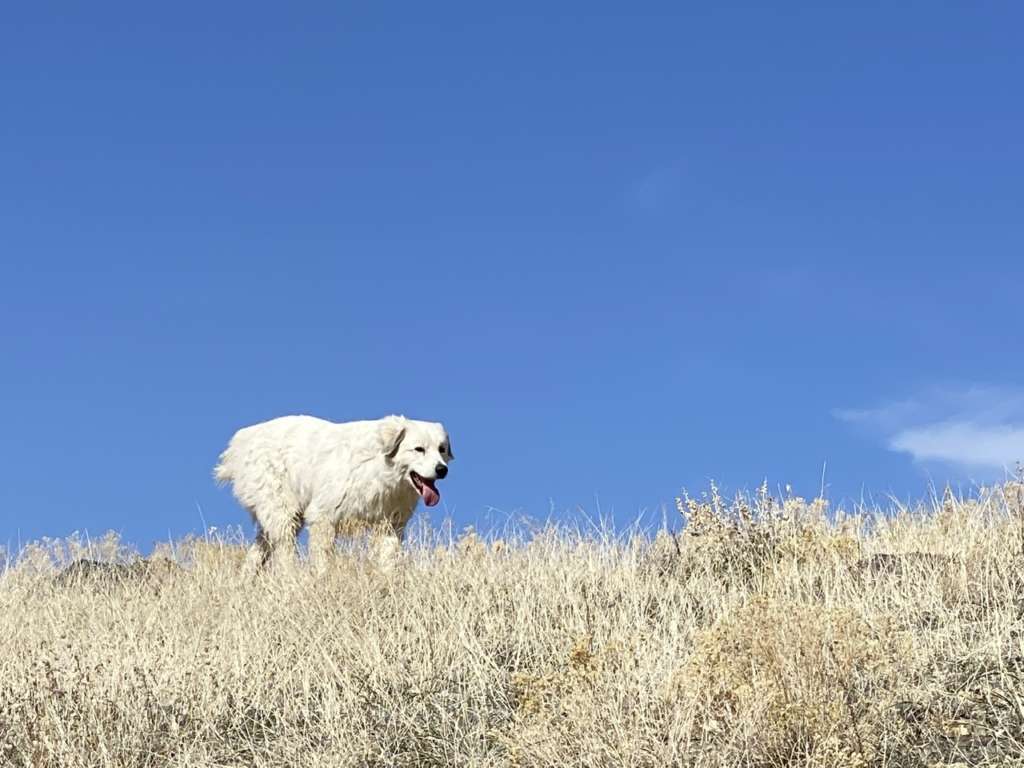D’ailleurs c’est marrant car dès qu’on sort de la partie “habitée du ranch”, les 3 chiens se mettent automatiquement en formation de gardiens de troupeaux. Ils partent chacun dans une direction en amont de là où on va (ils ont très clairement compris le but de notre marche) et reviennent chacun à intervalles réguliers vers nous avant de repartir faire leur ronde. C’est très intéressant à suivre car quand tu commences à y prêter attention, tu remarques que rien n’est laissé au hasard. Ils partent en avant dès qu’on est sur des montées et que la visibilité est faible pour se poster en hauteur, alors que lorsque la vue est dégagée, ils reviennent près de nous pour des papouilles.