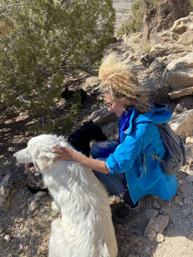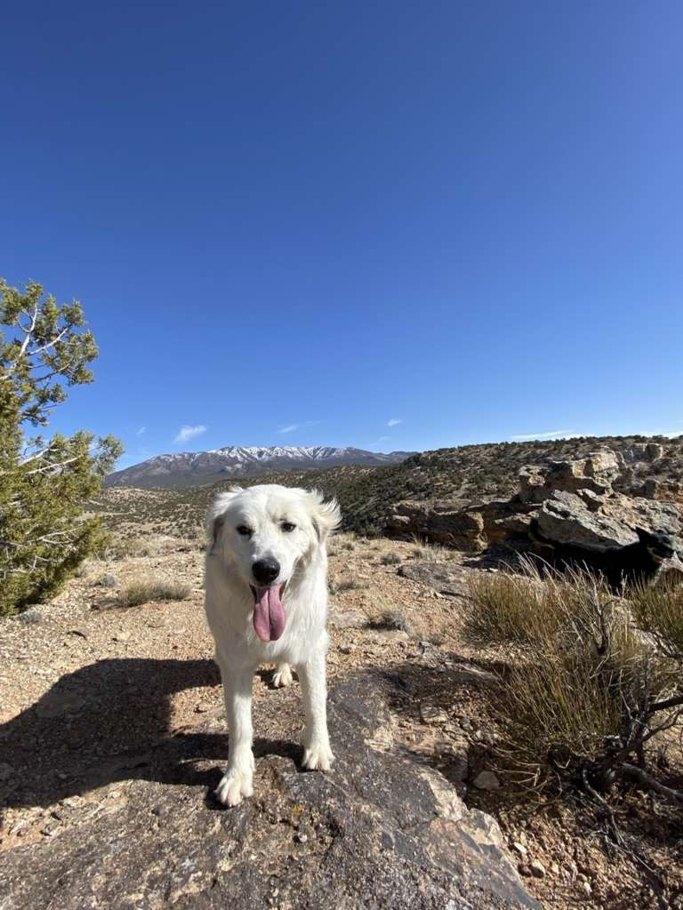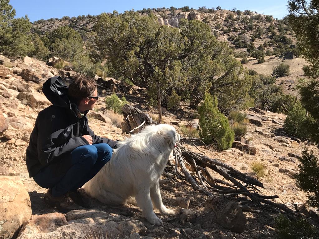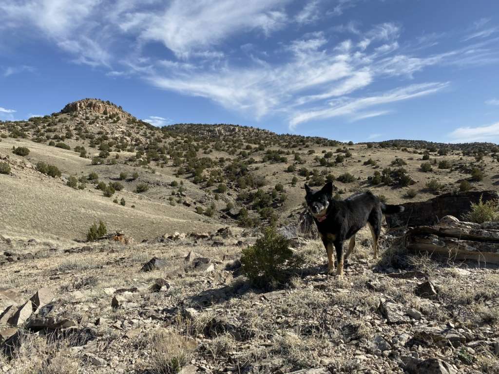 D’ailleurs c’est marrant car dès qu’on sort de la partie “habitée du ranch”, les 3 chiens se mettent automatiquement en formation de gardiens de troupeaux. Ils partent chacun dans une direction en amont de là où on va (ils ont très clairement compris le but de notre marche) et reviennent chacun à intervalles réguliers vers nous avant de repartir faire leur ronde. C’est très intéressant à suivre car quand tu commences à y prêter attention, tu remarques que rien n’est laissé au hasard. Ils partent en avant dès qu’on est sur des montées et que la visibilité est faible pour se poster en hauteur, alors que lorsque la vue est dégagée, ils reviennent près de nous pour des papouilles.