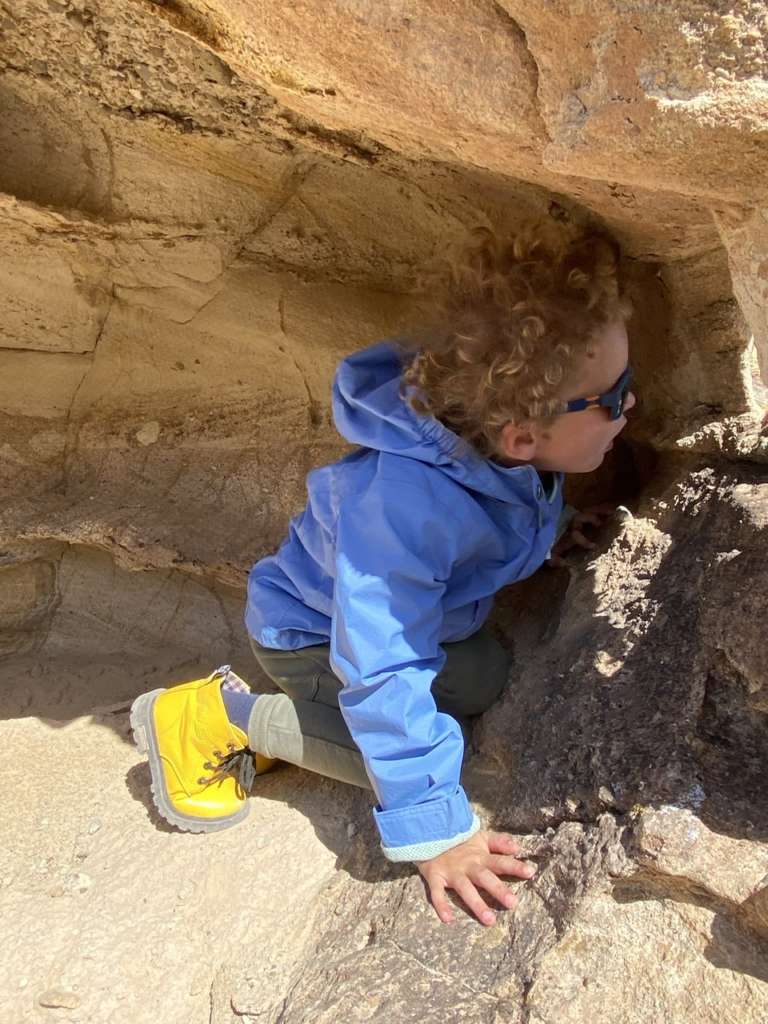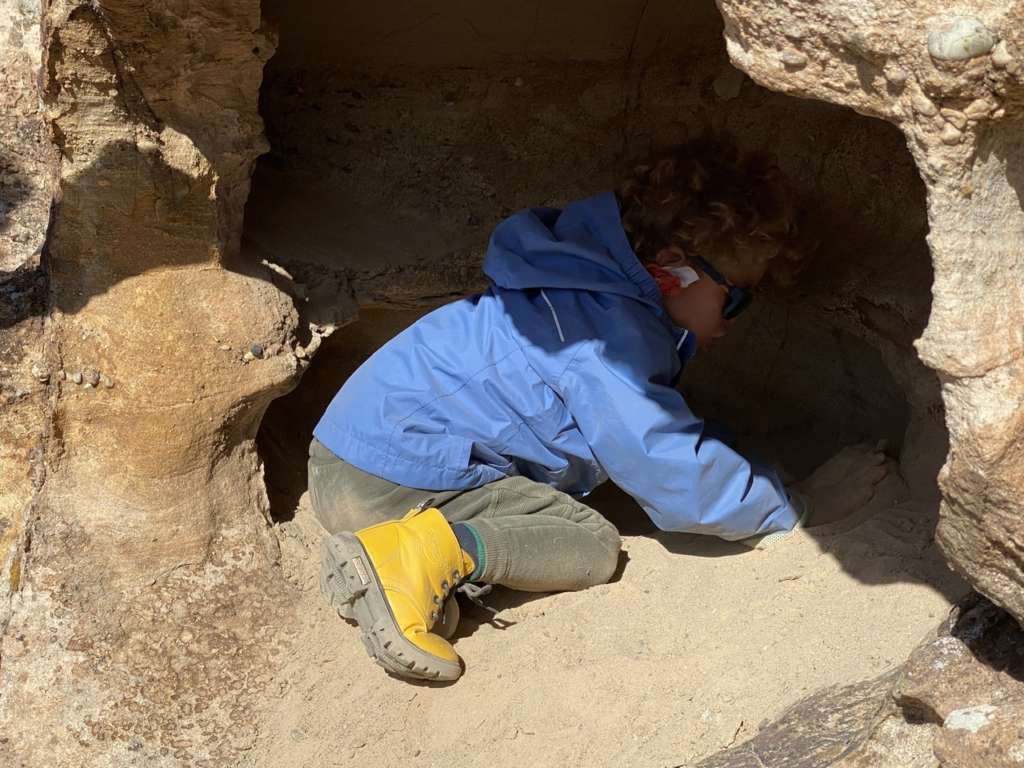 Redescente un peu plus casse-gueule que la montée – comme souvent – et je retrouve Noah un peu plus crade qu’au début qui joue à la marchande à travers un trou dans le rocher. Il déterre des rochers plats, les prépare et les mets à cuire dans le sable, et les tend ensuite à Virginie une fois qu’ils sont prêts. On le laisse profiter encore un petit quart d’heure puis on entame notre retour vers le ranch.