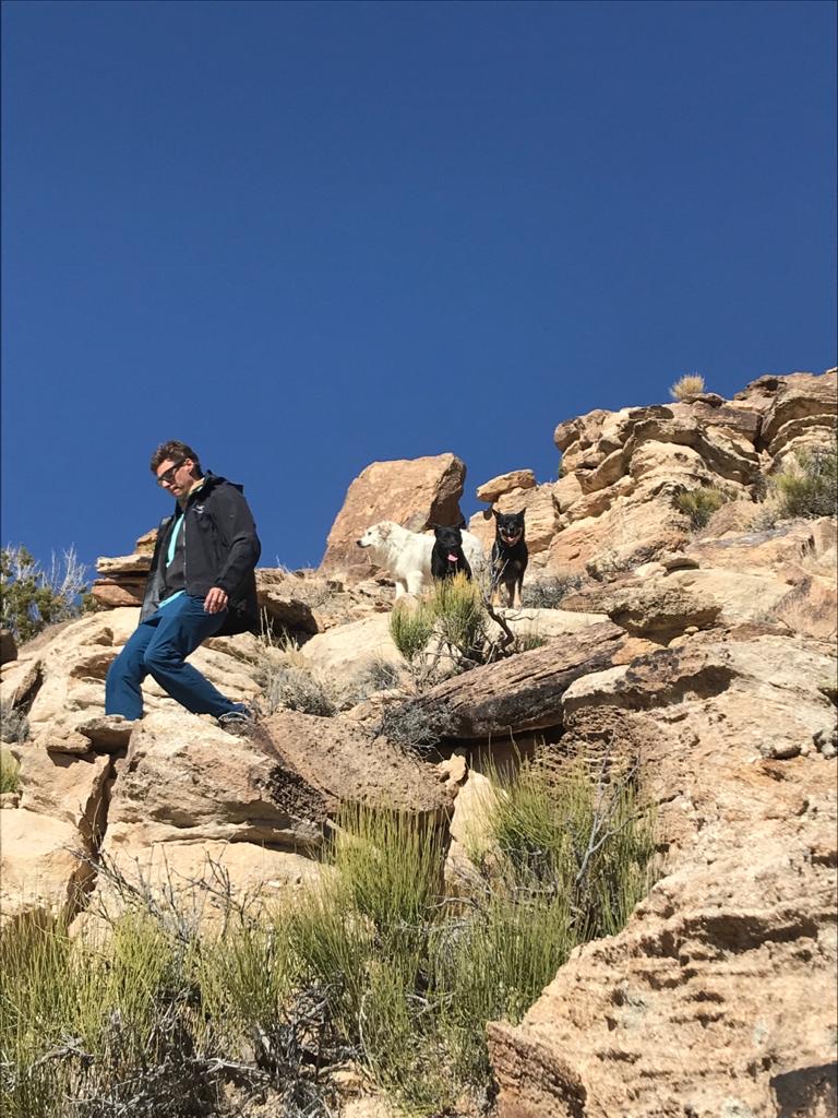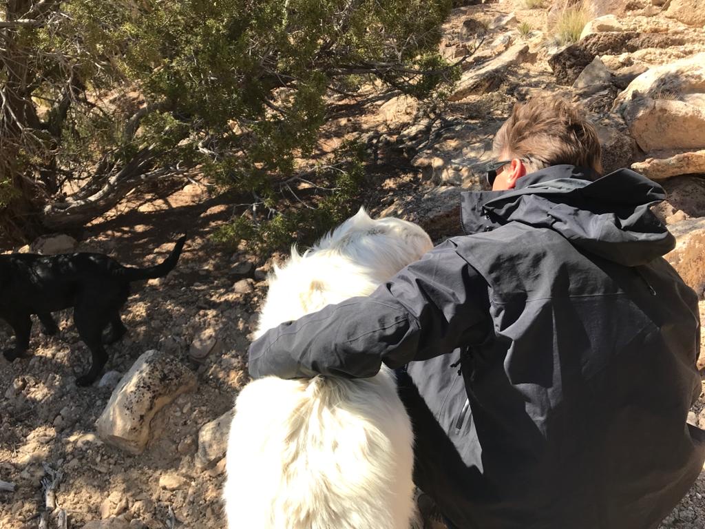 On se fraye donc petit à petit notre chemin en restant le plus possible sur les crètes jusqu’à notre colline escarpée. Lorsque ca se corse, les chiens nous indiquent le chemin à prendre entre les rochers pour poursuivre notre ascension. Noah marche tout seul et lorsqu’il s’arrête c’est davantage pour se retirer une épine sur les jambes (toute la végétation pique ici) ou pour chercher du regard les chiens.