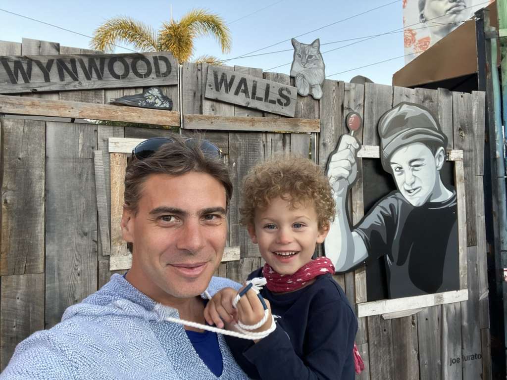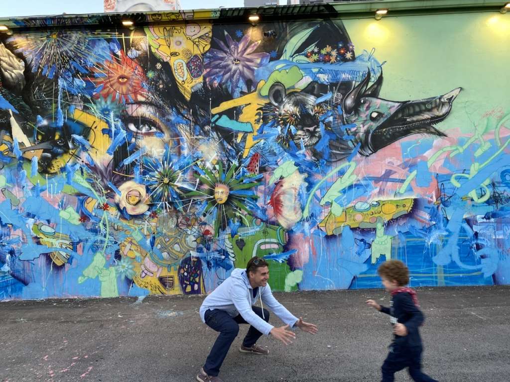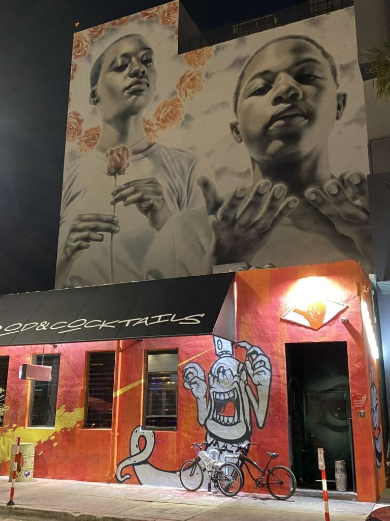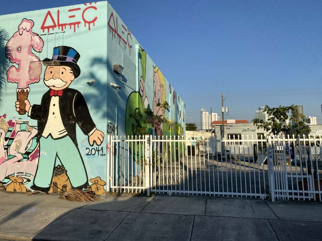 En fin d’après-midi, départ pour le quartier de Wynwood et en son épicentre, ses Wynwood walls. C’est le temple du graffiti à Miami. On va commencer à se faire une petite culture générale sur le sujet à ce rythme. Après avoir fait Buenos aires et Rio, je dois dire que Miami, ca en jète. D’abord parce que tout est à côté. Il y a une profusion au m2 que tu ne retrouves pas dans les deux autres villes. Et les fresques – On est aux US ou bien ? – sont pour la plupart monumentales. Noah adore, et nous aussi. Pour ceux qui comme nous ne raffolent pas des villes, les graffitis c’est un peu notre exutoire en milieu urbain. Jugez plutôt.