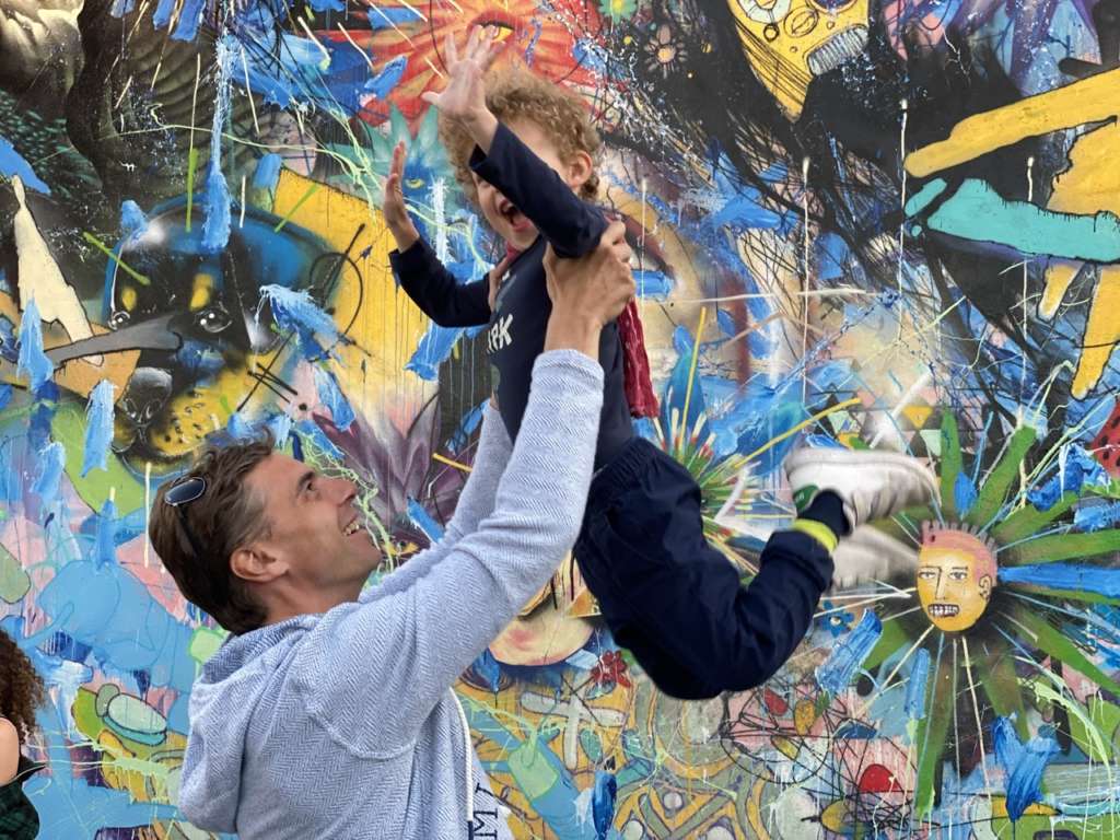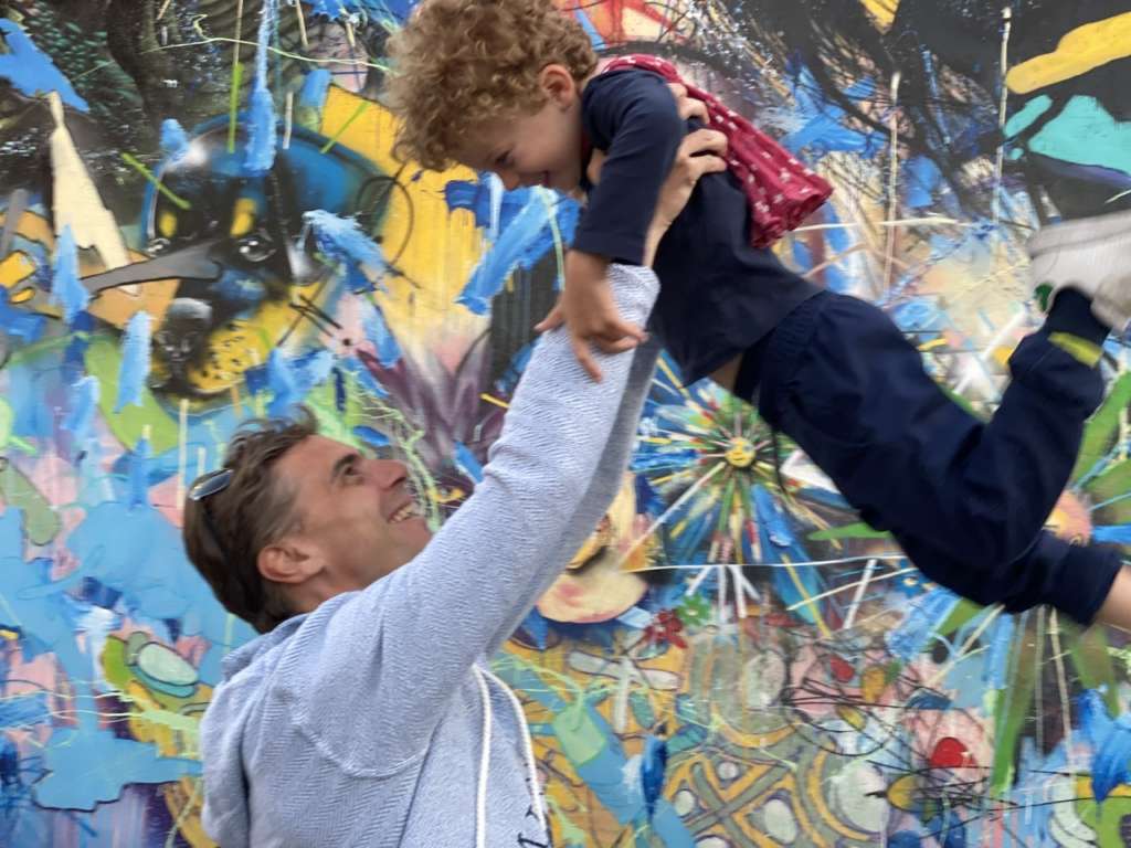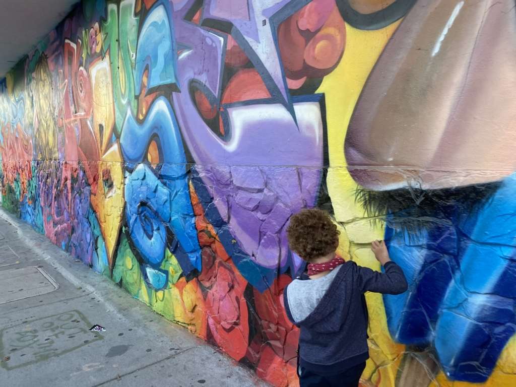 Il se fait tard, on est sur le point de rentrer, puis tout d’un coup, Noah décide qu’après tout lui aussi est un artiste. Il demande à virginie un stylo vert et se met à écrire Noah sur le sol, au milieu du trottoir, puis à faire un énorme graffiti, prenant régulièrement du recul pour contempler son œuvre et y ajouter une nouvelle touche.