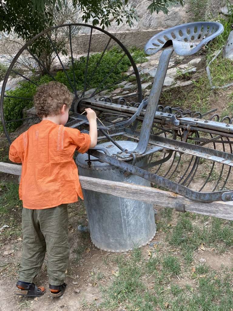 Pendant ce temps, Noah qui est incapable de rester à table plus de 15 minutes et qui a obtenu son bon de sortie après avoir accepté de goûter (et a aimé) son premier empanadas, a jeté son dévolu sur une vieille charrue avec un espèce de réservoir en son centre qui lui fait penser à la machine de Monsieur Mic Mac d’un livre qu’il lit en ce moment. Dans le livre, il met une trompette et une fraise dans la machine et en fait sortir une tromfraise. Là, il fait pareil en mettant des cailloux avec des branchages pour en faire des branchoux.