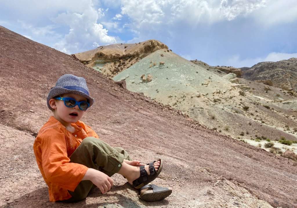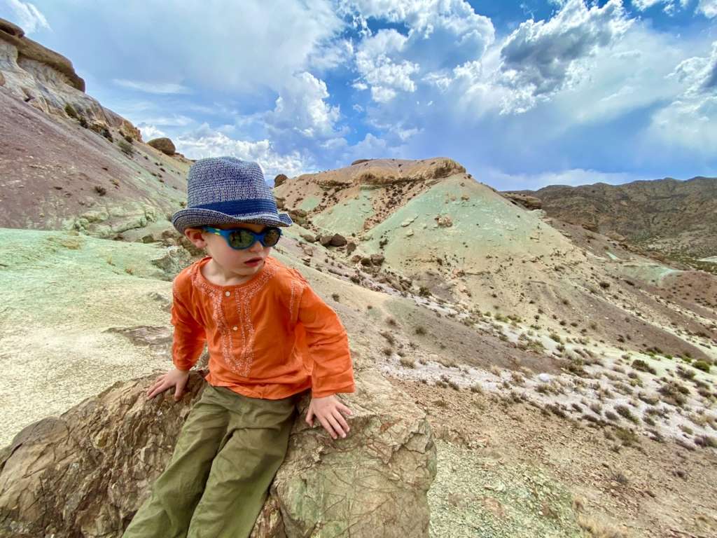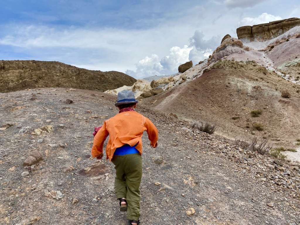 Noah qui venait juste de se réveiller et qui au début ne voulait pas sortir de la voiture change subitement d’avis et d’un pas décidé se met en tête d’escalader la montagne sous un soleil de plomb. Le temps de monter la cinquantaine de mètres pour avoir un premier point de vue, on entend gronder l’orage. Dans un endroit ou il ne pleut paraît-il jamais, on vient le seul jour où l’orage approche à grands pas. Point positif, la température chute drastiquement et le contraste avec les nuages est encore plus intéressant.