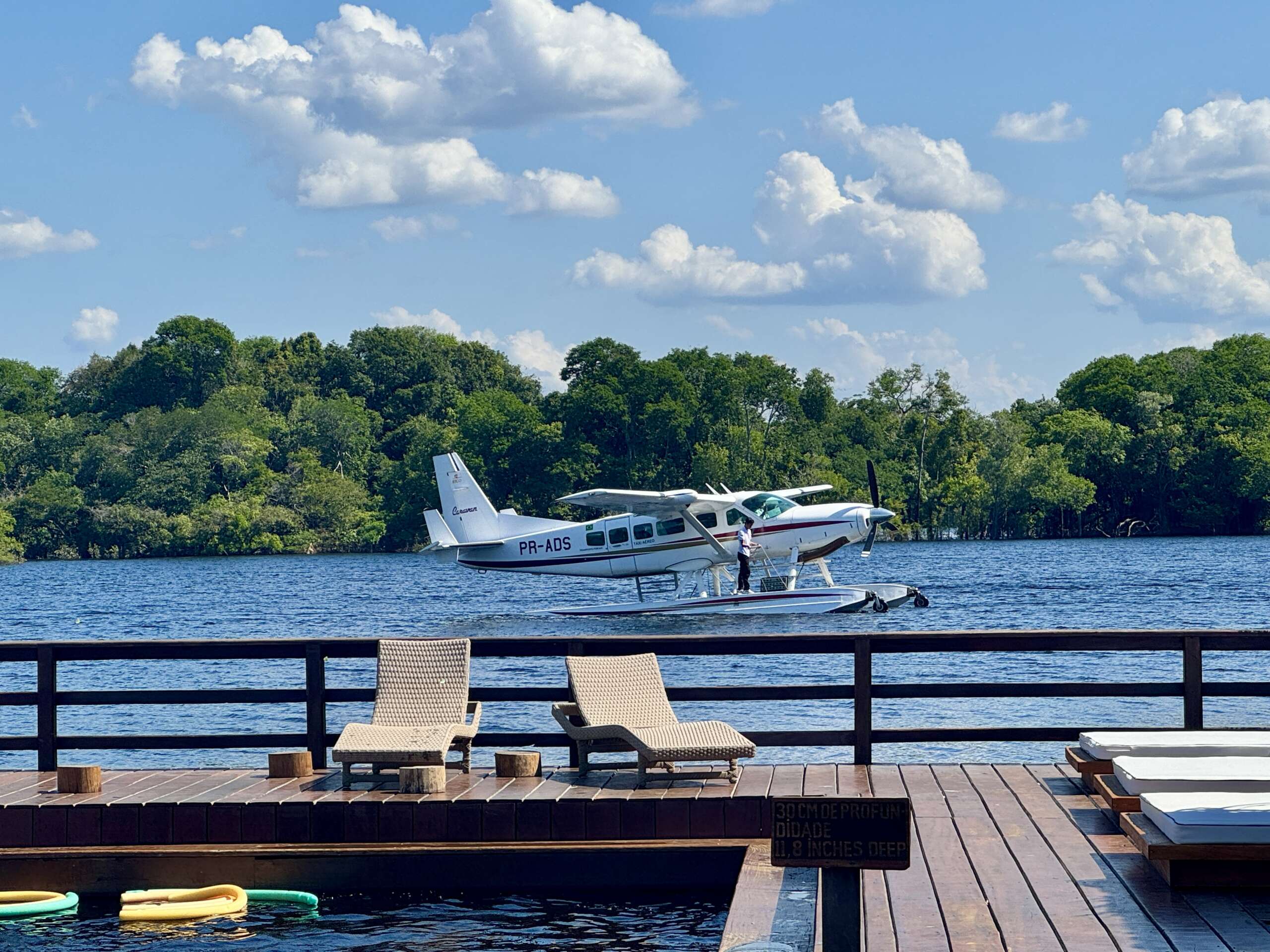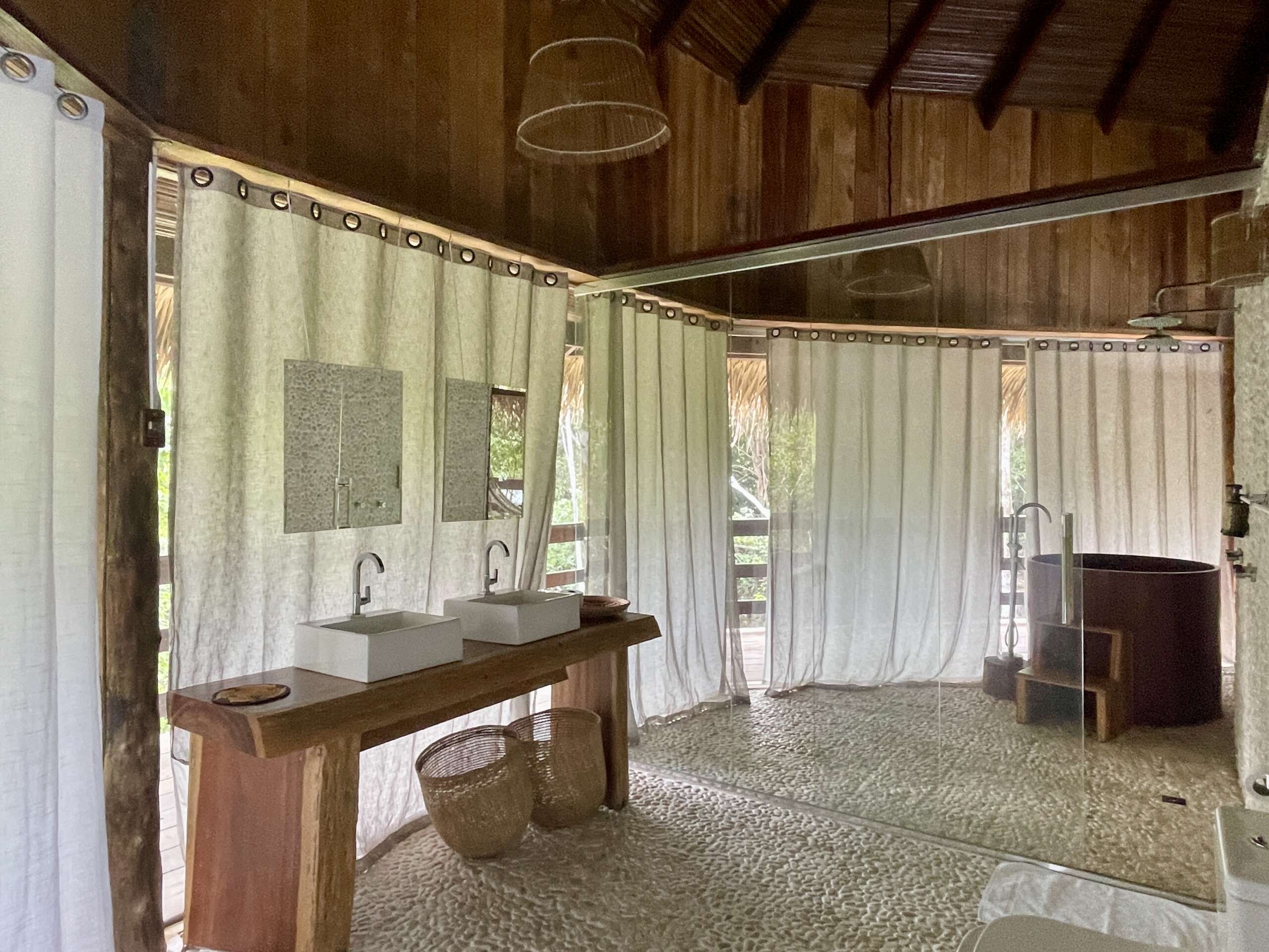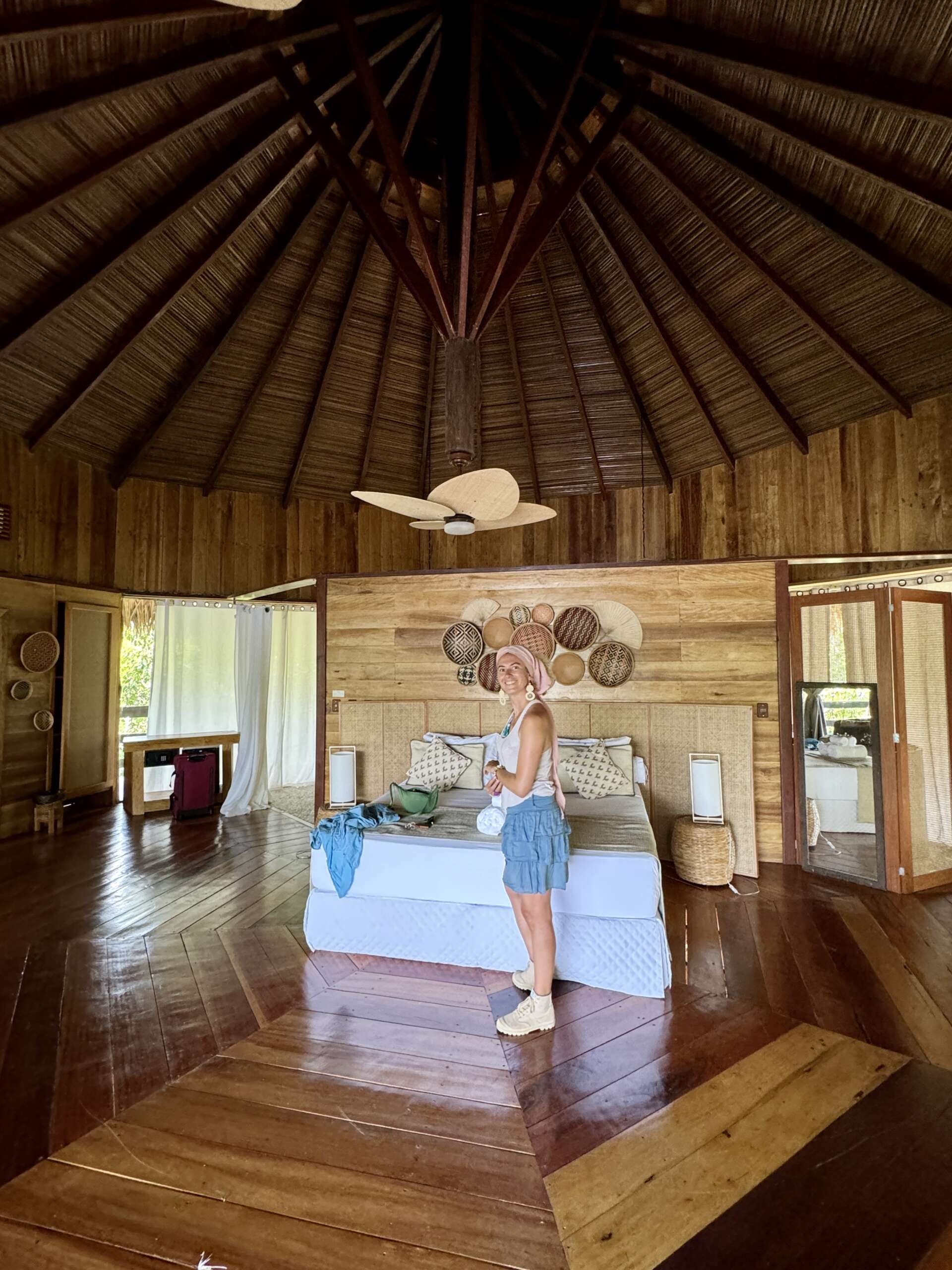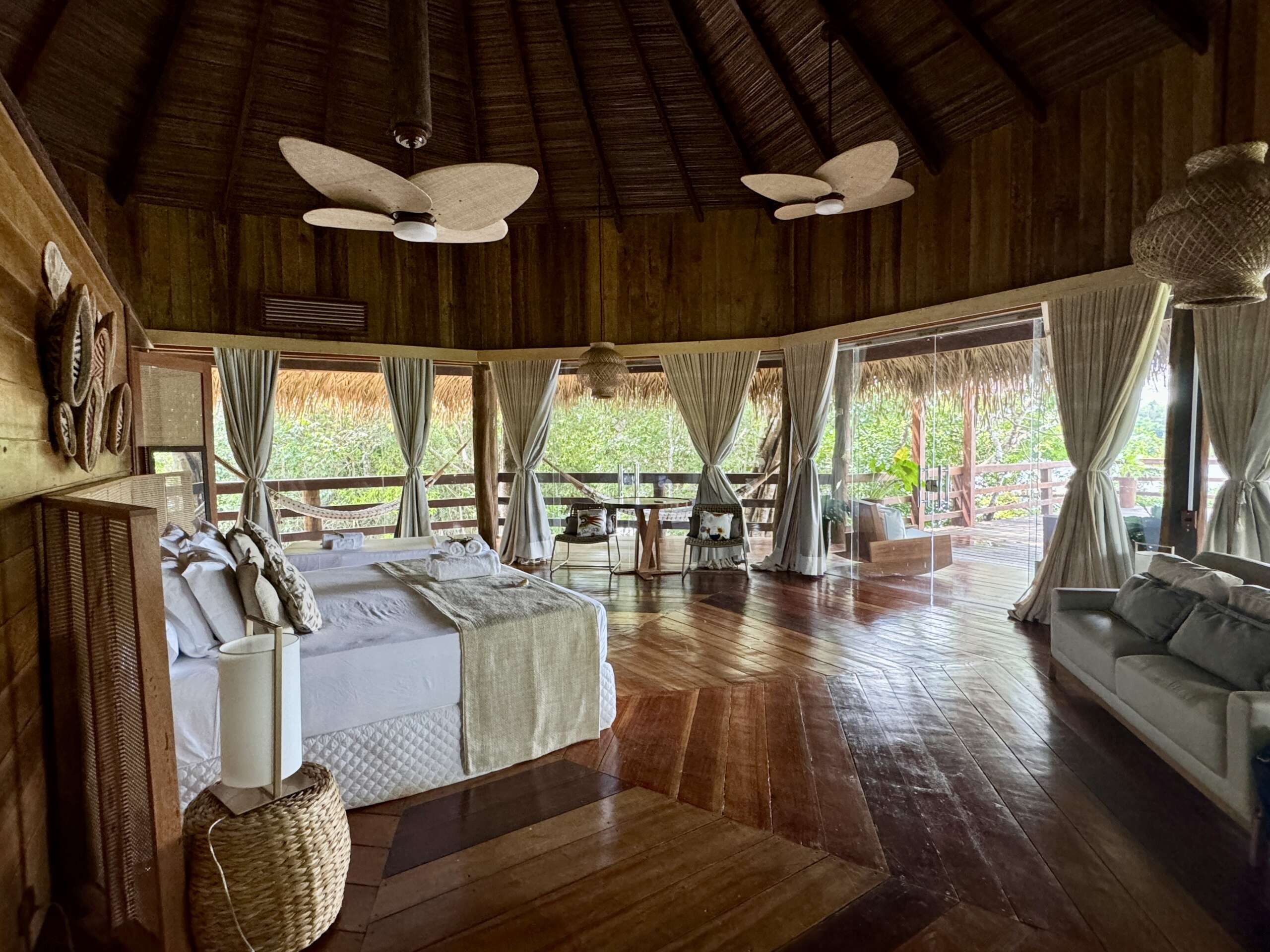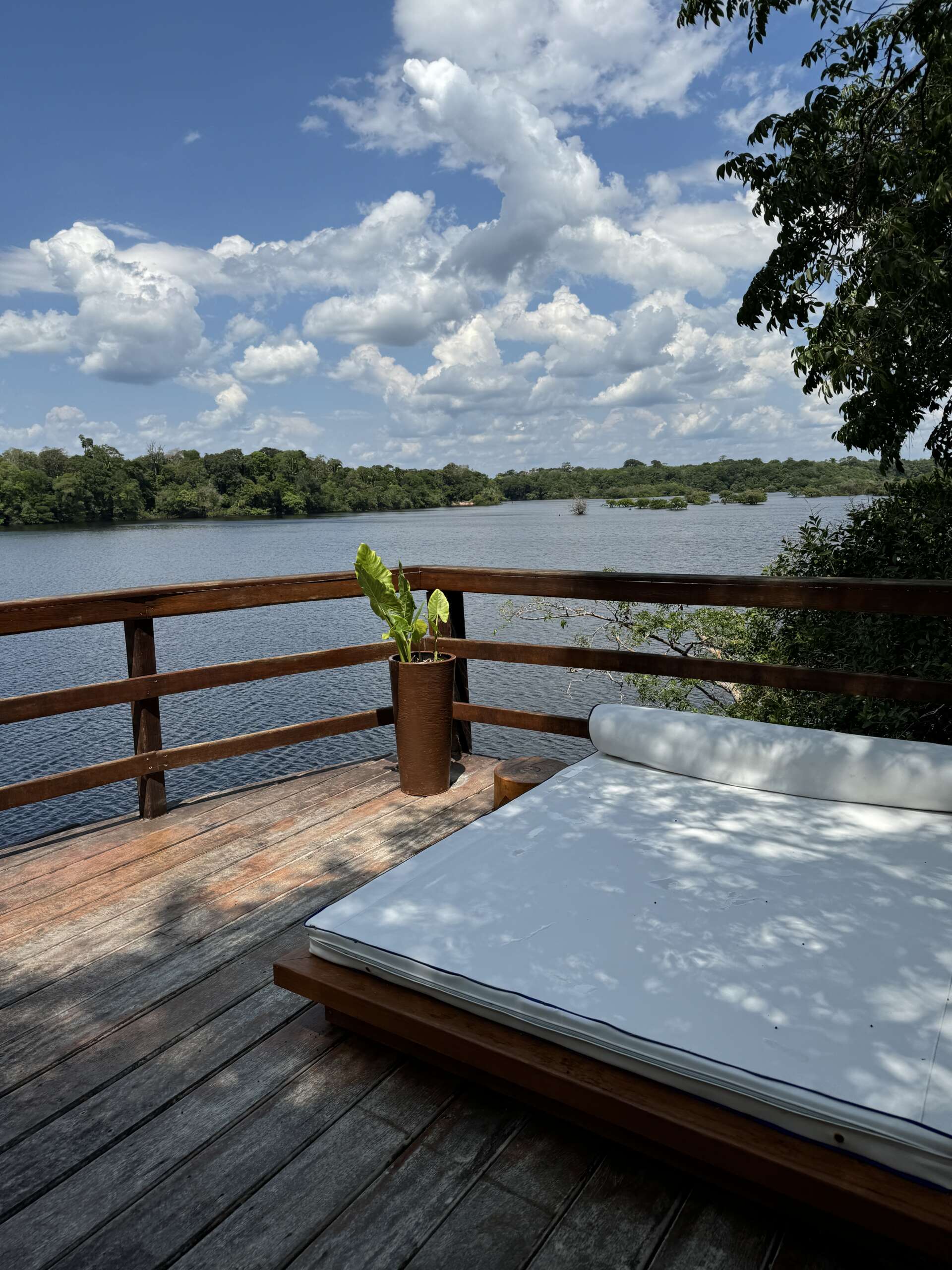Pour le lodge lui-même, Noah vous le fait découvrir en vidéo. Baies vitrées à 360, 8 mètres de hauteur sous plafond, terrasse filante tout autour avec des hamacs, lits et douche extérieure, et énorme terrasse en avancée sur le fleuve… Comme dirait Noah, Ouahhhh !