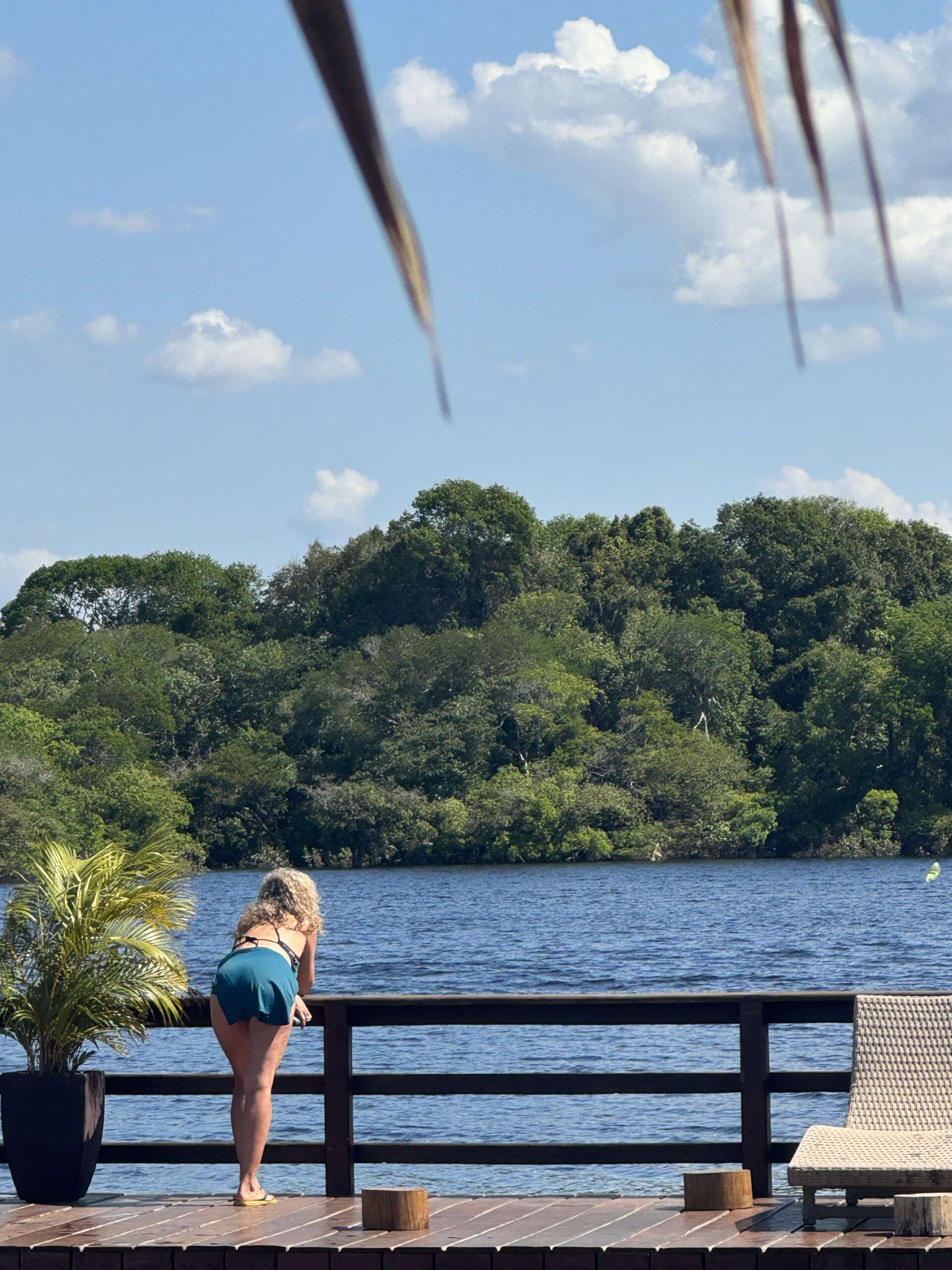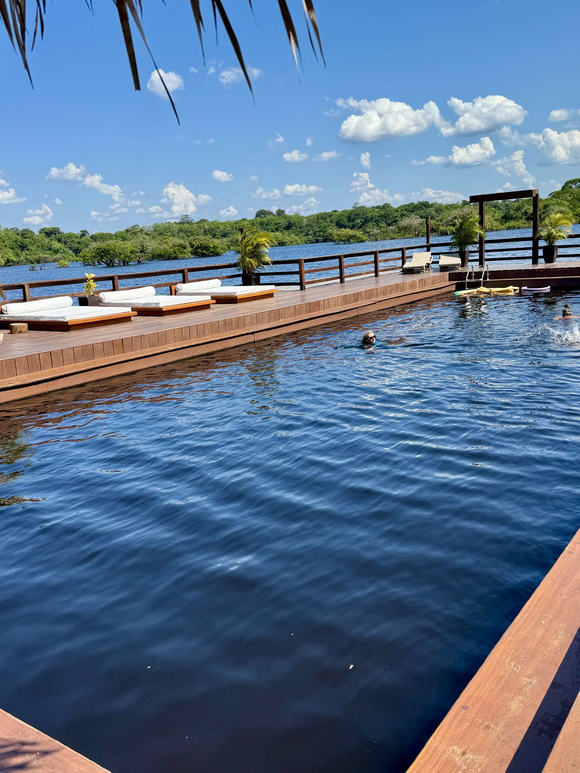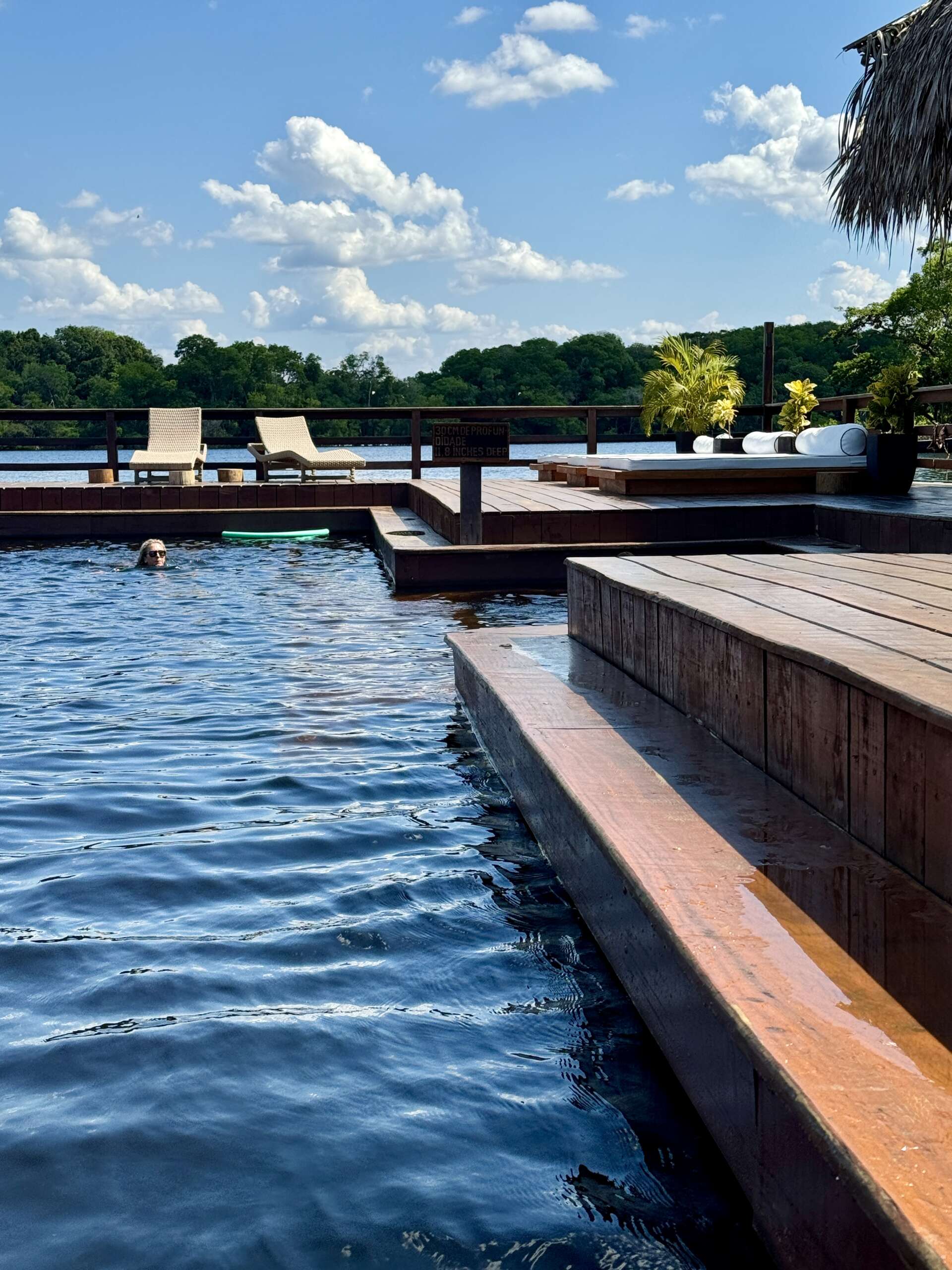 Arrivés au Juma lodge, belle surprise. Le lodge n’a rien à envier aux plus beaux lodges africains. On arrive par le fleuve et tout l’hôtel est perdu dans la jungle amazonienne. Le lodge est entièrement construit sur pilotis une dizaine de mètres au-dessus du fleuve et totalement intégré dans la végétation. Vue panoramique des différentes terrasses sur le fleuve. Même la piscine est top (c’est dire, je ne m’attarde que rarement sur ces détails). Tout en bois, c’est en fait une structure qui est posé dans le fleuve. Il y a juste sous la structure des filets pour empêcher piranhas et autres caïmans de s’inviter dans la piscine, mais sinon on est en eau libre. Détail marrant, des poissons assez petits rentrent parfois par les mailles du filets, puis grandissent et ne peuvent pas ressortir, donc on trouve des poissons dans la piscine de temps en temps. Après notre déjeuner on y passera une bonne heure et c’est vraiment chouette.