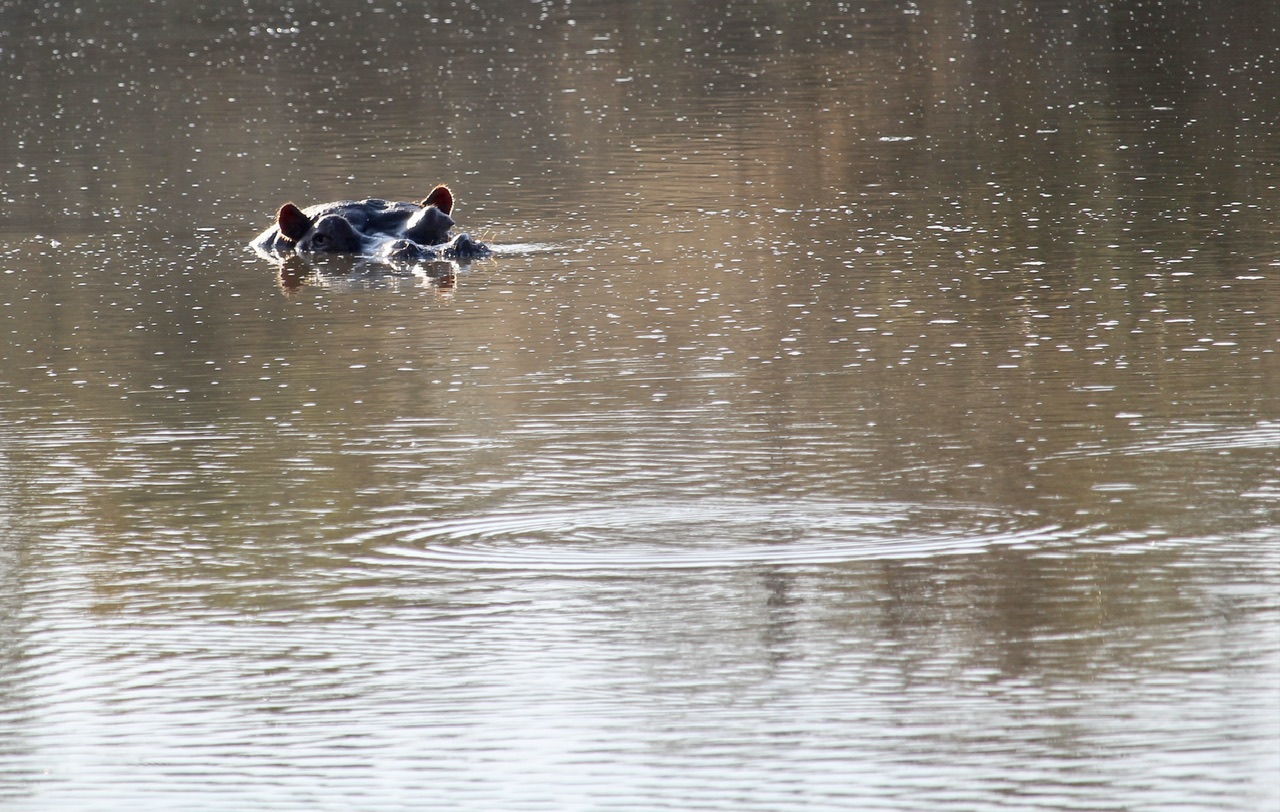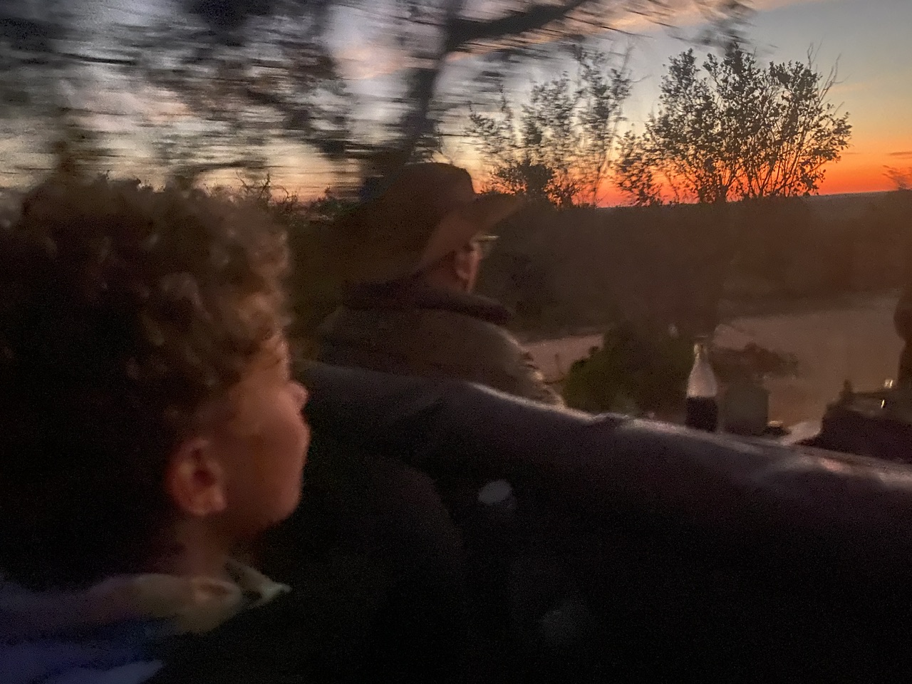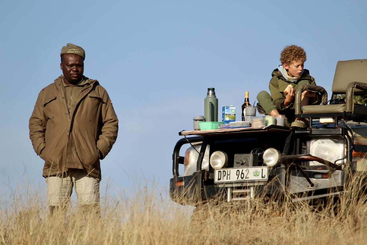 Le lever du soleil est rouge comme le coucher du soleil, mais cela dure beaucoup moins longtemps. Le soleil monte vite et avec lui la température redevient clémente. Au surplomb d’un plan d’eau on s’arrête pour se faire une petite pause-café. L’occasion d’observer quelques hippopotames au loin et pour Noah de lier connaissance avec Hendrick et Victor en crapahutant sur la jeep.