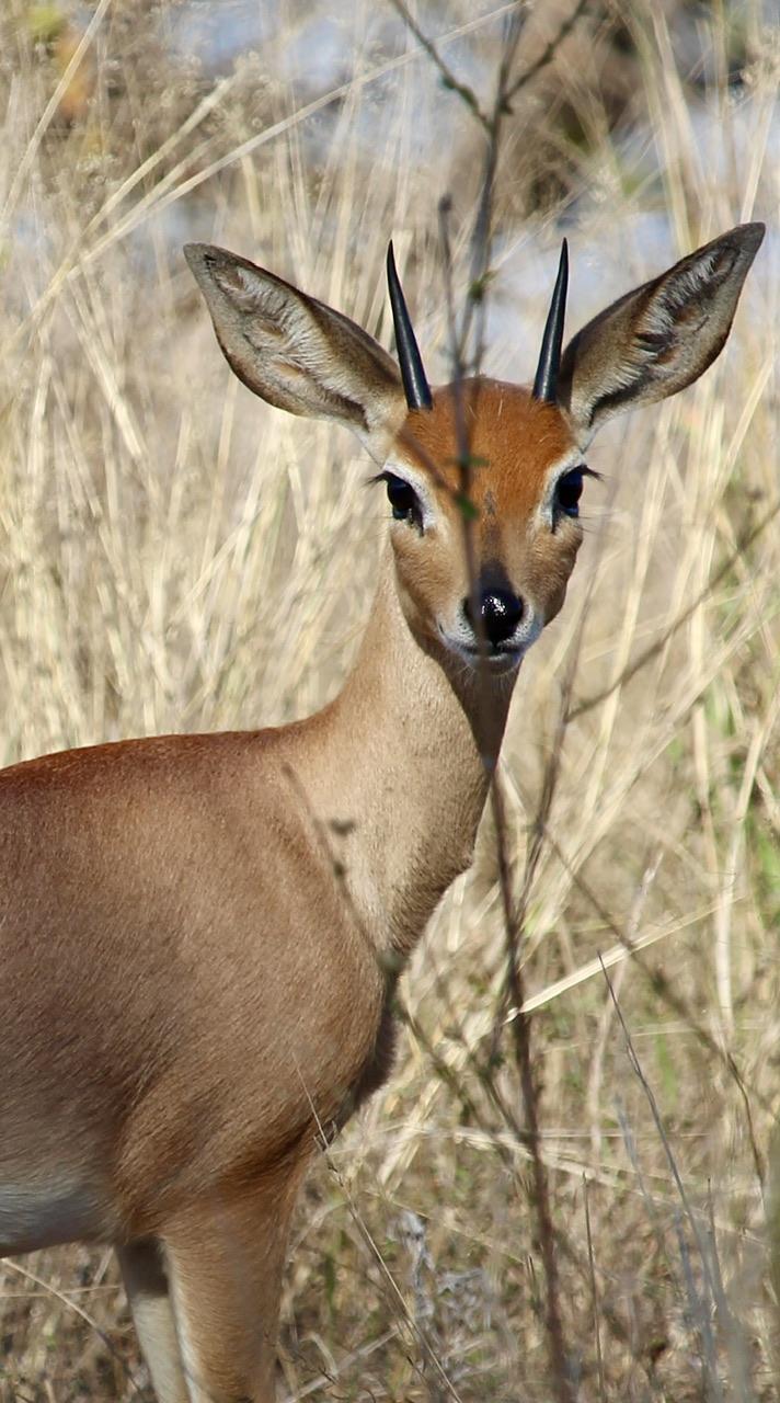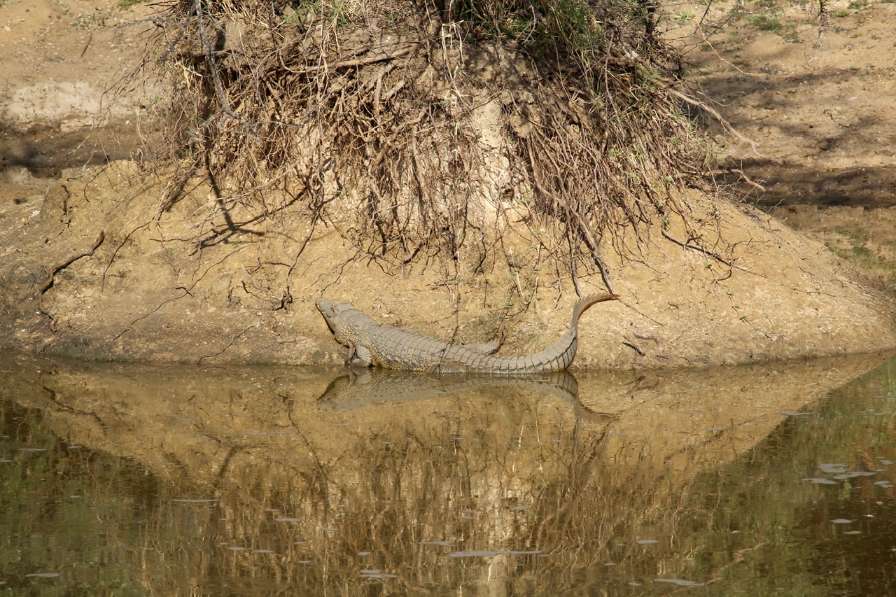Oups il est 8h20. Rien de problématique en tant que tel pour nous, mais avec tout cela le temps a filé et Tom et Marta ont un avion à prendre et doivent être à 9h au lodge et le rhino nous a passablement éloigné du lodge. Hendrick file à une allure soutenue qui ravie Noah, mais s’attardera tout de même pour prendre en photo un steenbok. J’adore ces antilopes, on dirait qu’elles viennent de sortir d’une séance de maquillage tellement elles ont les traits fins et les contours des yeux parfaitement dessinés. Puis, à un autre point d’eau on s’arrêtera pour observer notre premier crocodile qui lézarde au soleil en compagnie de quelques hippos.