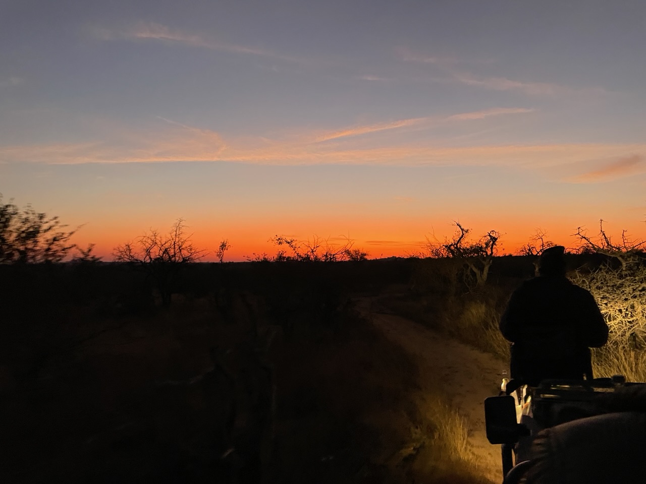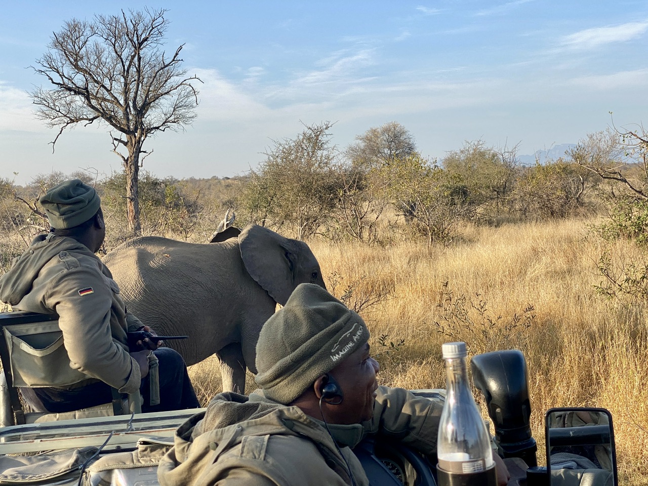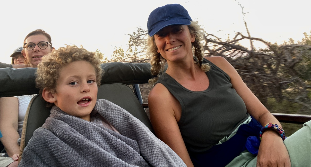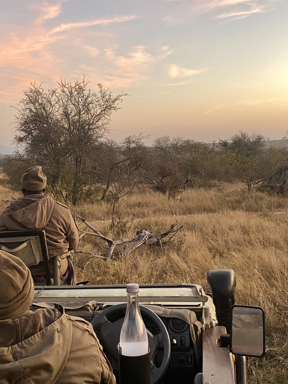 10 petites minutes plus tard passées à habiller Noah sous la couette en le faisant rigoler et on est fin prêt pour une petite boisson chaude et faire notre safari matinal. Dehors il fait encore nuit. On se met dans la voiture et comble du luxe, au pilou-pilou de la veille ils ajoutent une petite bouillotte pour chacun que Noah s’empresse de mettre sur son bidou avant qu’on le transforme en bédoin du désert avec la couverture.