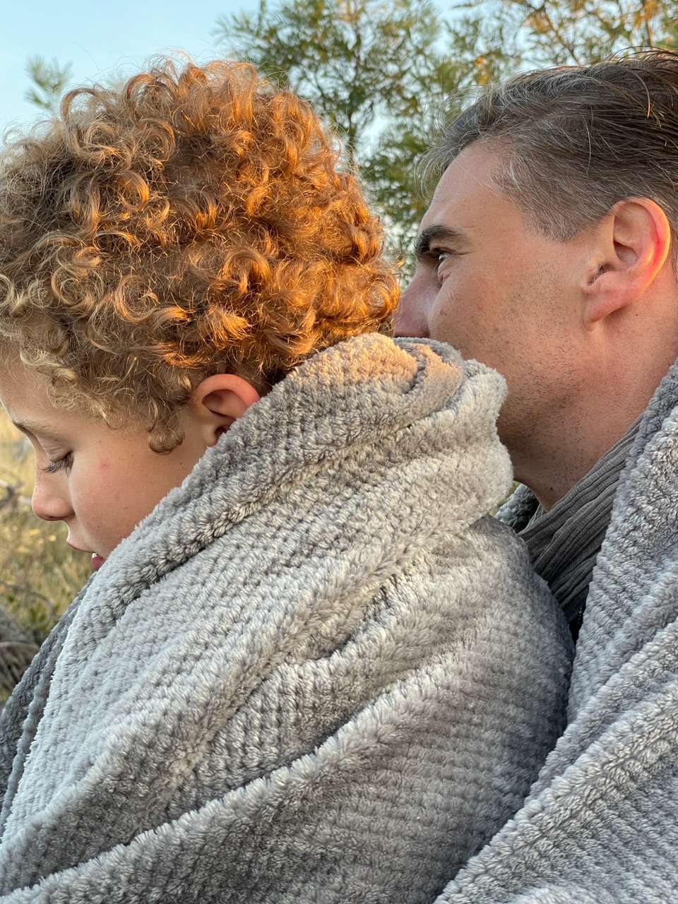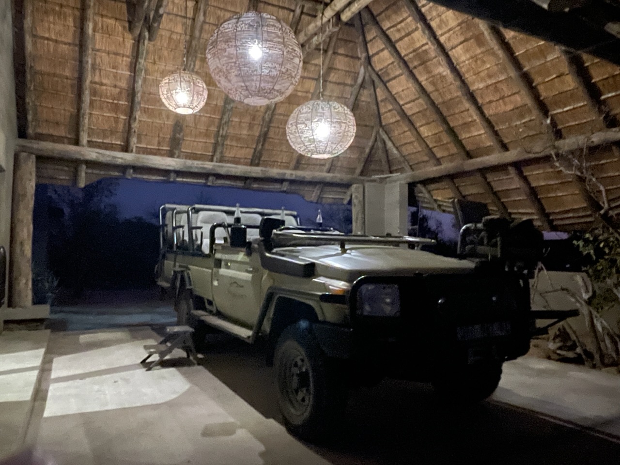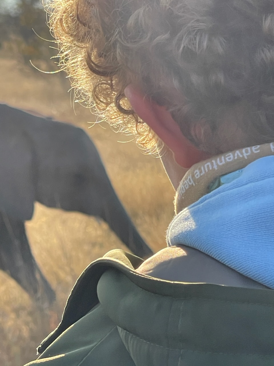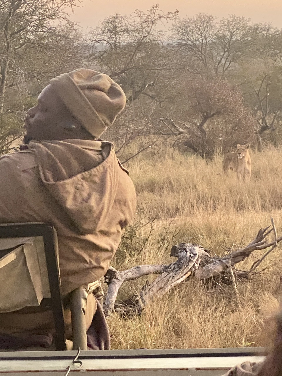 10 petites minutes plus tard passées à habiller Noah sous la couette en le faisant rigoler et on est fin prêt pour une petite boisson chaude et faire notre safari matinal. Dehors il fait encore nuit. On se met dans la voiture et comble du luxe, au pilou-pilou de la veille ils ajoutent une petite bouillotte pour chacun que Noah s’empresse de mettre sur son bidou avant qu’on le transforme en bédoin du désert avec la couverture.