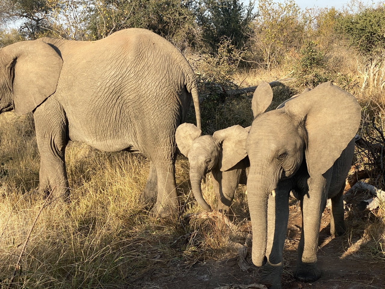 Ce matin on a eu la chance de les trouver. On est littéralement dessus par hasard, donc pendant 20 minutes on va les suivre -seuls au monde – tandis qu’ils se déplaçent progressivement vers les buffles. Le temps d’assister à de longues séances de câlinothérapie entre les petits et leurs mamans. Au moment de repartir, Hendrick informe les autres jeeps. C’est un bon système, comme cela on observe les animaux au calme et quand on part on donne une chance aux autres de les voir.