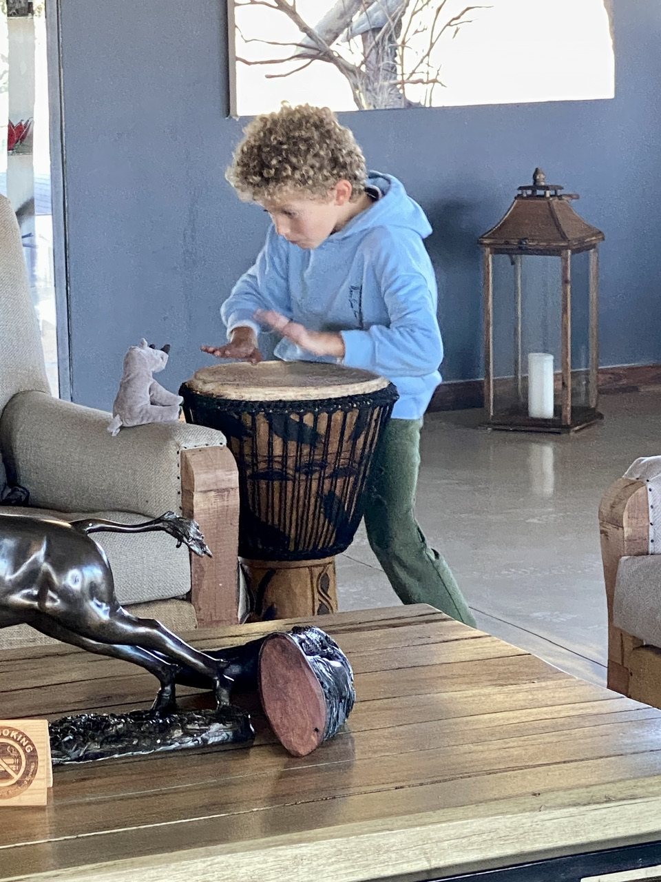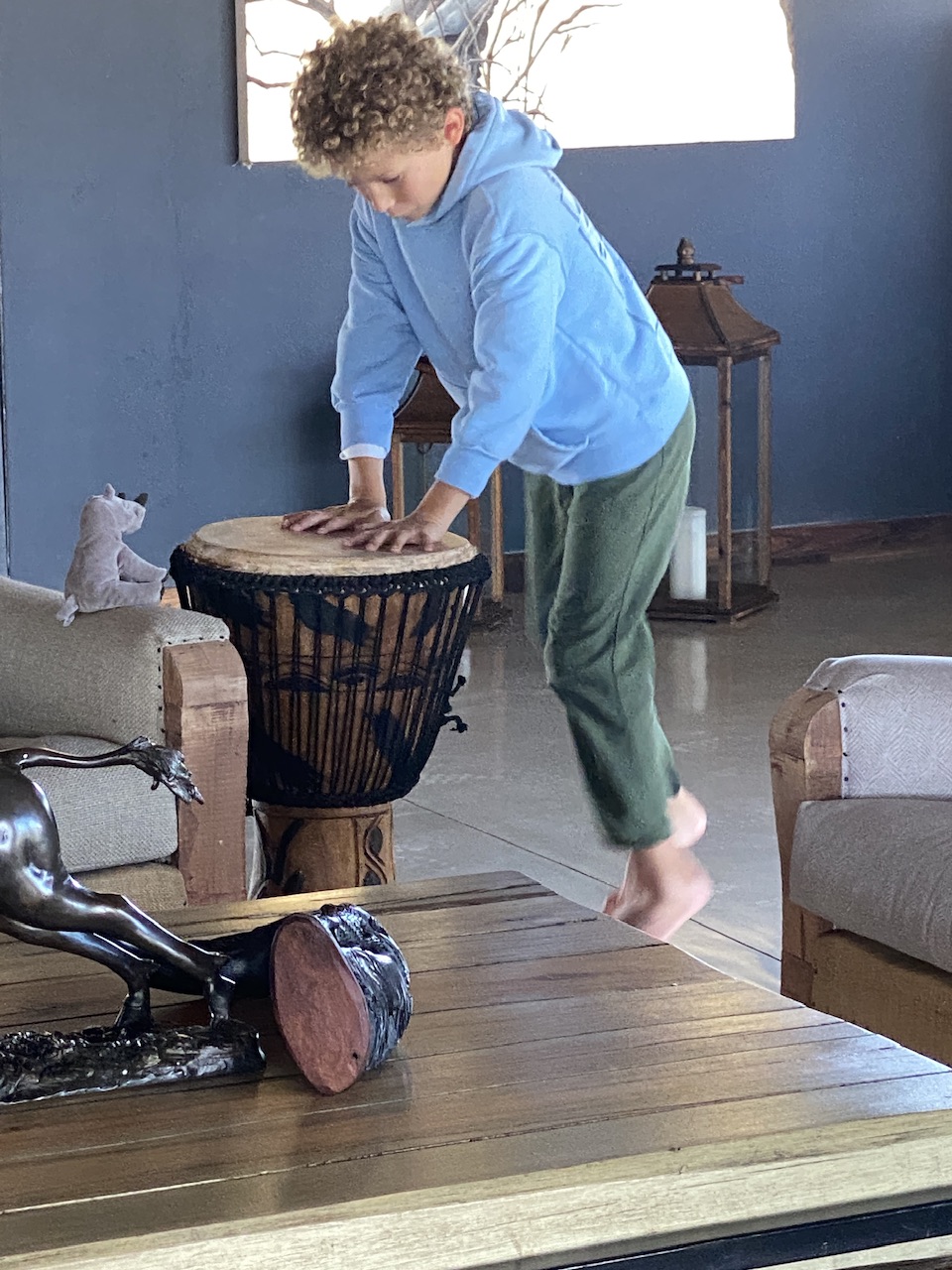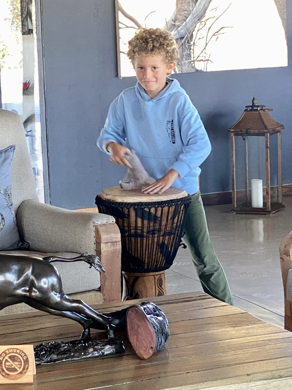 Après un bon petit dej au lodge, il est de temps de faire nos adieux à Tom et Martha. Noah se lance dans un tam tam endiablé avant d’aller jeter un oeil à la piscine qui est glaciale.
