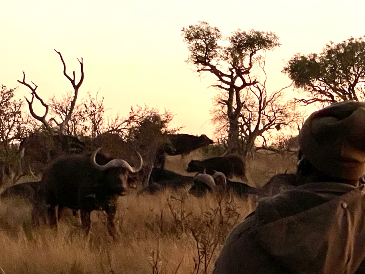 Contrairement à hier, on n’a pas fait 5 minutes de voiture qu’on tombe sur une horde de buffles, probablement pas loin d‘une centaine, alors que le soleil n’est pas encore levé. Noah qui compte depuis son arrivée le nombre de fois où il a vu des animaux en est à 39.