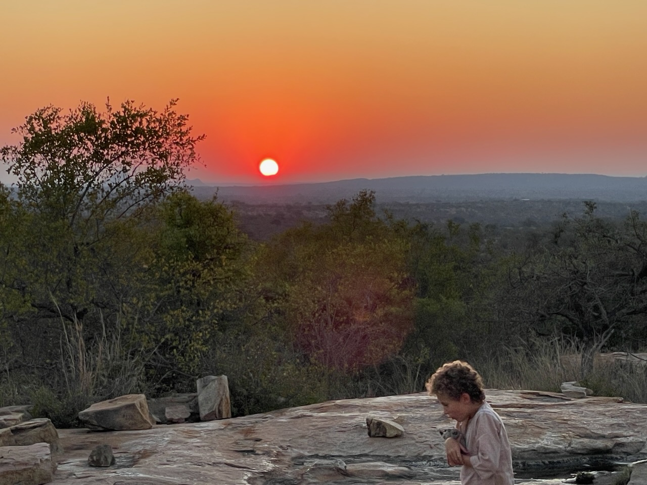 Après avoir vu nos premiers zèbres (et oui seulement maintenant car on n’est pas dans une zone de plaine), on arrive en haut d’un petit promontoire rocheux pour observer le coucher du soleil avec un Coca pour Noah, une Ginger ale pour Virginie et un Chardonnay pour moi. Il y a pire comme fin de journée.