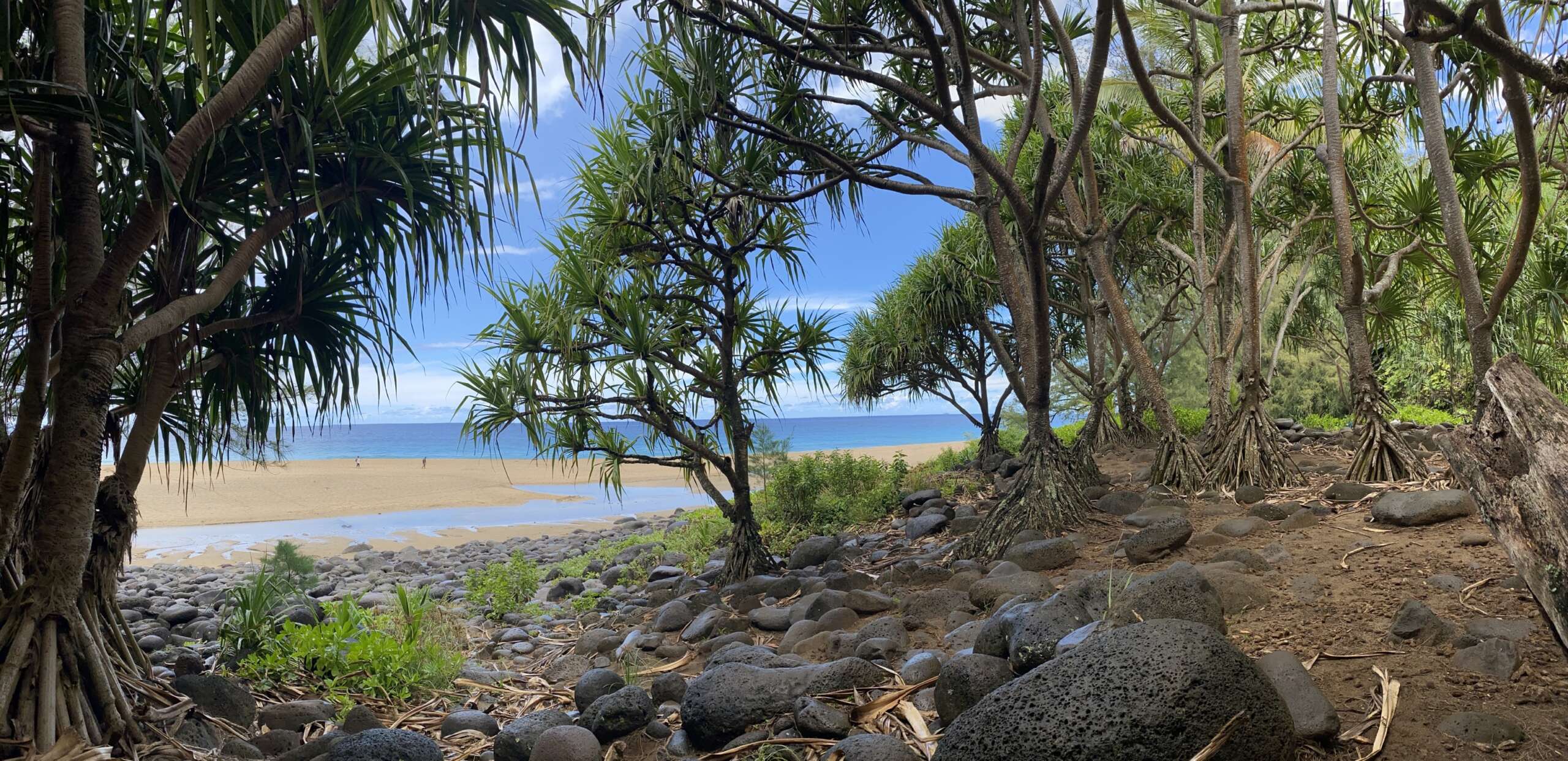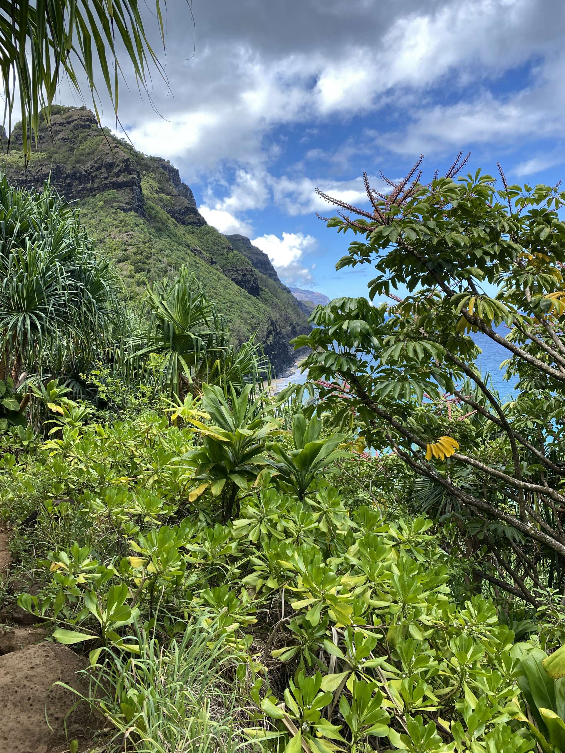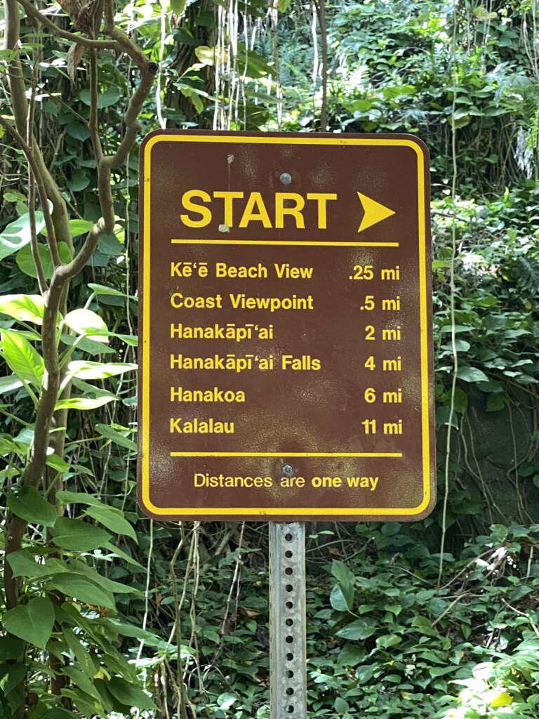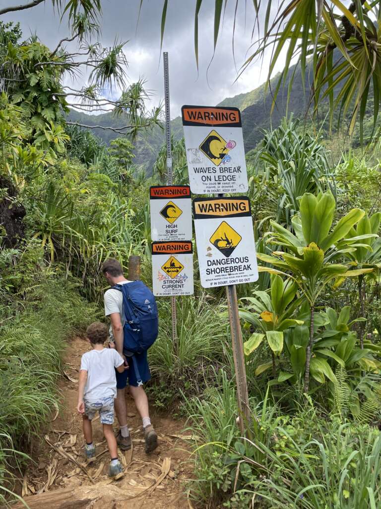 Après un rapide briefing d’un ranger sur la dangerosité du trail qu’on n’écoute que d’une oreille parce que depuis qu’on est là on ne fait que voir des panneaux qui nous annoncent des morts horribles par noyade ou écrasement de rocher chaque fois qu’on randonne, on prend la direction de la plage de Ke ‘e d’où un panneau annonce enfin le départ du Kalau trail.