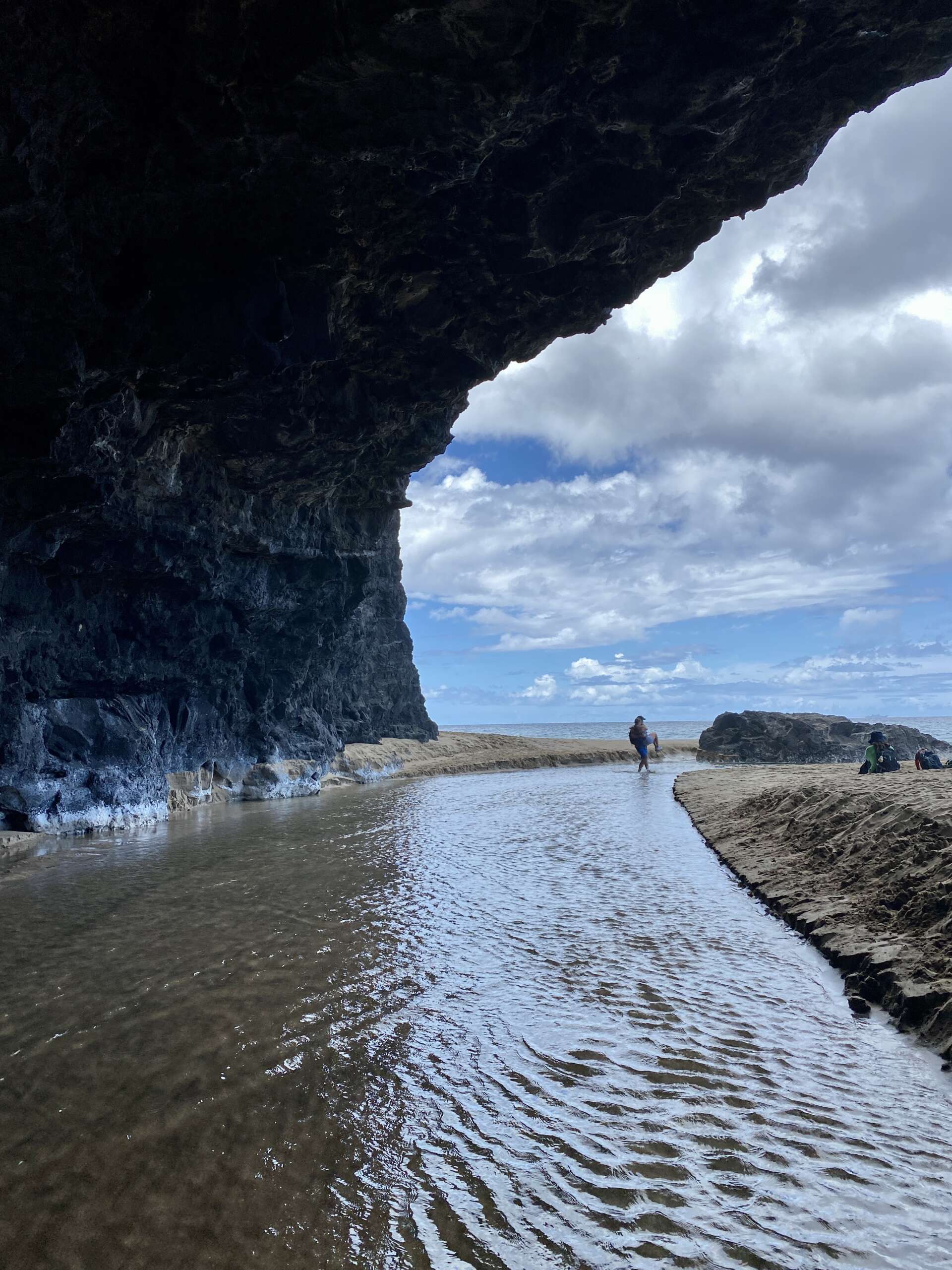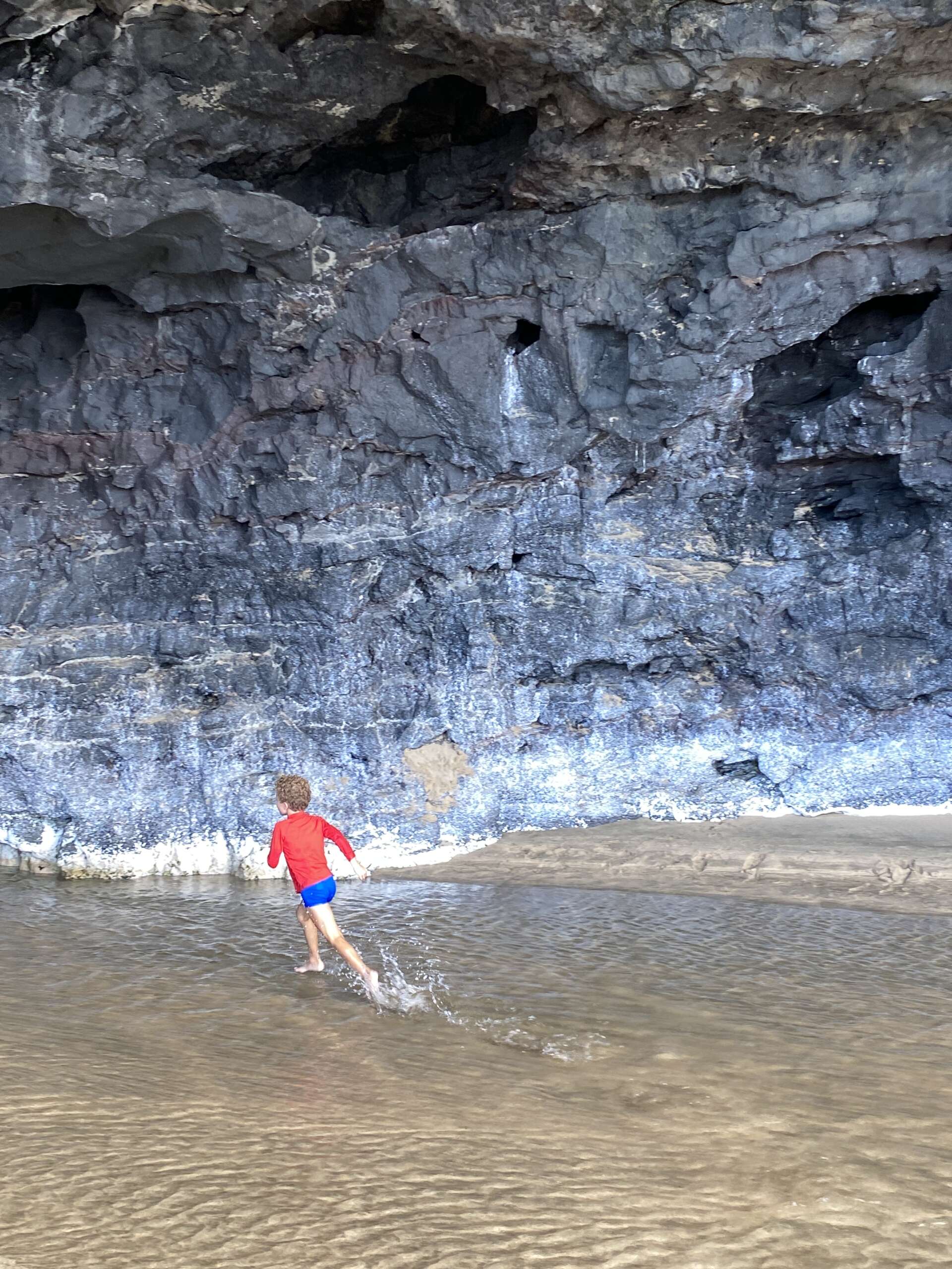 Quand Noah découvre qu’il peut pénétrer par l’interstice de la grotte de moins de 1m de haut en barbotant dans la rivière et ressortir 30 mètres plus loin de l’autre côté de la grotte (qui entre temps fait désormais 20 mètres de haut) pour déboucher sur la mer, il exulte (4ème kif). D’autant qu’à cet endroit deux rochers encadrent un bras de terre et que d’énormes vagues non seulement s’écrasent dessus mais en plus créent régulièrement une contre vague qui remonte le cour de la rivière jusque dans la grotte (5ème kif).