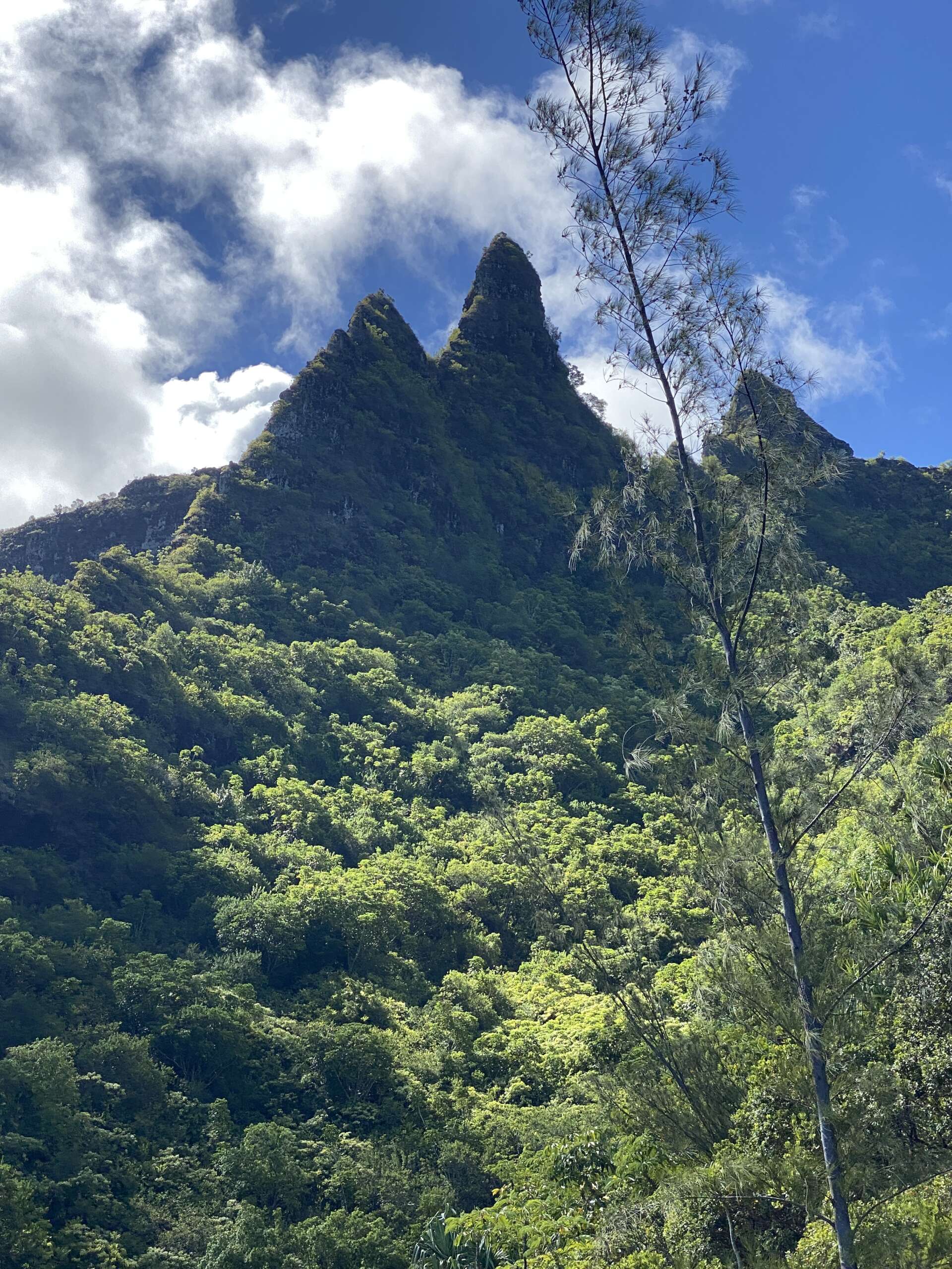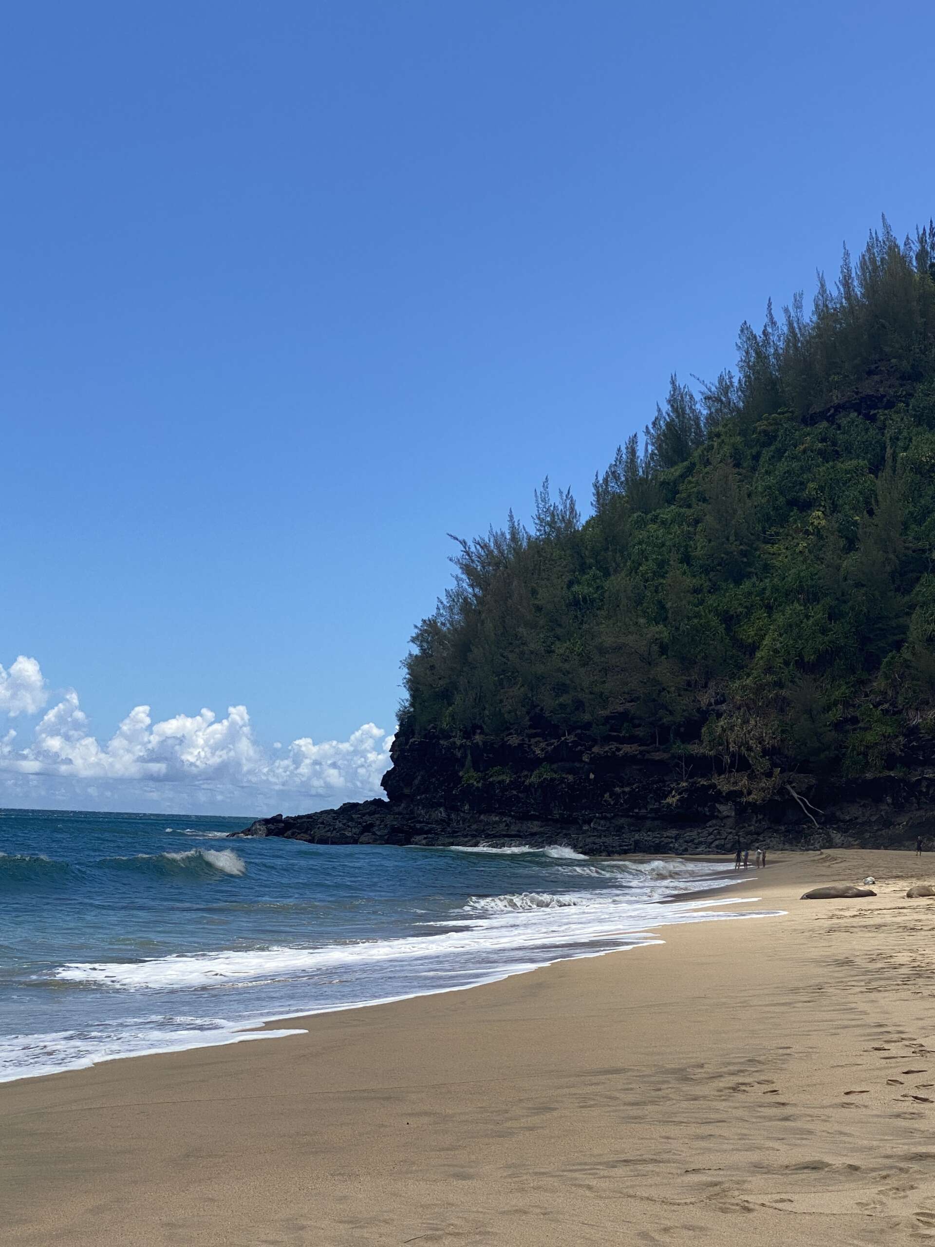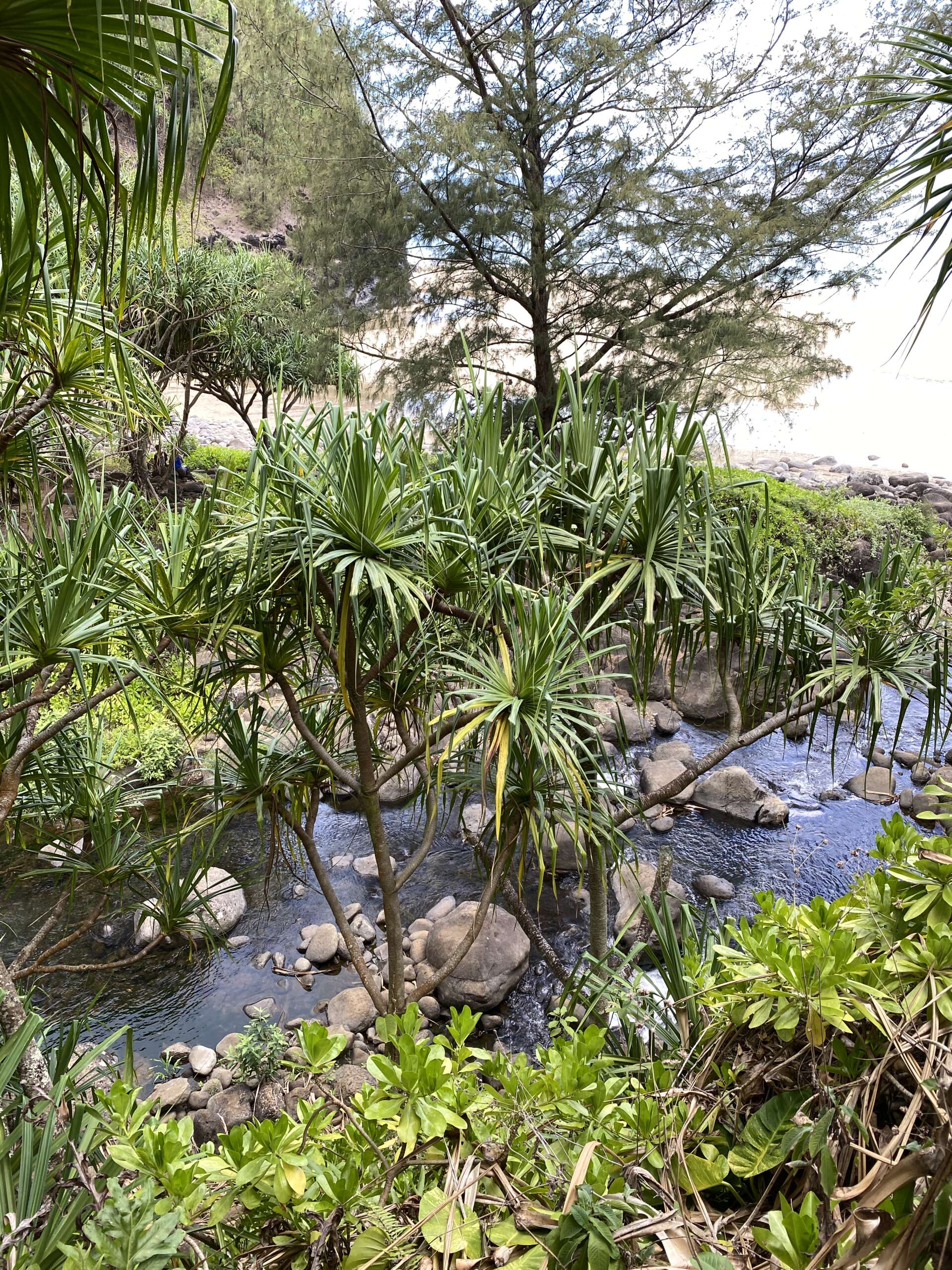 2H plus tard à monter et descendre pour franchir chaque ridge, nous voici arrivés sur la plage de Anakapi. On pourrait doubler la mise et aller jusqu’à une cascade, mais ça passe la rando à 8h de marche. Le temps devient nuageux, voir potentiellement pluvieux donc on décide de s’arrêter là et de profiter plutôt de l’endroit que de tout faire au pas de course en mode exploit sportif.