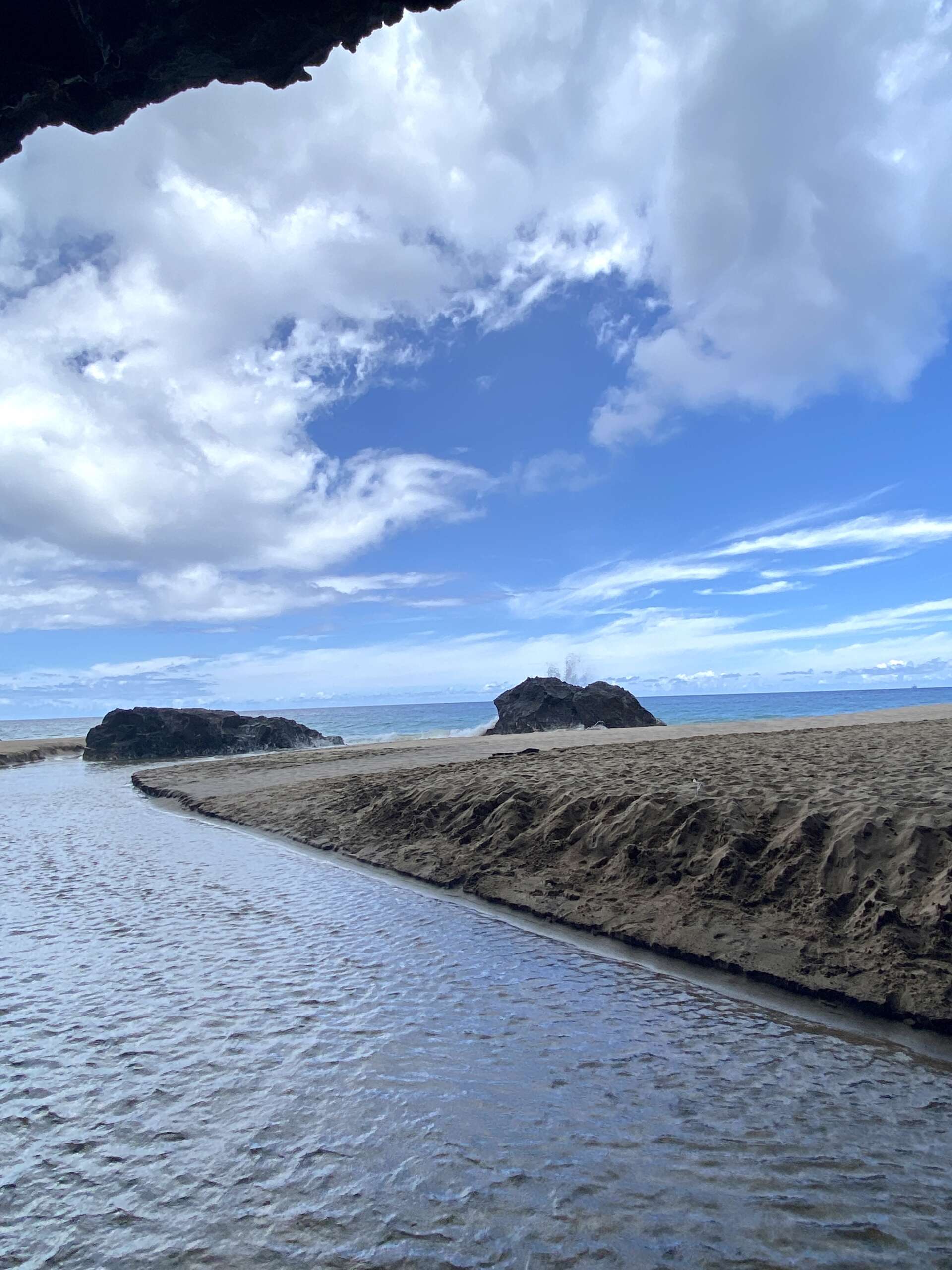 Je m’explique. Pour atteindre la plage, on longe d’abord une petite rivière qui oblige de crapahuter dans les rochers (1er kif). Arrivée à la plage, celle-ci oblique alors à 90 degrés une dizaine de mètres à l’intérieur de la plage créant un cours d’eau – gelé – naturel pour patauger dedans voir faire des châteaux de part et d’autre (2ème kif). Puis 100 mètres plus loin, la rivière arrive en bord d’un ridge qui délimite la plage et plonge sous-celui-ci dans une anfractuosité de la roche (3ème kif).