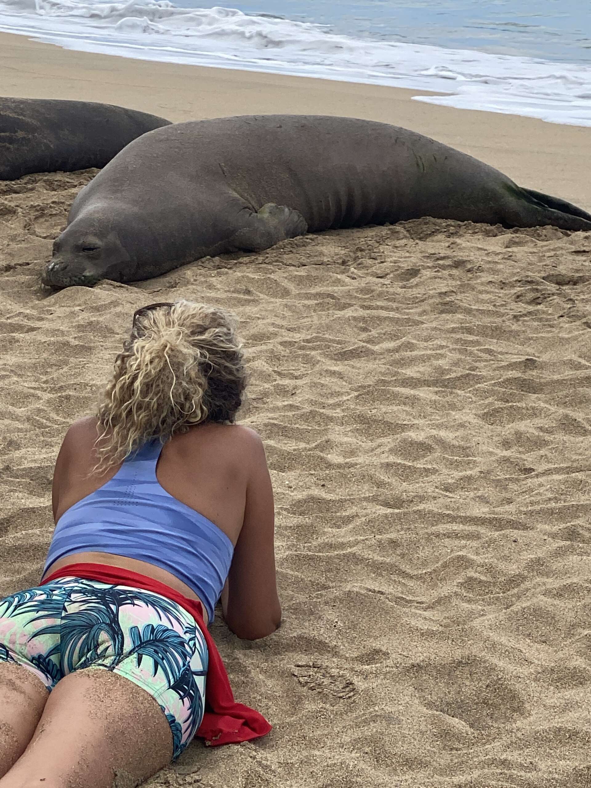 Et quand j’y arrive enfin et qu’on se met à traverser la plage, on se rend compte qu’en plein milieu de la plage, près de l’eau, ce que tout le monde prend pour 2 rochers sont en fait 2 énormes phoques qui se prélassent au soleil.