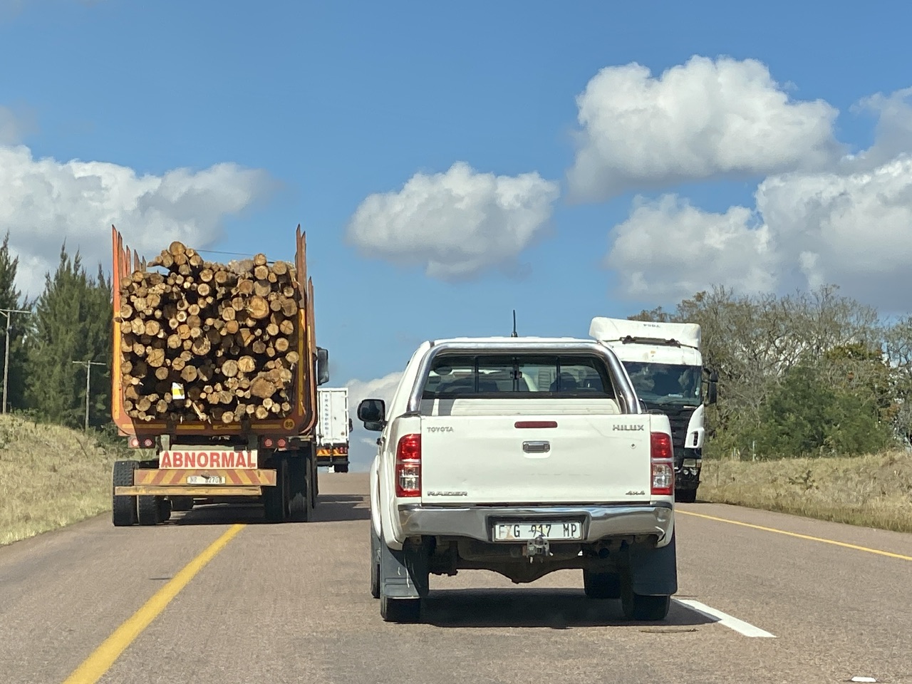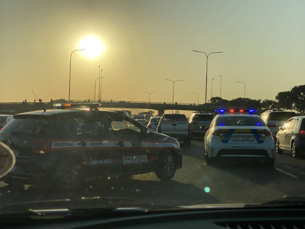 Mais on n’a pas vraiment le temps de pester contre le policier. En effet, conduire en Afrique du Sud s’avère une sinécure à côté de la Sicile – qui était pourtant une sorte d’Everest de la mauvaise conduite à équivalence avec le Bouthan. Ici, les voitures qui te doublent sur la bande d’arrêt d’urgence, se font elles même doubler par celles qui passent sur l’herbe. Autour de nous, les gens sont entassés à 10 par voiture, et pour couronner le tout, on voit passer à peu près tous les types de véhicules de police et de gendarmerie qui nous doublent (la police normale, la brigade de sécurité, la police de la route, du métro et même à la fin un camion du genre de la BRI). Enfin,  nous doublent quand les autres conducteurs les laissent passer car malgré les gyrophares et les sirènes, tout le monde a l’air de s’en foutre mais alors d’une force… Et toute cette armada armée se dirige devant nous pour mater la rébellion. Parfait !